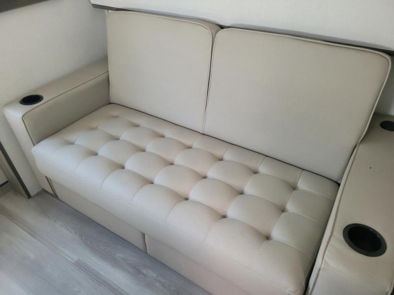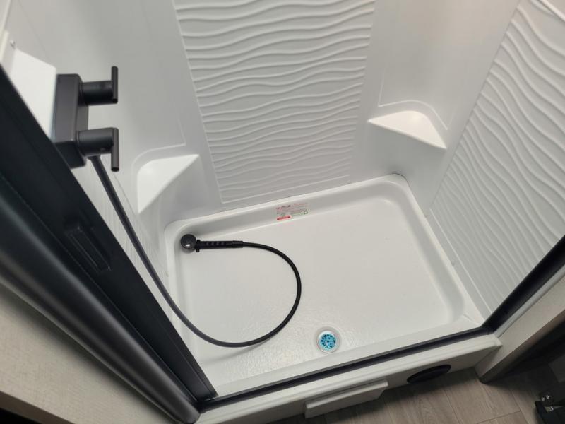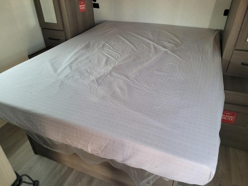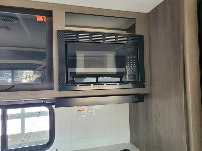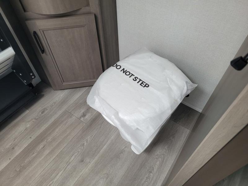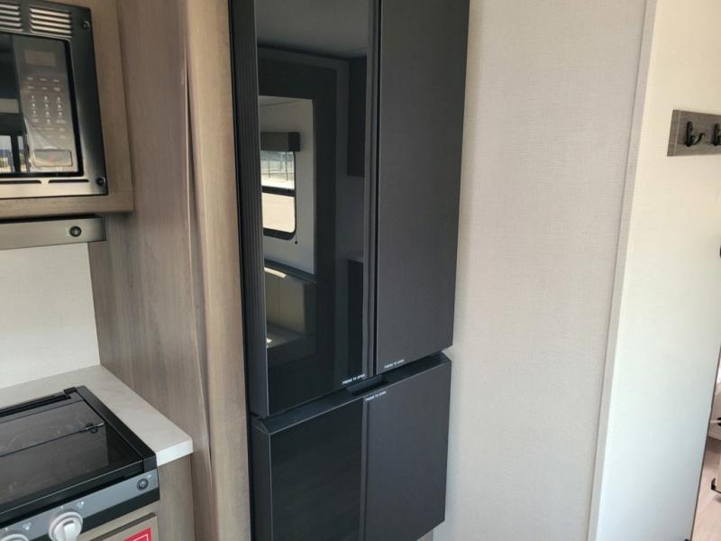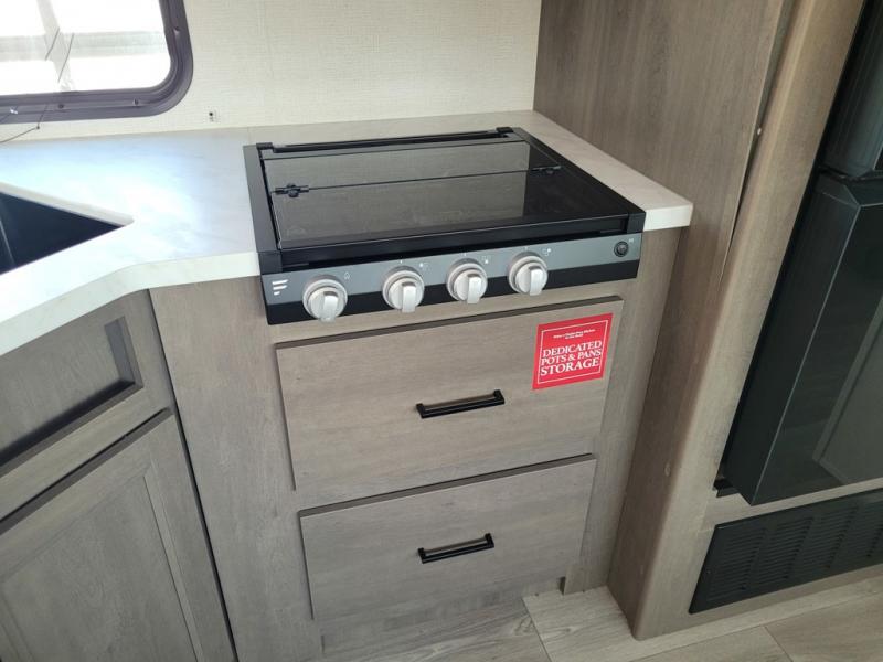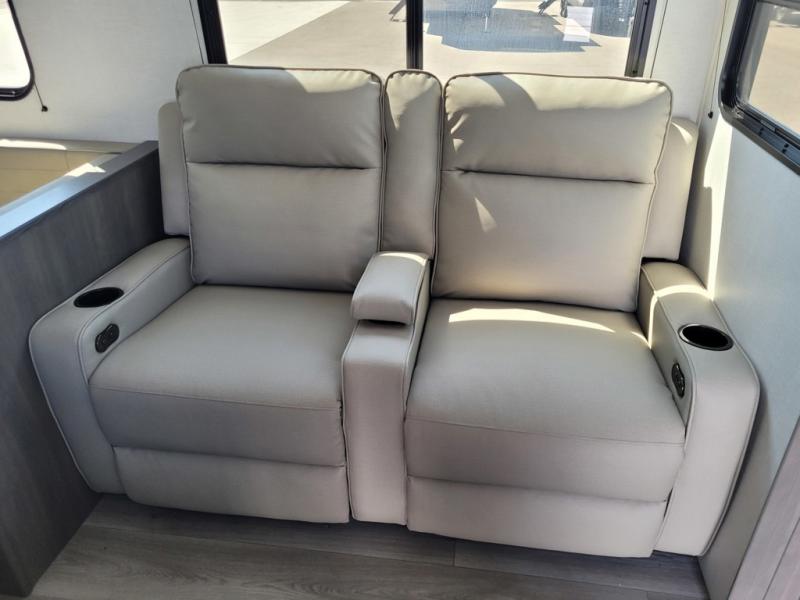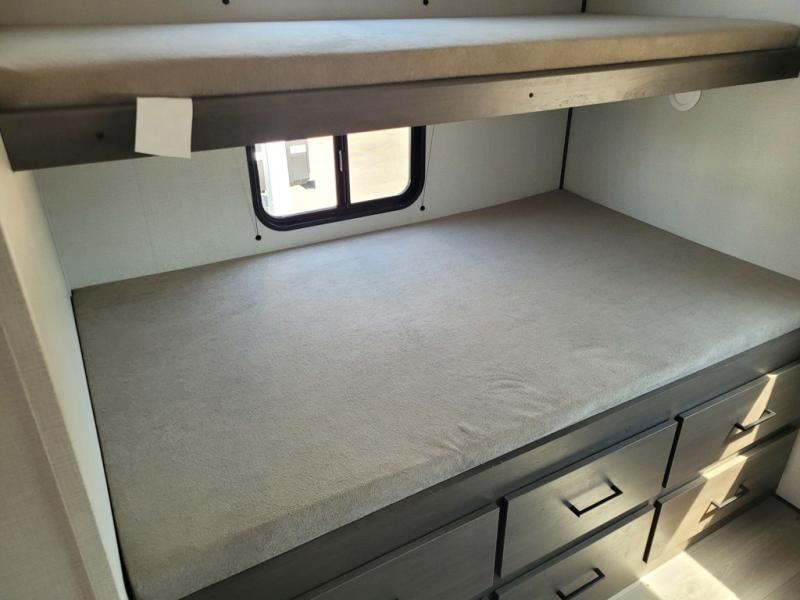If you're looking for a travel trailer that can house your whole gang, this unit is the one! The rear private bunkhouse can sleep up to five since there is a sleeper sofa and three bunks, plus there are storage drawers for your guests' things. A front private bedroom will be perfect for the owners with a queen bed, storage space, and a convenient laundry chute! Whether you cook outside on the exterior griddle or inside on the three burner range, you'll be able to make your best meals. There is also a 12V French door refrigerator with a glass front and bottom freezer and a convection microwave/combo air fryer for easy meals! A U-shaped dinette and 60" sleeper sofa within the living room slide provides even more seating and sleeping space, or you can choose the optional theater seat in place of the sofa if you're not needing the extra sleeping space!