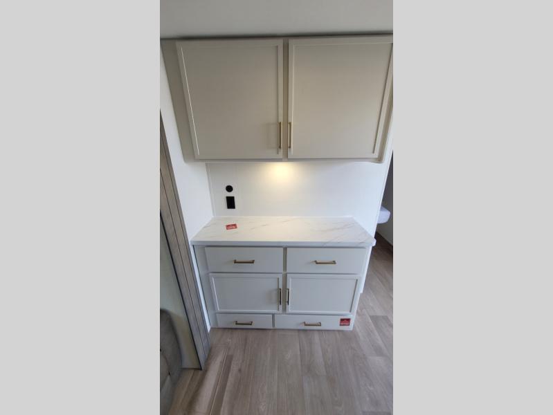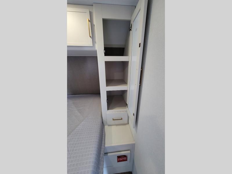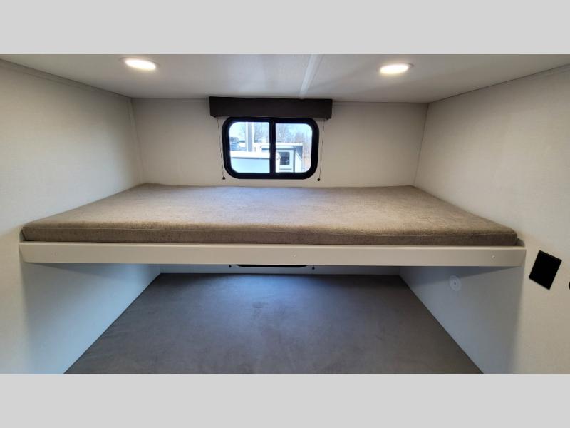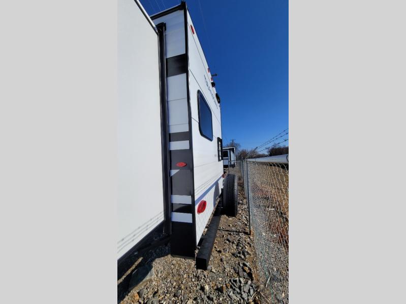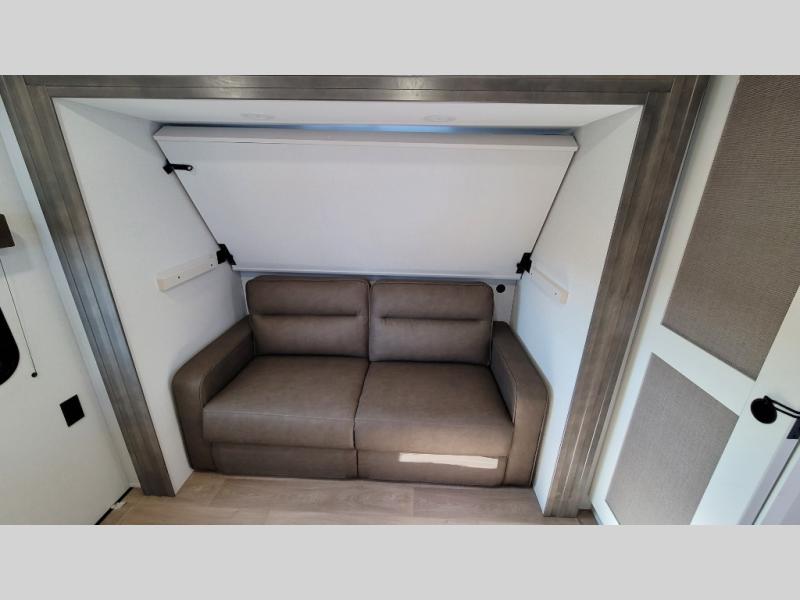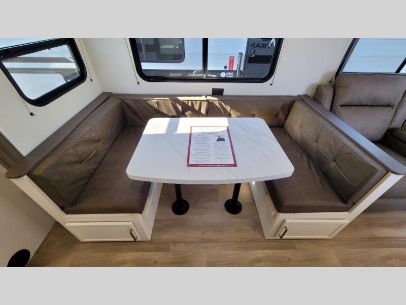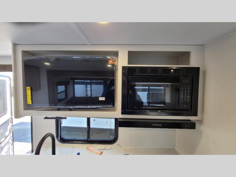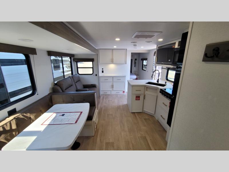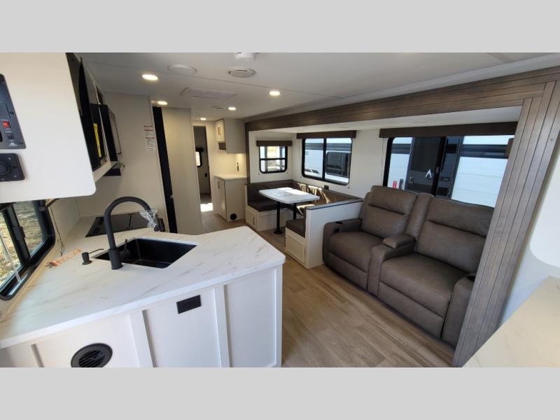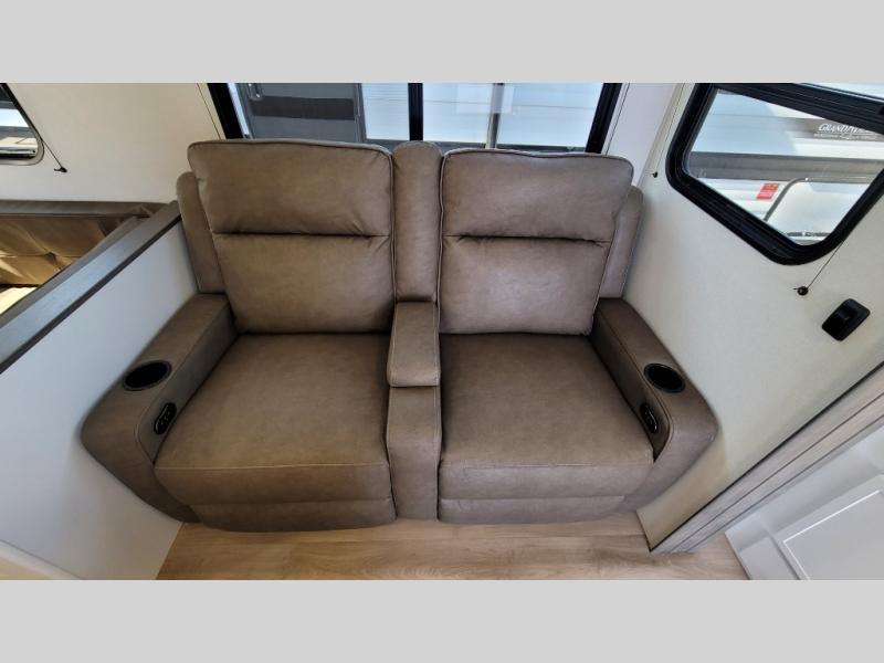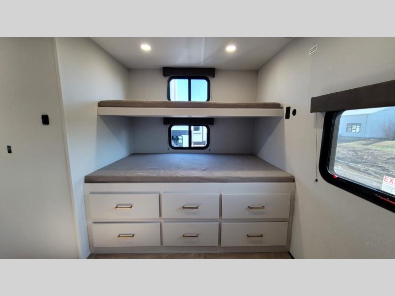 If you're looking for a travel trailer that can house your whole gang, this unit is the one! The rear private bunkhouse can sleep up to five since there is a sleeper sofa and three bunks, plus there are storage drawers for your guests' things. A front private bedroom will be perfect for the owners with a queen bed, storage space, and a convenient laundry chute! Whether you cook outside on the exterior griddle or inside on the three burner range, you'll be able to make your best meals. There is also a 12V French door refrigerator with a glass front and bottom freezer and a convection microwave/combo air fryer for easy meals! A U-shaped dinette and 60" sleeper sofa within the living room slide provides even more seating and sleeping space, or you can choose the optional theater seat in place of the sofa if you're not needing the extra sleeping space!