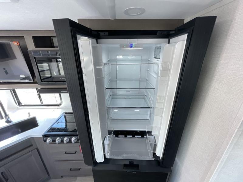 Cooking is effortless whether indoors or out. Inside, you’ll find a three-burner range, convection microwave with air fryer, and a 12V French door refrigerator with glass front and bottom freezer. Outside, the exterior griddle and refrigerator make campsite cooking and entertaining a breeze.