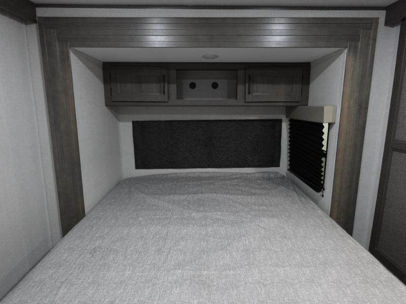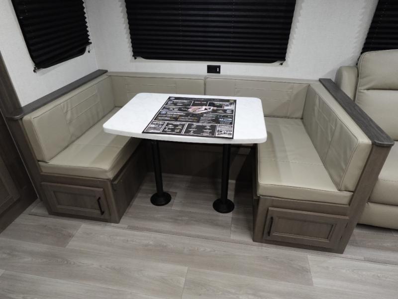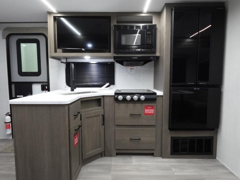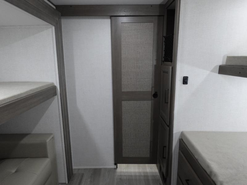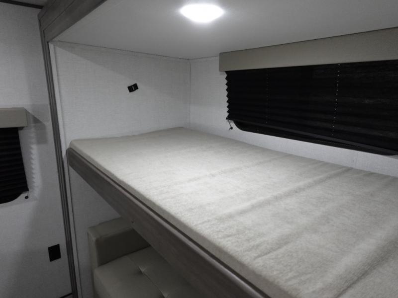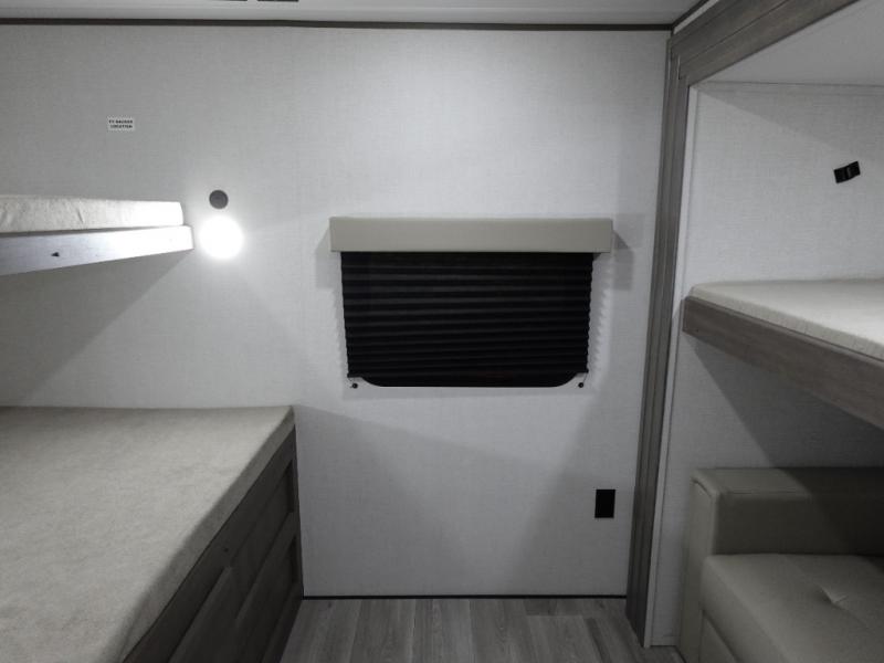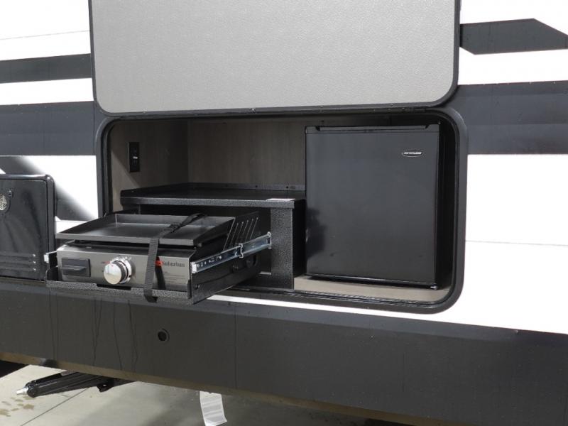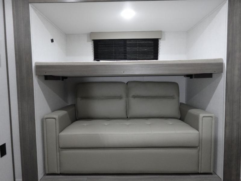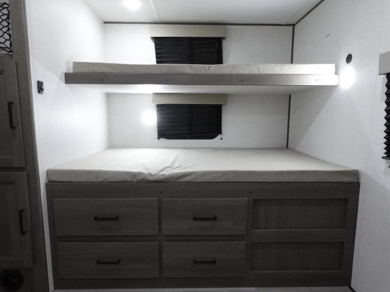If you're looking for a travel trailer that can house your whole gang, this unit is the one! The rear private bunkhouse can sleep up to five since there is a sleeper sofa and three bunks, plus there are storage drawers for your guests' things. A front private bedroom will be perfect for the owners with a queen bed slide out and spacious front closet with washer and dryer prep! Whether you cook outside on the exterior griddle or inside on the three burner range, you'll be able to make your best meals. There is also a 12V French door refrigerator with a glass front and bottom freezer and a convection microwave/combo air fryer to enjoy some crispy fries! A U-shaped dinette and 60" sleeper sofa within the living room slide provides even more seating and sleeping space!
