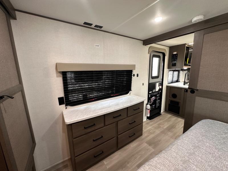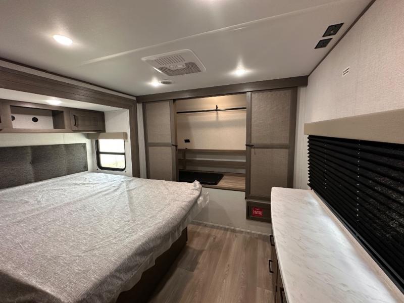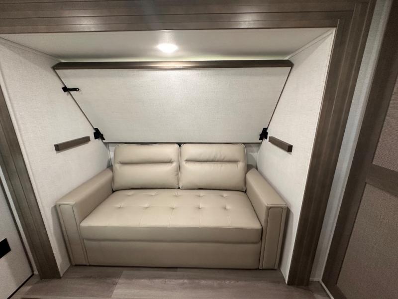 If you're looking for a travel trailer that can house your whole gang, this unit is the one! The rear private bunkhouse can sleep up to five since there is a sleeper sofa and three bunks, plus there are storage drawers for your guests' things. A front private bedroom will be perfect for the owners with a queen bed slide out and spacious front closet with washer and dryer prep! Whether you cook outside on the exterior griddle or inside on the three burner range, you'll be able to make your best meals. There is also a 12V French door refrigerator with a glass front and bottom freezer and a convection microwave/combo air fryer to enjoy some crispy fries! A U-shaped dinette and 60" sleeper sofa within the living room slide provides even more seating and sleeping space!