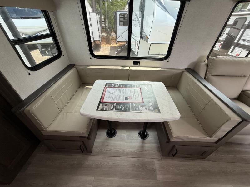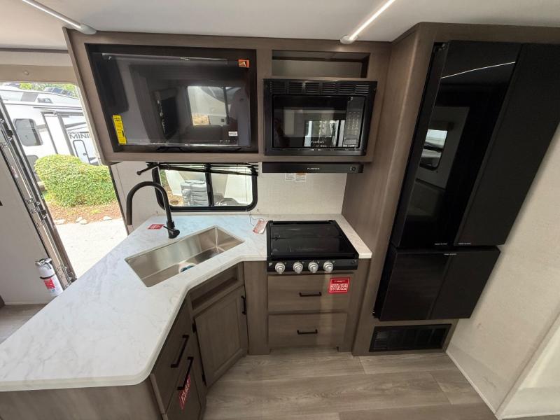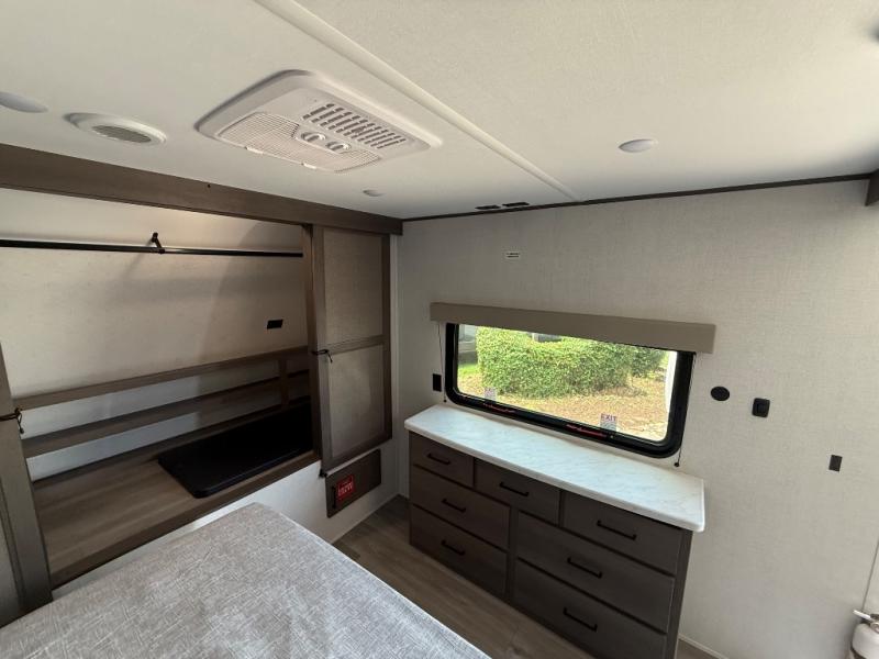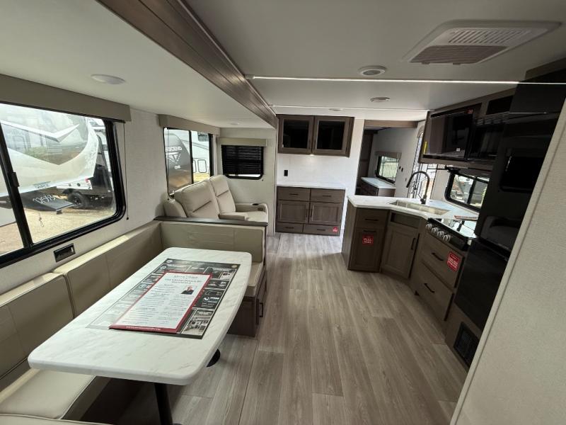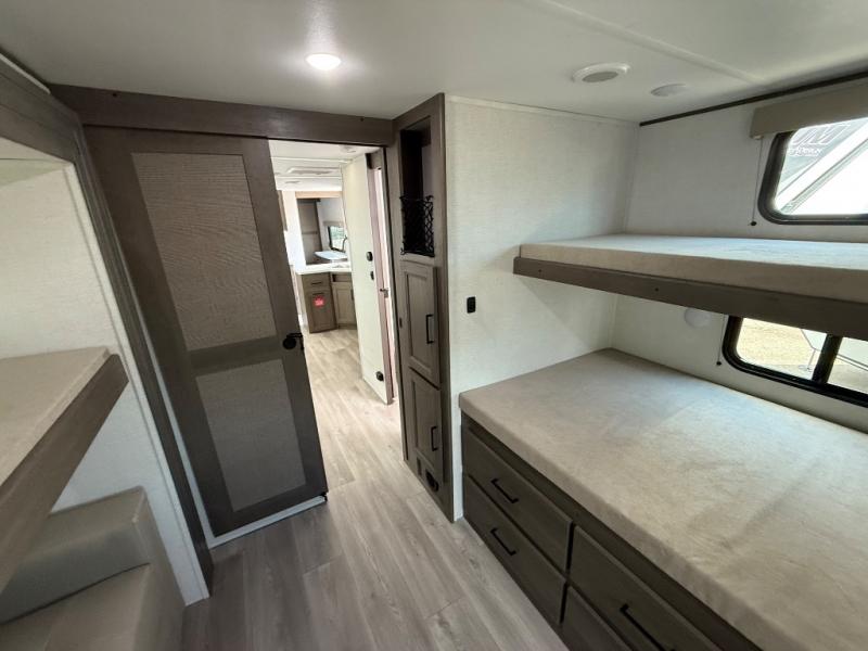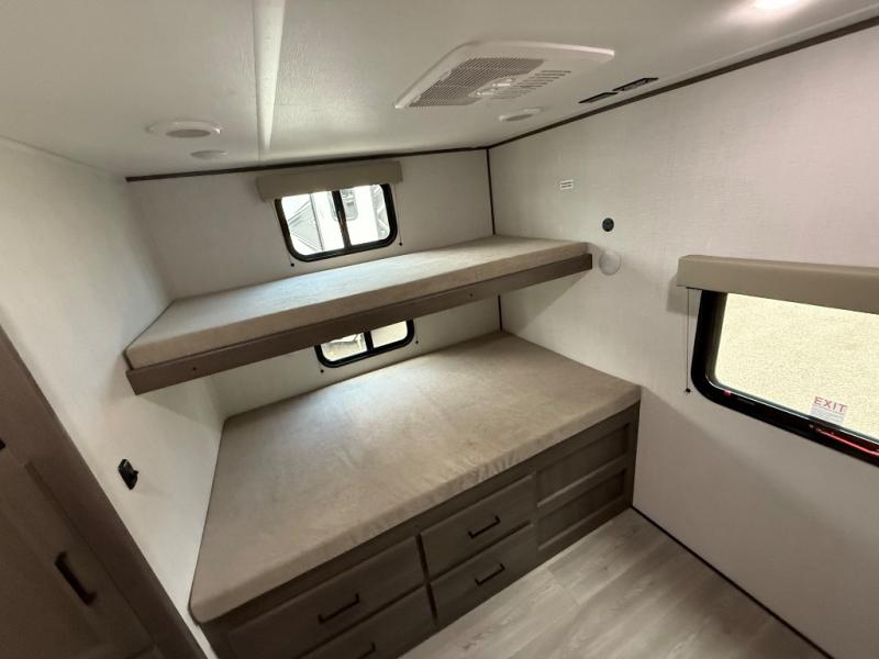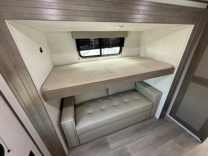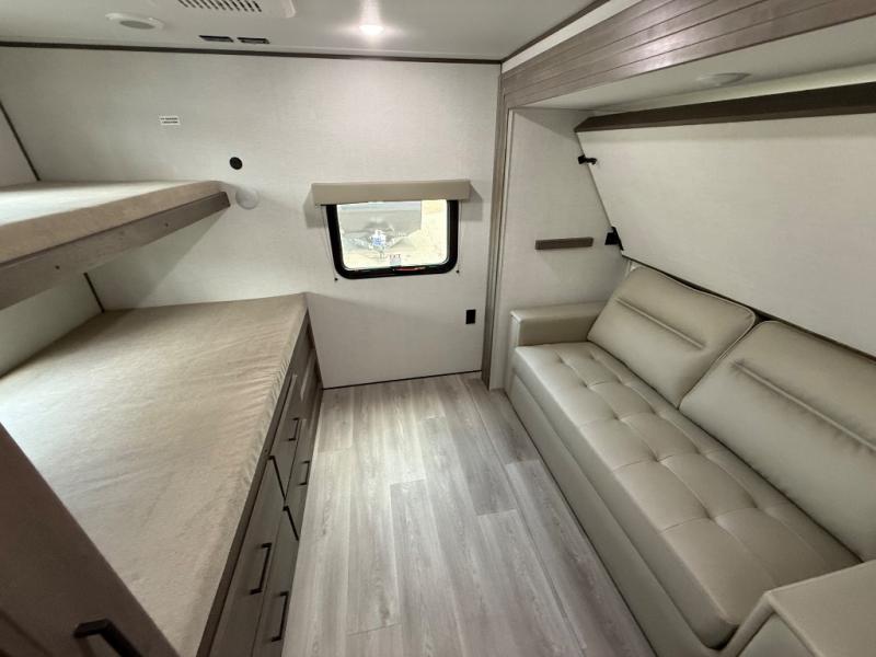 If you're looking for a travel trailer that can house your whole gang, this unit is the one! The rear private bunkhouse can sleep up to five since there is a sleeper sofa and three bunks, plus there are storage drawers for your guests' things. A front private bedroom will be perfect for the owners with a queen bed slide out and spacious front closet with washer and dryer prep! Whether you cook outside on the exterior griddle or inside on the three burner range, you'll be able to make your best meals. There is also a 12V French door refrigerator with a glass front and bottom freezer and a convection microwave/combo air fryer to enjoy some crispy fries! A U-shaped dinette and 60" sleeper sofa within the living room slide provides even more seating and sleeping space!