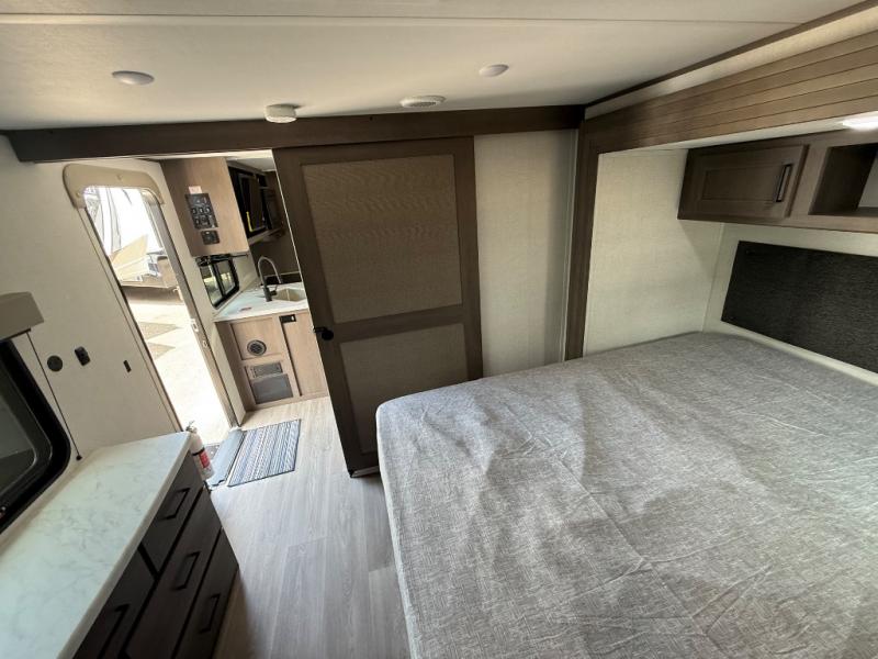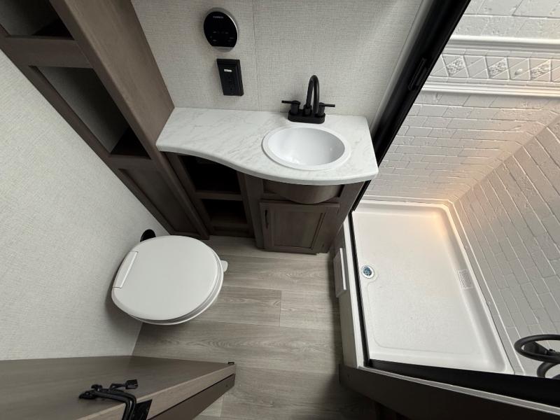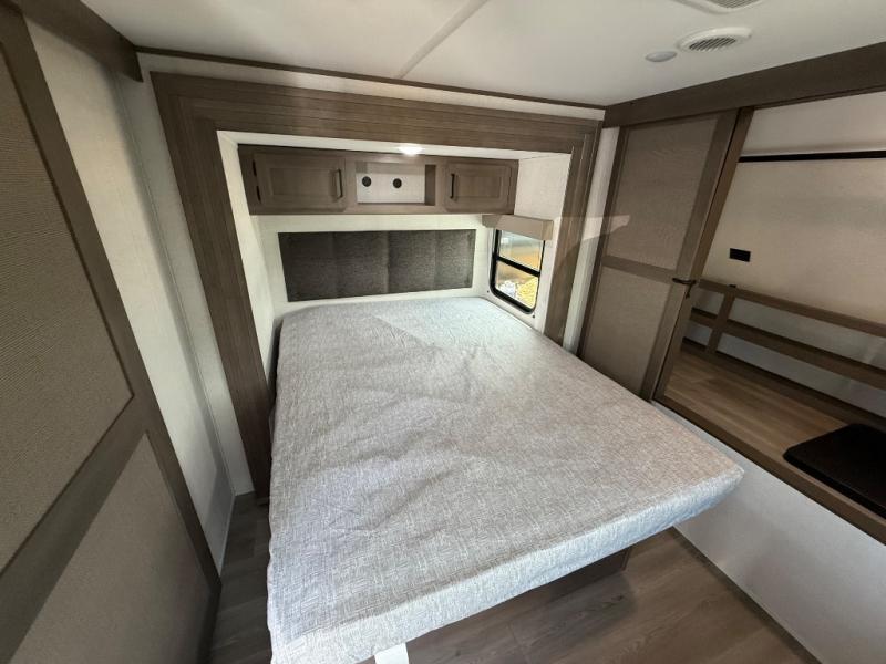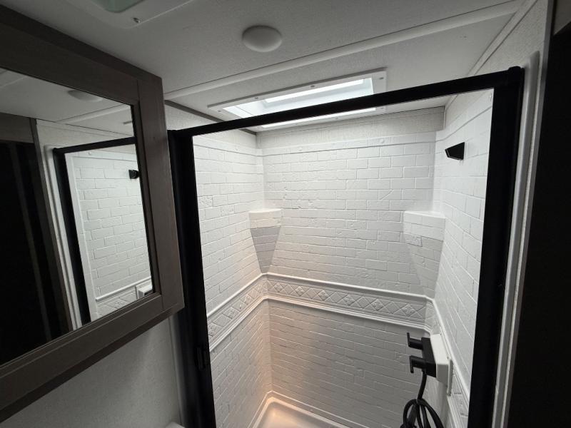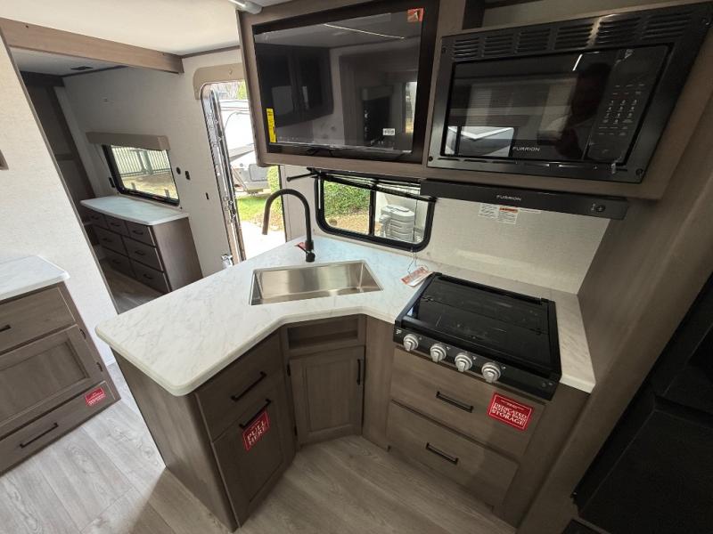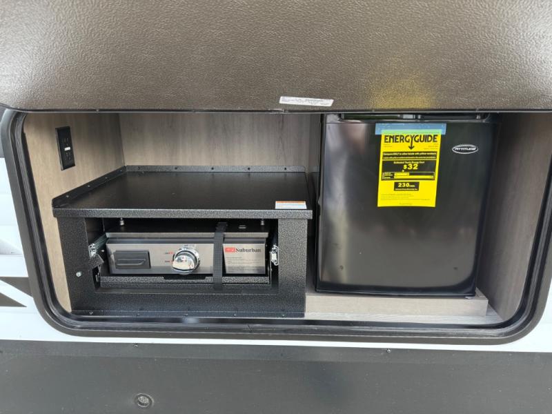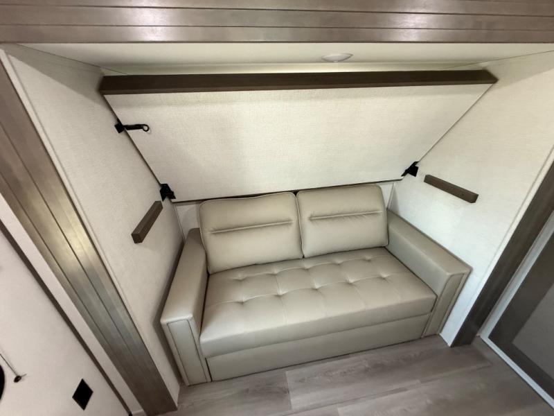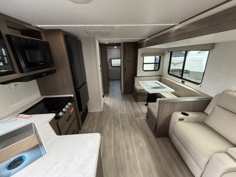 If you're looking for a travel trailer that can house your whole gang, this unit is the one! The rear private bunkhouse can sleep up to five since there is a sleeper sofa and three bunks, plus there are storage drawers for your guests' things. A front private bedroom will be perfect for the owners with a queen bed slide out and spacious front closet with washer and dryer prep! Whether you cook outside on the exterior griddle or inside on the three burner range, you'll be able to make your best meals. There is also a 12V French door refrigerator with a glass front and bottom freezer and a convection microwave/combo air fryer to enjoy some crispy fries! A U-shaped dinette and 60" sleeper sofa within the living room slide provides even more seating and sleeping space!