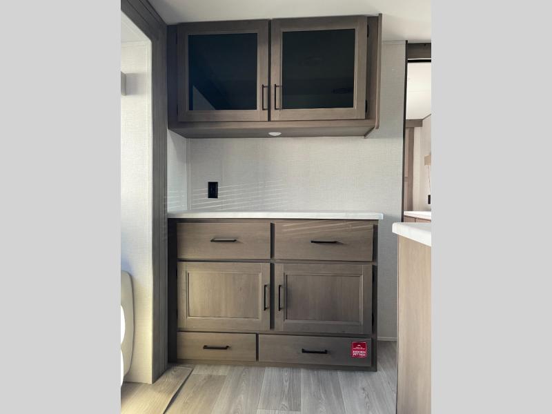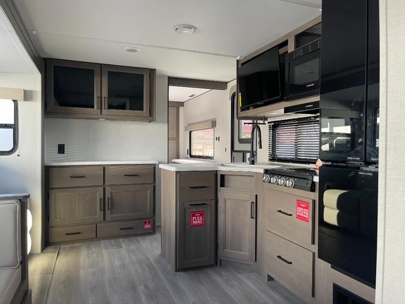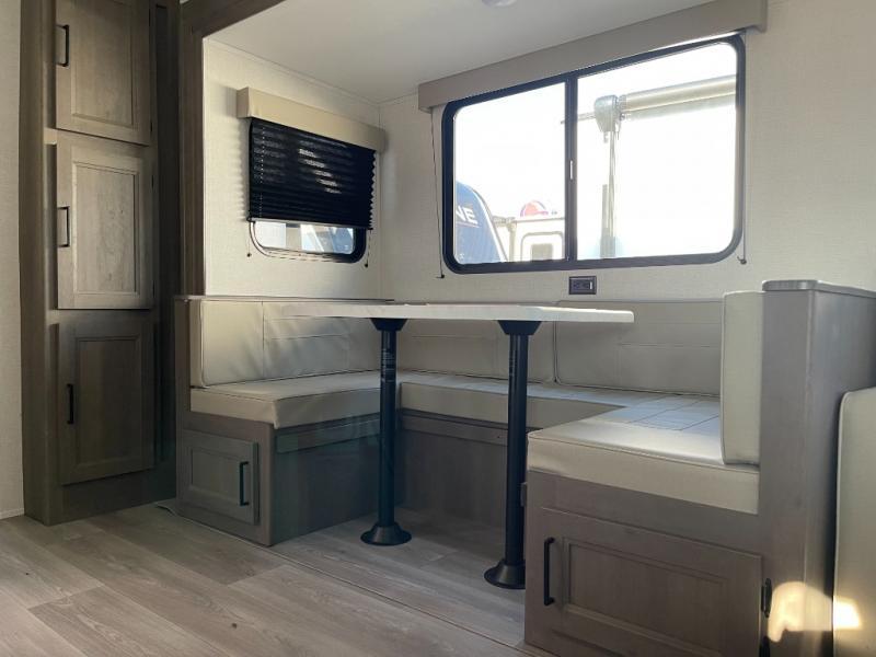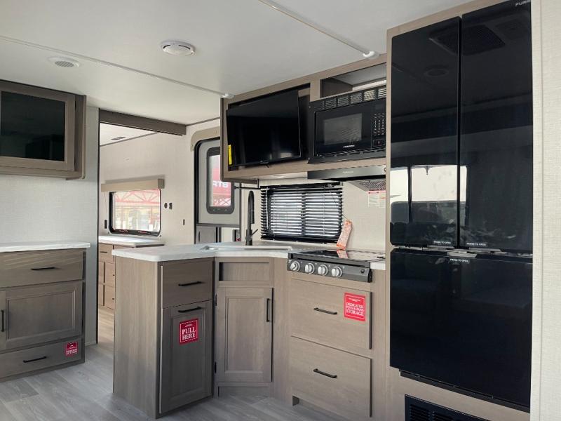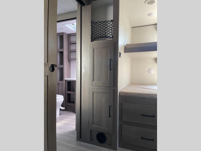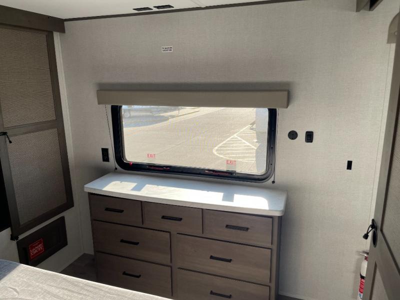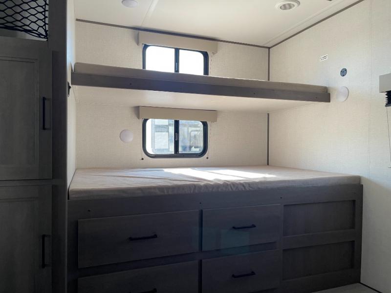 If you're looking for a travel trailer that can house your whole gang, this unit is the one! The rear private bunkhouse can sleep up to five since there is a sleeper sofa and three bunks, plus there are storage drawers for your guests' things. A front private bedroom will be perfect for the owners with a queen bed slide out and spacious front closet with washer and dryer prep! Whether you cook outside on the exterior griddle or inside on the three burner range, you'll be able to make your best meals. There is also a 12V French door refrigerator with a glass front and bottom freezer and a convection microwave/combo air fryer to enjoy some crispy fries! A U-shaped dinette and 60" sleeper sofa within the living room slide provides even more seating and sleeping space!