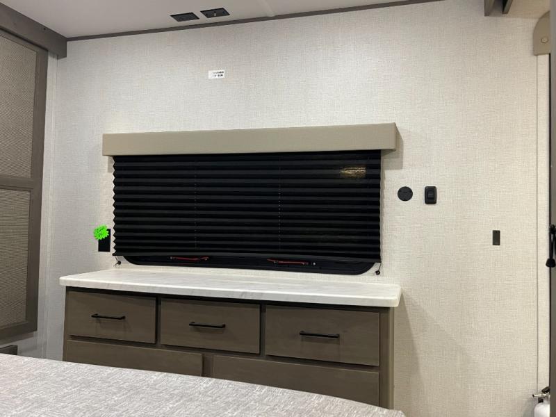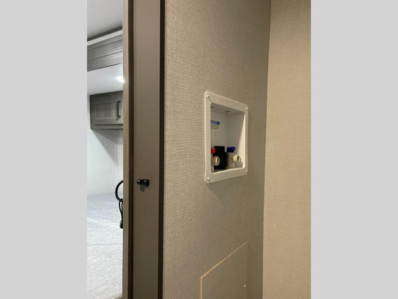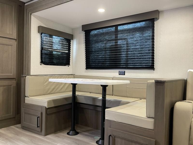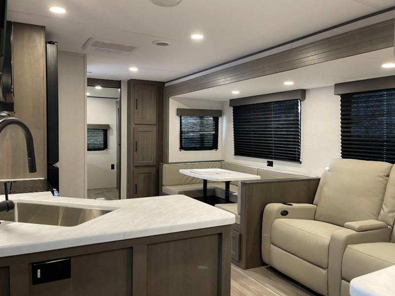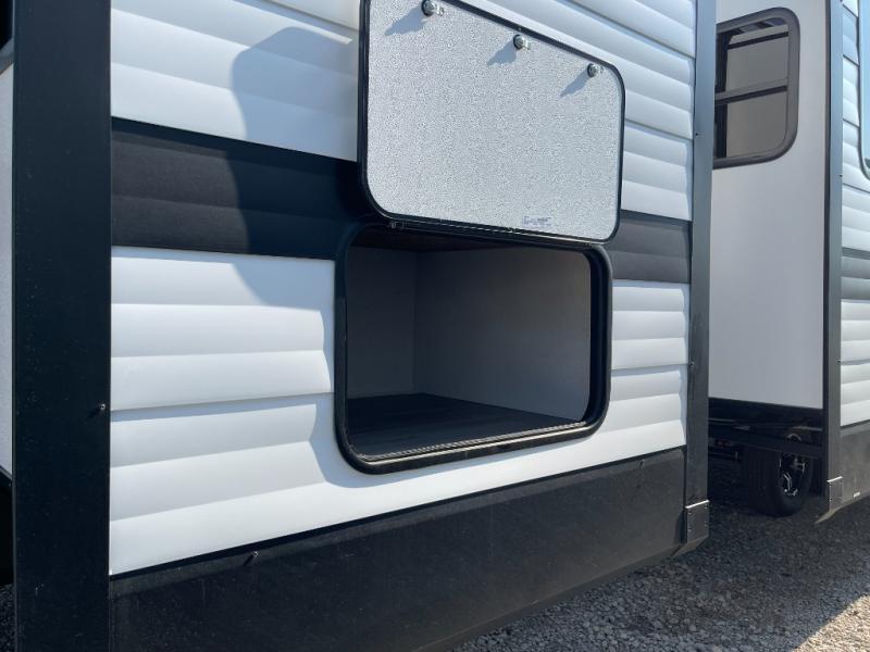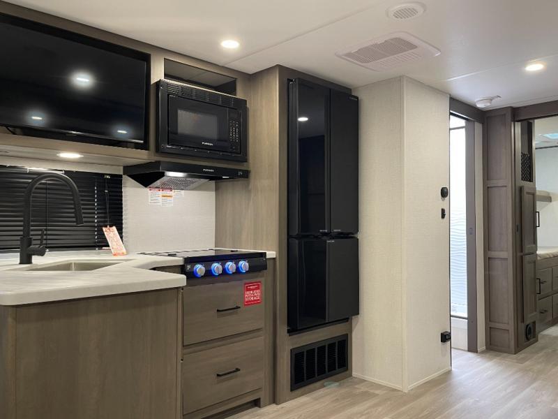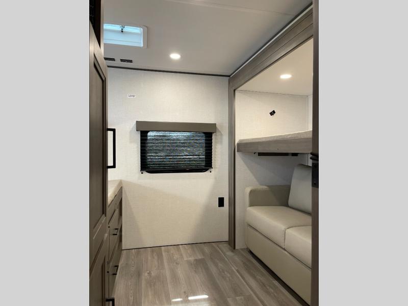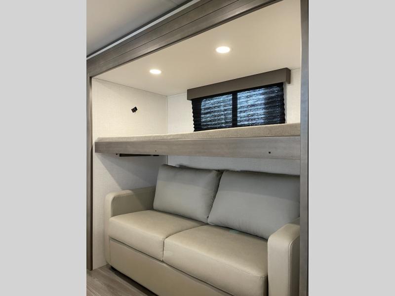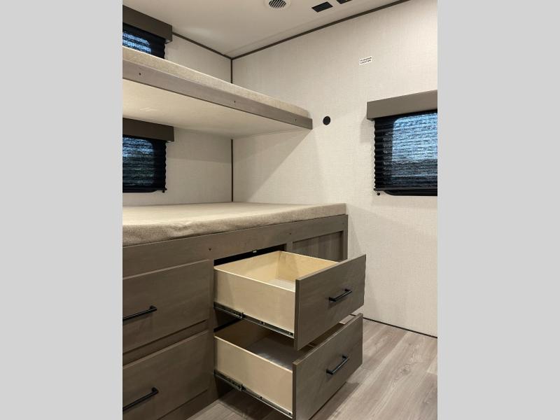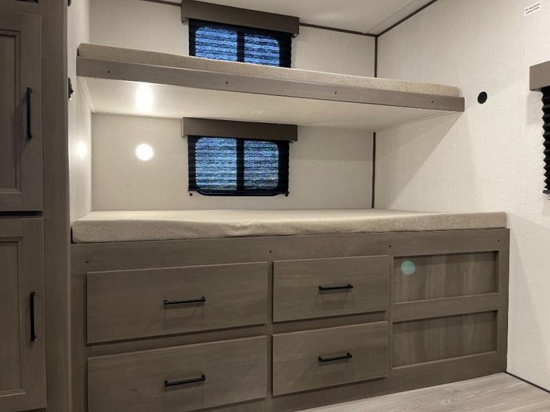 If you're looking for a travel trailer that can house your whole gang, this unit is the one! The rear private bunkhouse can sleep up to five since there is a sleeper sofa and three bunks, plus there are storage drawers for your guests' things. A front private bedroom will be perfect for the owners with a queen bed slide out and spacious front closet with washer and dryer prep! Whether you cook outside on the exterior griddle or inside on the three burner range, you'll be able to make your best meals. There is also a 12V French door refrigerator with a glass front and bottom freezer and a convection microwave/combo air fryer to enjoy some crispy fries! A U-shaped dinette and 60" sleeper sofa within the living room slide provides even more seating and sleeping space!