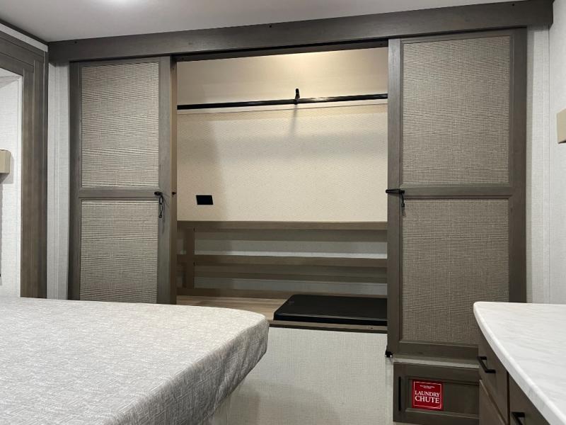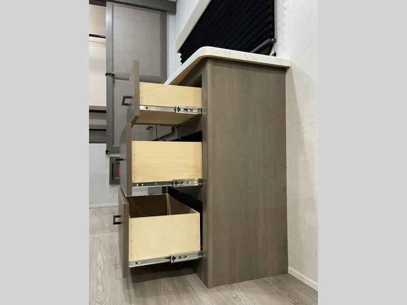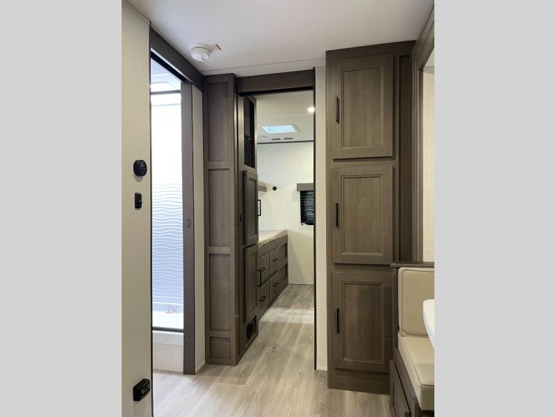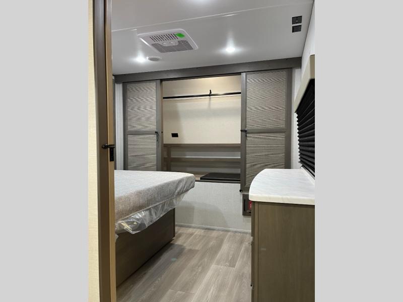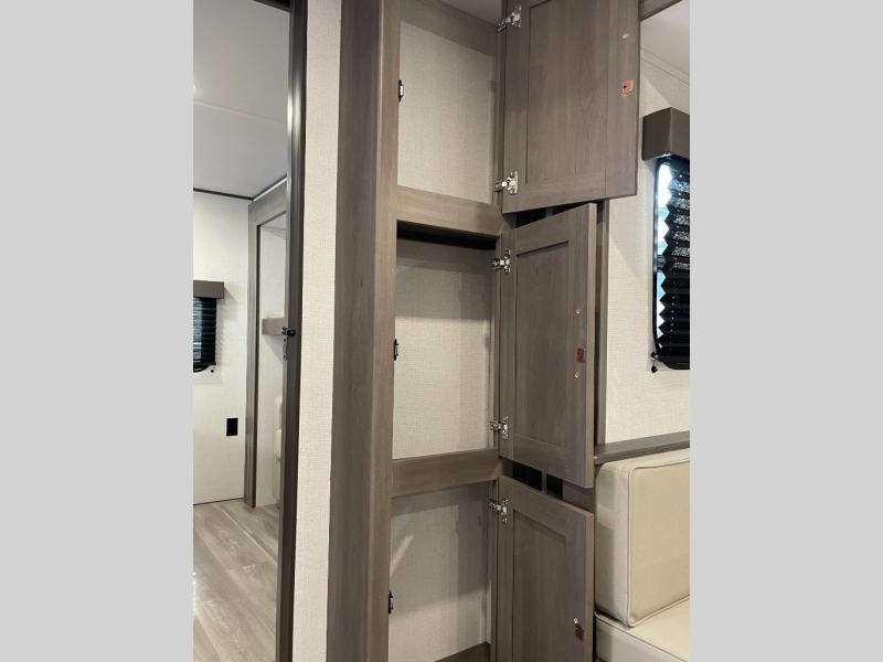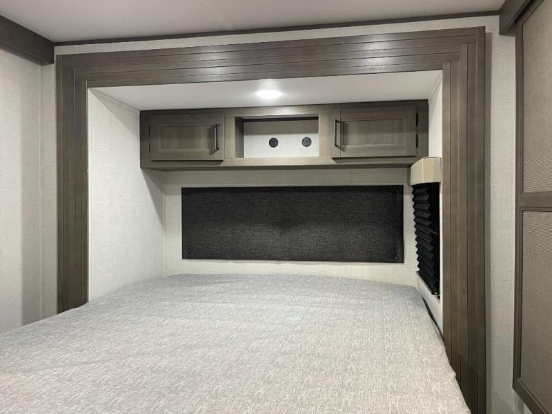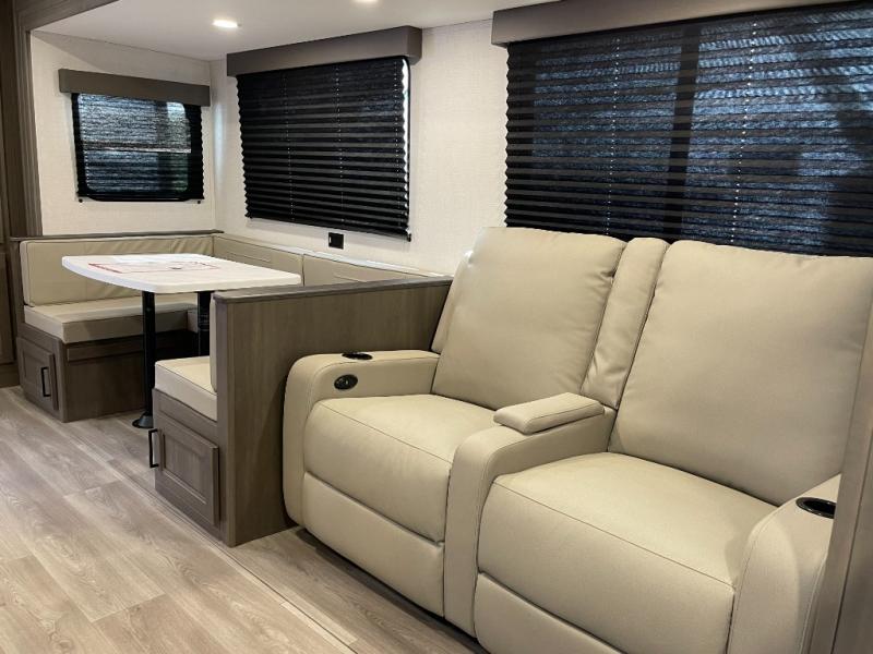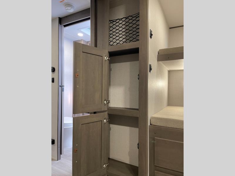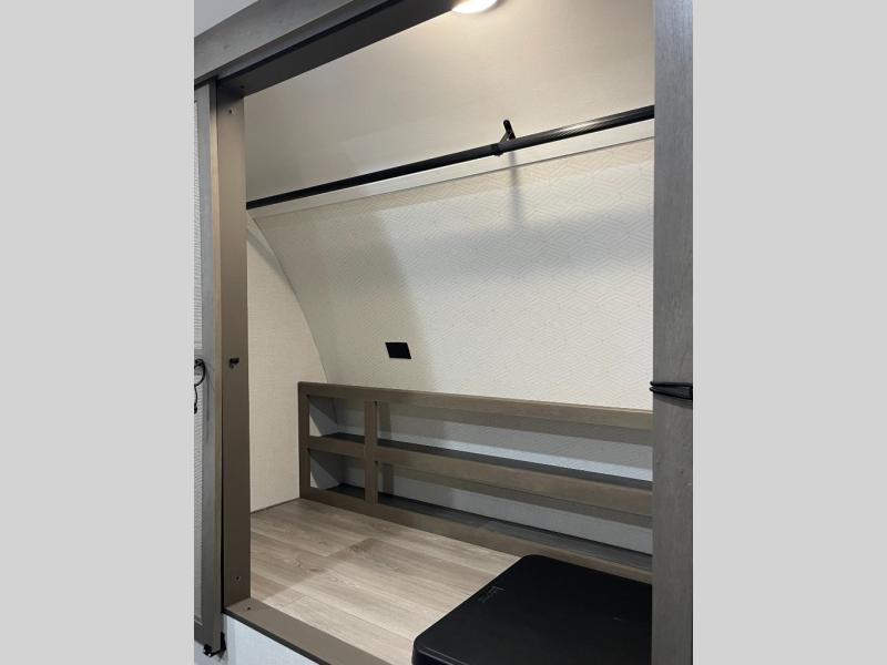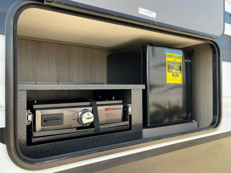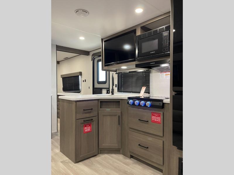If you're looking for a travel trailer that can house your whole gang, this unit is the one! The rear private bunkhouse can sleep up to five since there is a sleeper sofa and three bunks, plus there are storage drawers for your guests' things. A front private bedroom will be perfect for the owners with a queen bed slide out and spacious front closet with washer and dryer prep! Whether you cook outside on the exterior griddle or inside on the three burner range, you'll be able to make your best meals. There is also a 12V French door refrigerator with a glass front and bottom freezer and a convection microwave/combo air fryer to enjoy some crispy fries! A U-shaped dinette and 60" sleeper sofa within the living room slide provides even more seating and sleeping space!