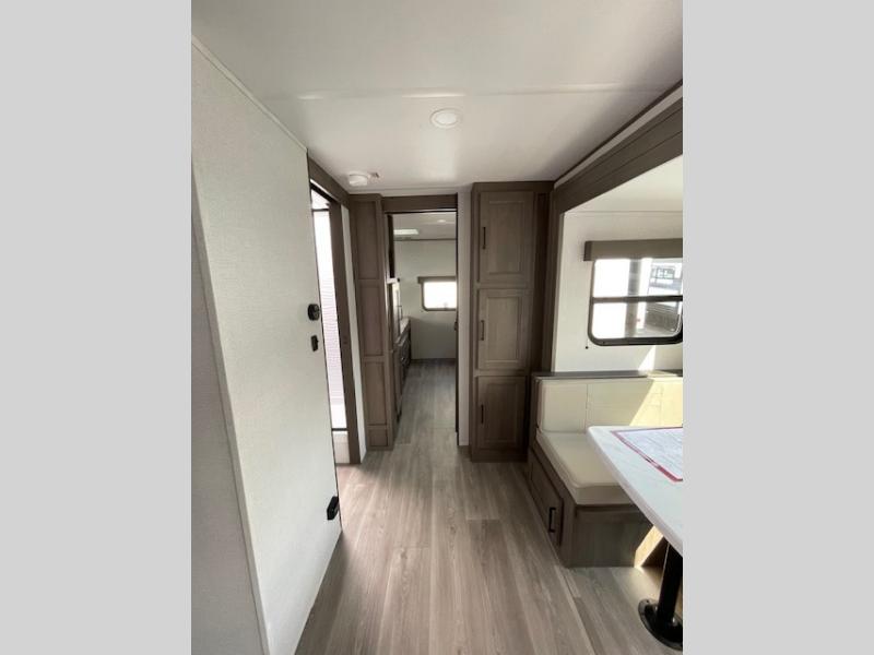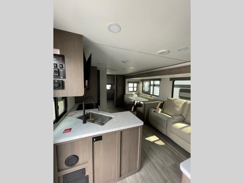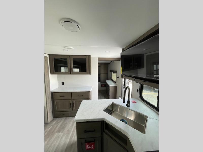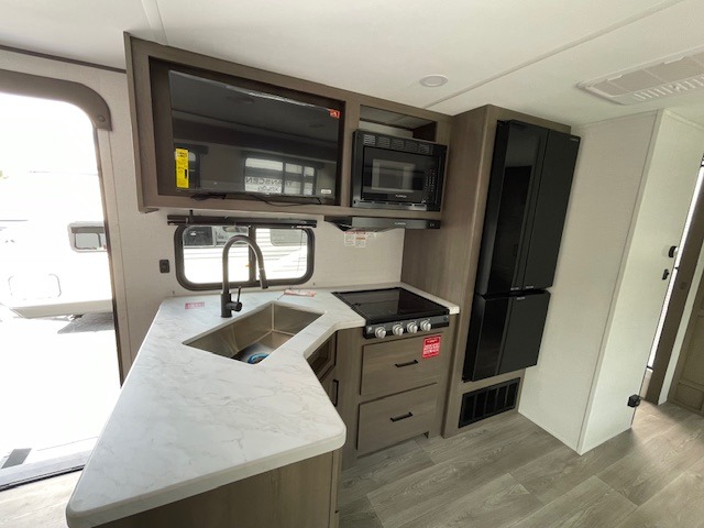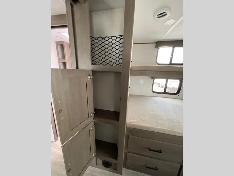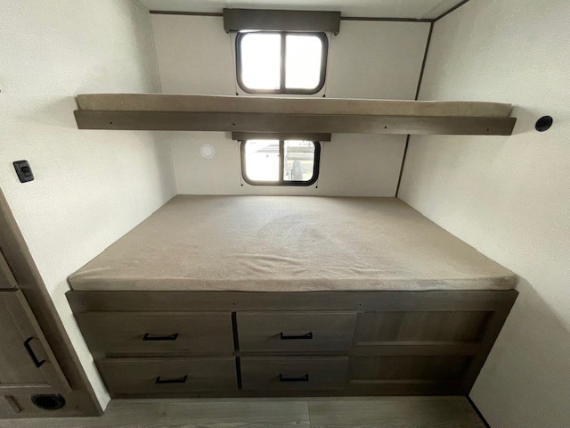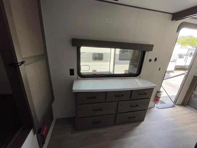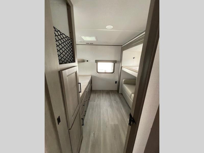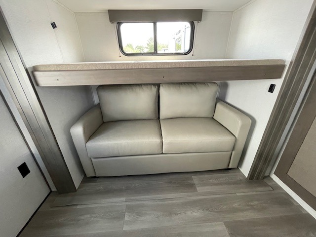 If you're looking for a travel trailer that can house your whole gang, this unit is the one! The rear private bunkhouse can sleep up to five since there is a sleeper sofa and three bunks, plus there are storage drawers for your guests' things. A front private bedroom will be perfect for the owners with a queen bed slide out and spacious front closet with washer and dryer prep! Whether you cook outside on the exterior griddle or inside on the three burner range, you'll be able to make your best meals. There is also a 12V French door refrigerator with a glass front and bottom freezer and a convection microwave/combo air fryer to enjoy some crispy fries! A U-shaped dinette and 60" sleeper sofa within the living room slide provides even more seating and sleeping space!