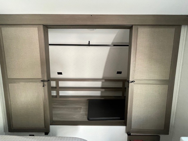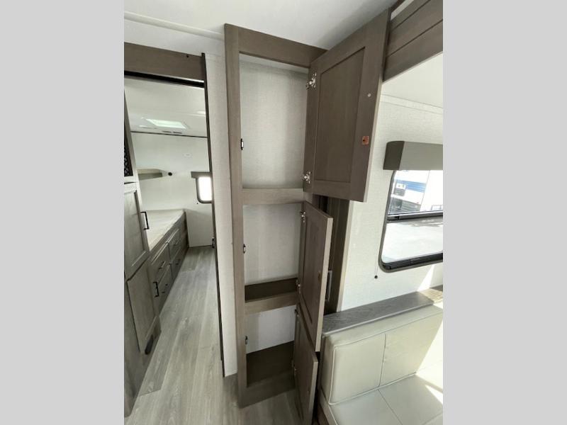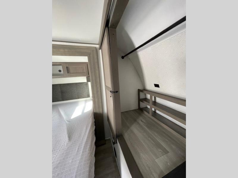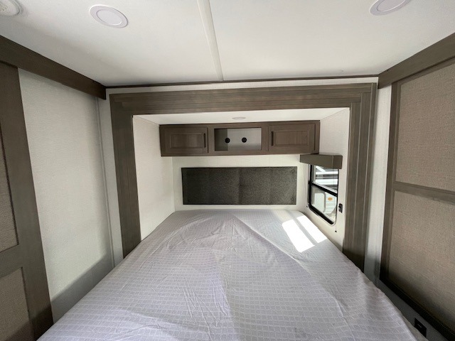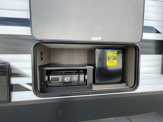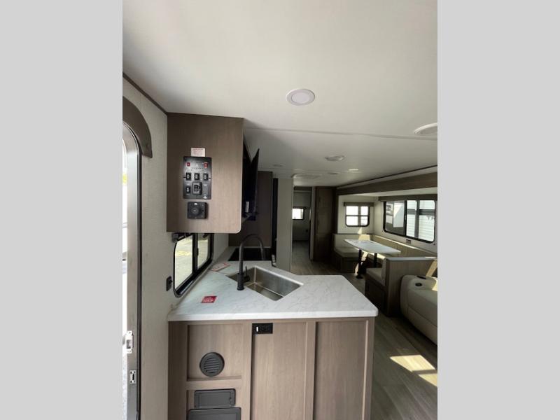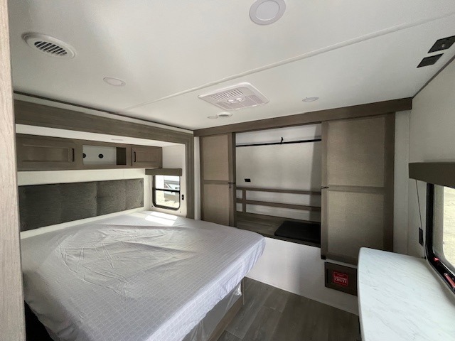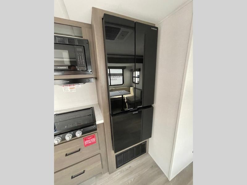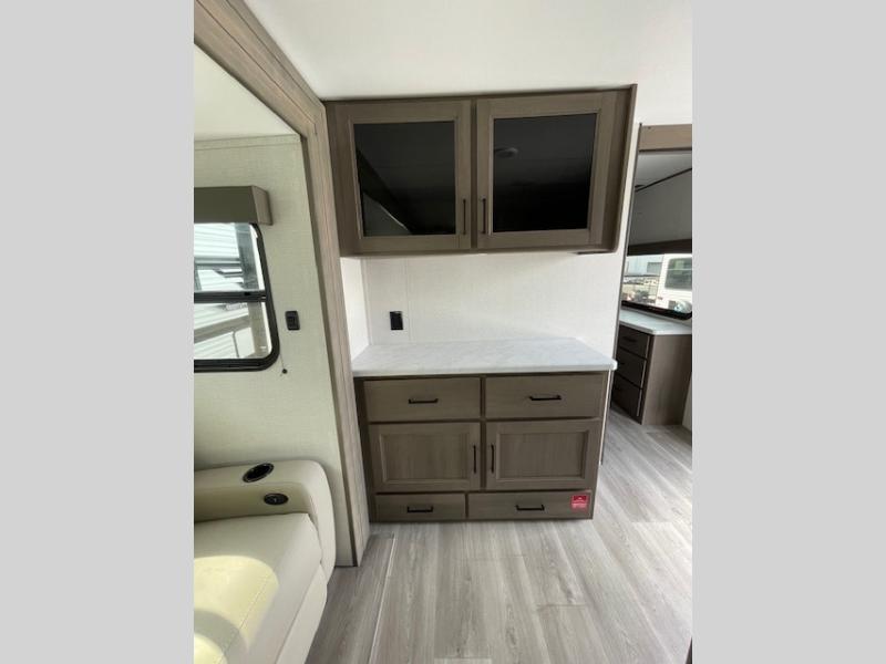 If you're looking for a travel trailer that can house your whole gang, this unit is the one! The rear private bunkhouse can sleep up to five since there is a sleeper sofa and three bunks, plus there are storage drawers for your guests' things. A front private bedroom will be perfect for the owners with a queen bed slide out and spacious front closet with washer and dryer prep! Whether you cook outside on the exterior griddle or inside on the three burner range, you'll be able to make your best meals. There is also a 12V French door refrigerator with a glass front and bottom freezer and a convection microwave/combo air fryer to enjoy some crispy fries! A U-shaped dinette and 60" sleeper sofa within the living room slide provides even more seating and sleeping space!