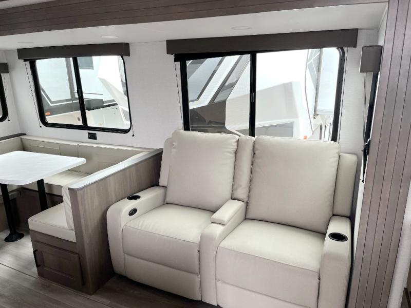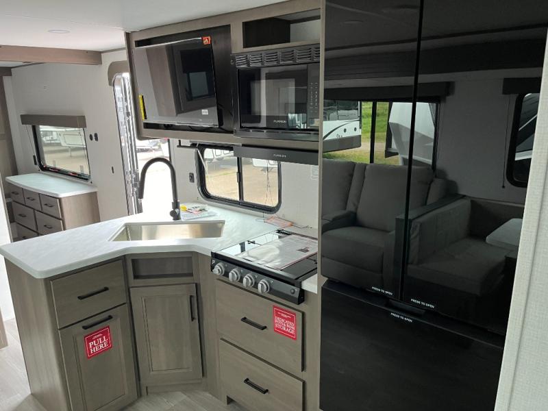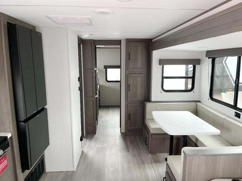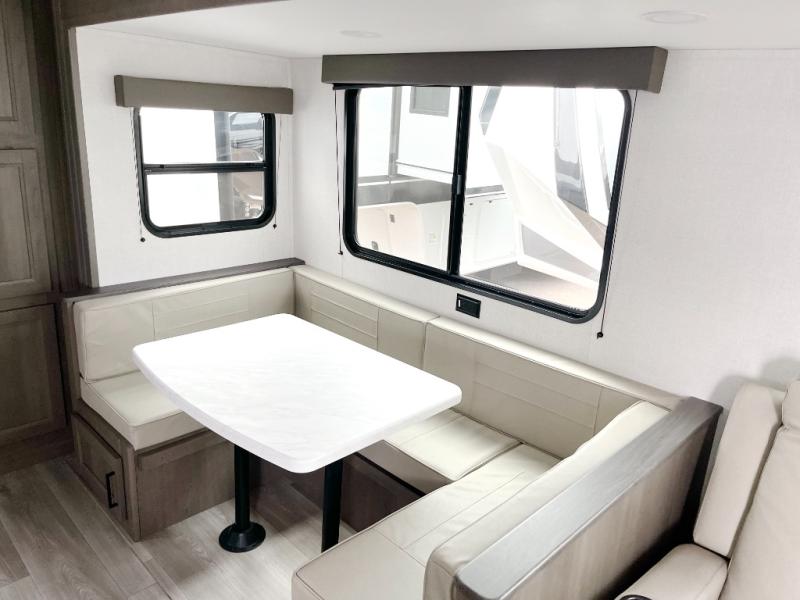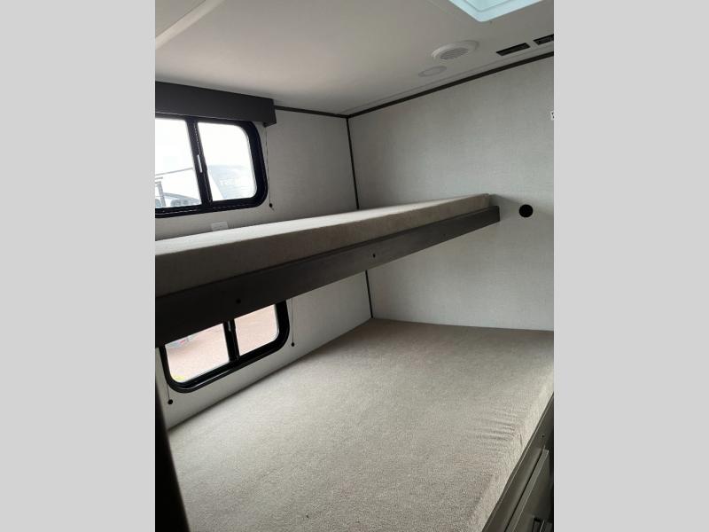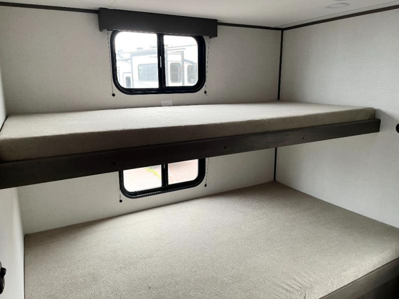 If you're looking for a travel trailer that can house your whole gang, this unit is the one! The rear private bunkhouse can sleep up to five since there is a sleeper sofa and three bunks, plus there are storage drawers for your guests' things. A front private bedroom will be perfect for the owners with a queen bed slide out and spacious front closet with washer and dryer prep! Whether you cook outside on the exterior griddle or inside on the three burner range, you'll be able to make your best meals. There is also a 12V French door refrigerator with a glass front and bottom freezer and a convection microwave/combo air fryer to enjoy some crispy fries! A U-shaped dinette and 60" sleeper sofa within the living room slide provides even more seating and sleeping space!