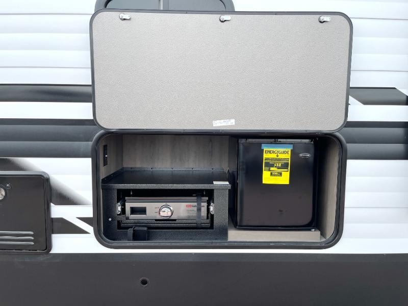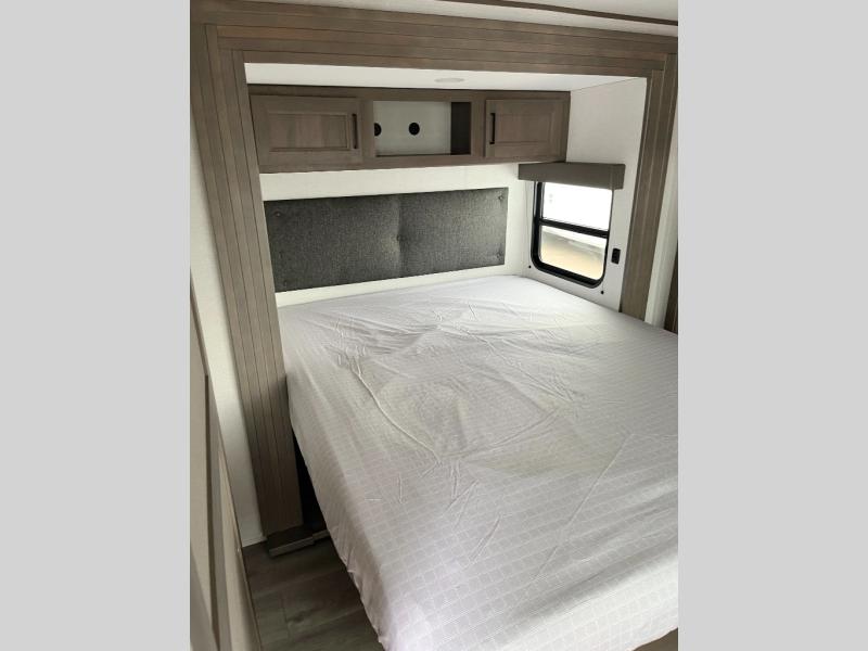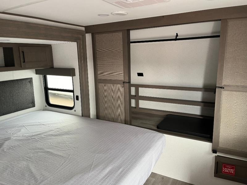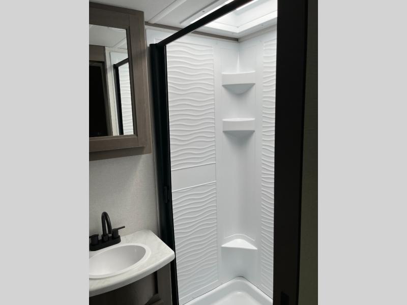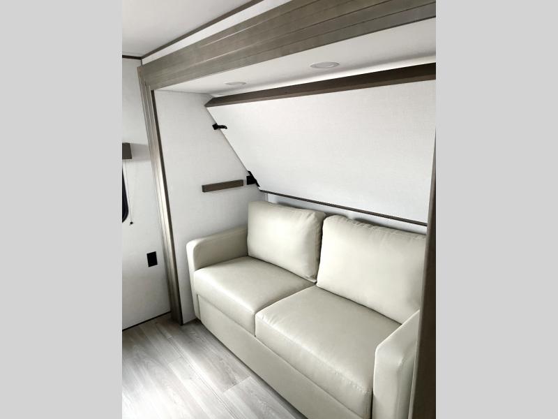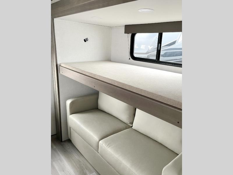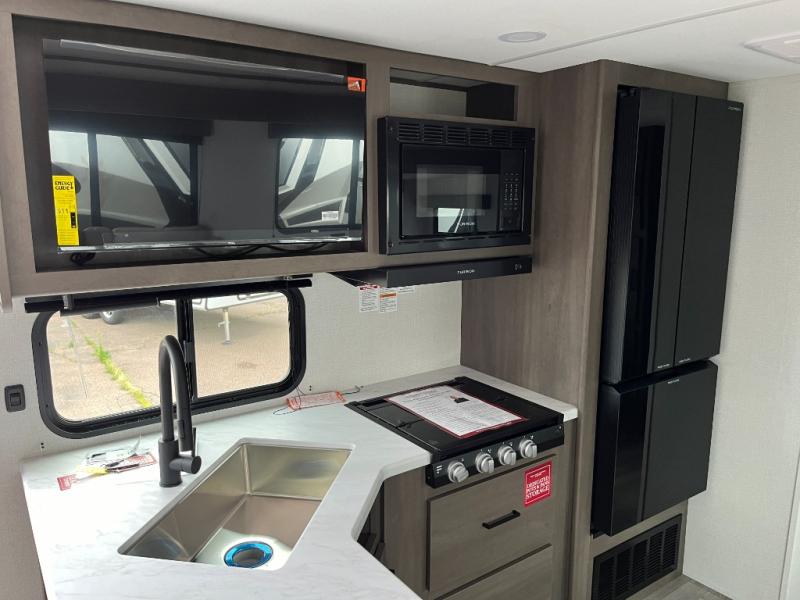 If you're looking for a travel trailer that can house your whole gang, this unit is the one! The rear private bunkhouse can sleep up to five since there is a sleeper sofa and three bunks, plus there are storage drawers for your guests' things. A front private bedroom will be perfect for the owners with a queen bed slide out and spacious front closet with washer and dryer prep! Whether you cook outside on the exterior griddle or inside on the three burner range, you'll be able to make your best meals. There is also a 12V French door refrigerator with a glass front and bottom freezer and a convection microwave/combo air fryer to enjoy some crispy fries! A U-shaped dinette and 60" sleeper sofa within the living room slide provides even more seating and sleeping space!