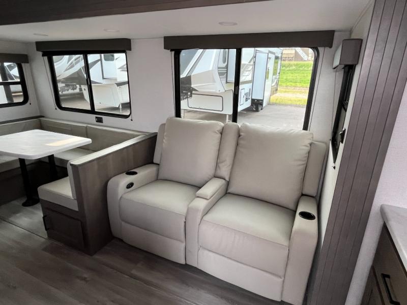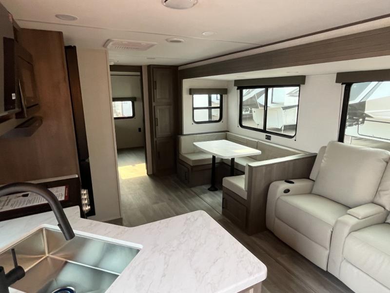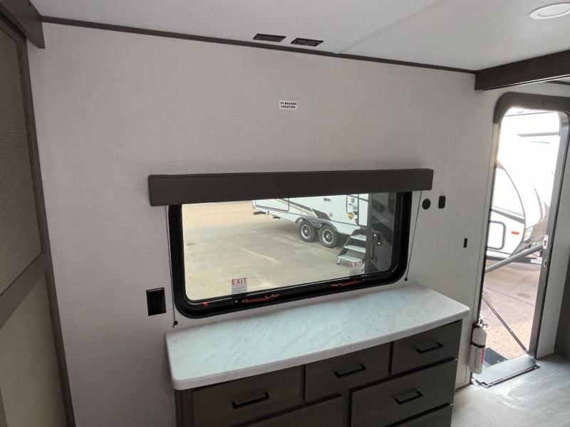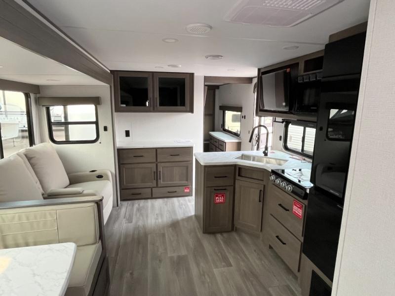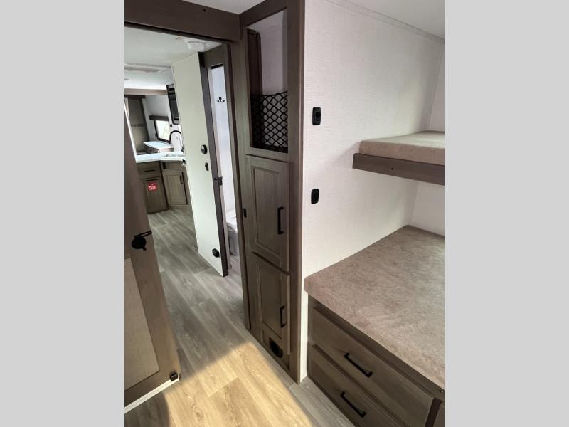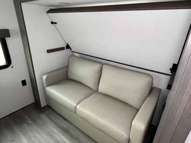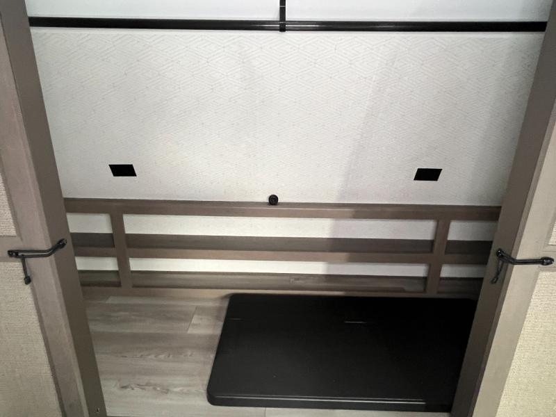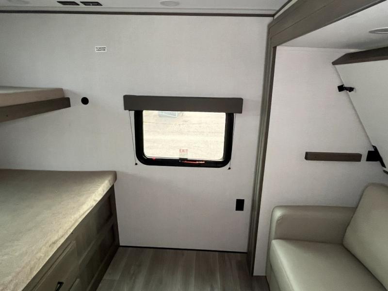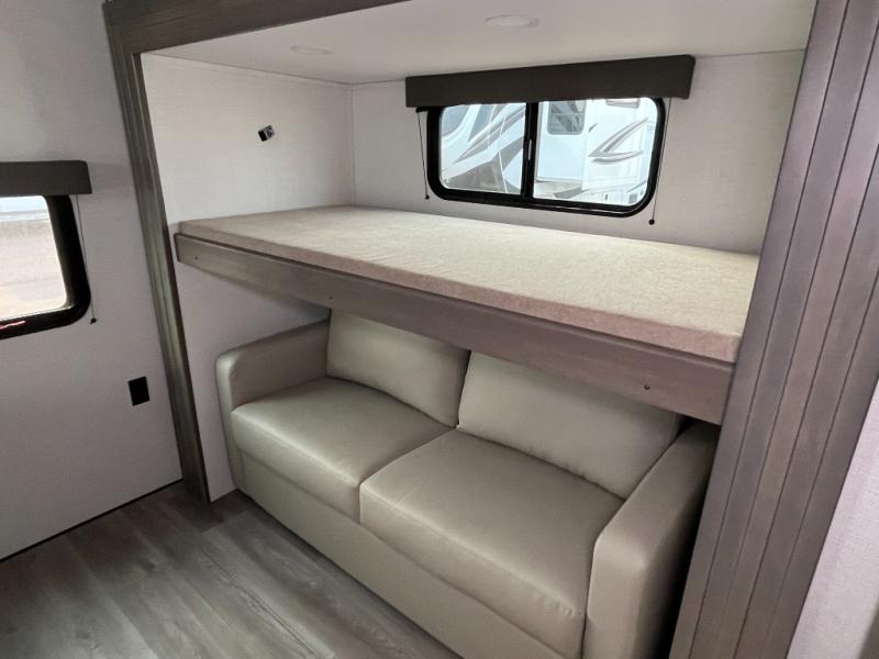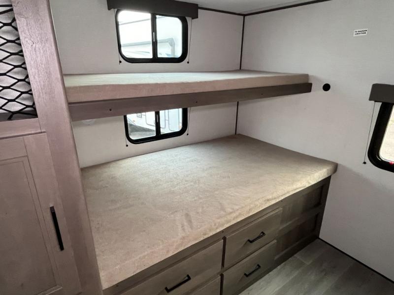 If you're looking for a travel trailer that can house your whole gang, this unit is the one! The rear private bunkhouse can sleep up to five since there is a sleeper sofa and three bunks, plus there are storage drawers for your guests' things. A front private bedroom will be perfect for the owners with a queen bed slide out and spacious front closet with washer and dryer prep! Whether you cook outside on the exterior griddle or inside on the three burner range, you'll be able to make your best meals. There is also a 12V French door refrigerator with a glass front and bottom freezer and a convection microwave/combo air fryer to enjoy some crispy fries! A U-shaped dinette and 60" sleeper sofa within the living room slide provides even more seating and sleeping space!