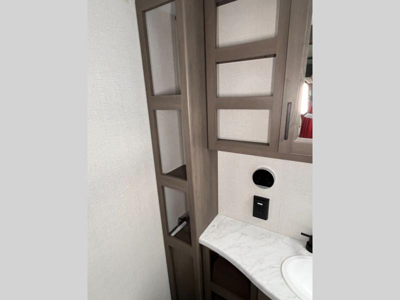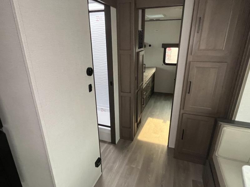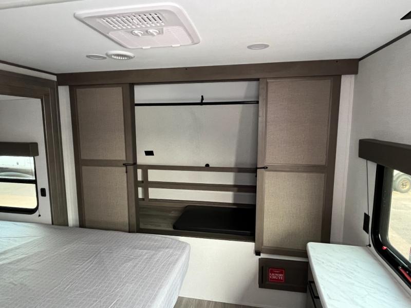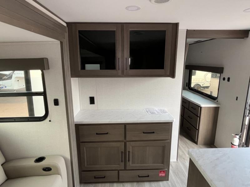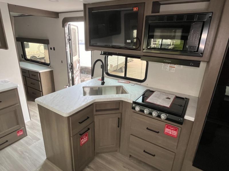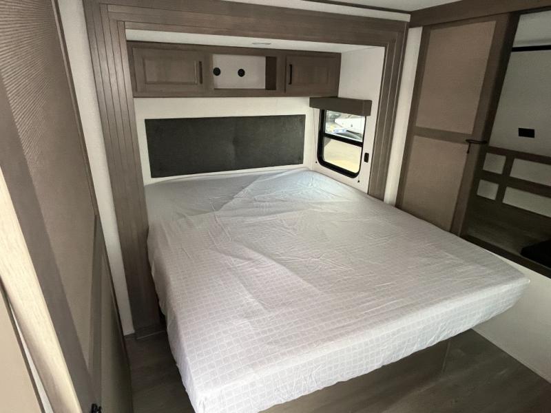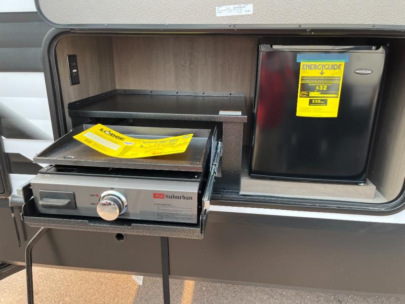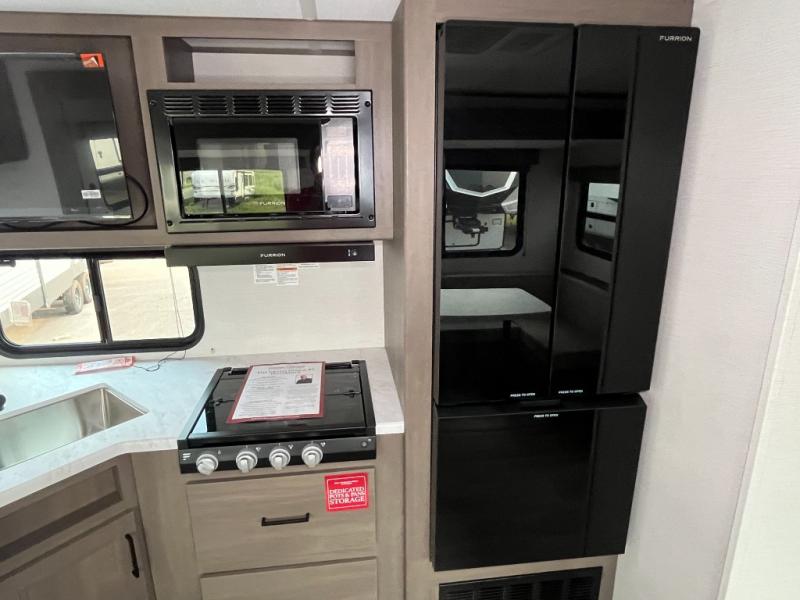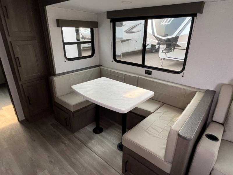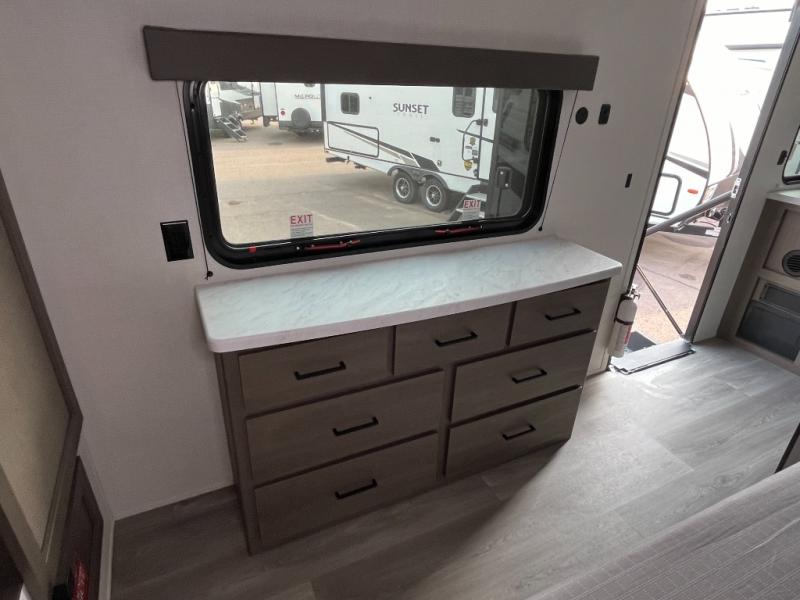 If you're looking for a travel trailer that can house your whole gang, this unit is the one! The rear private bunkhouse can sleep up to five since there is a sleeper sofa and three bunks, plus there are storage drawers for your guests' things. A front private bedroom will be perfect for the owners with a queen bed slide out and spacious front closet with washer and dryer prep! Whether you cook outside on the exterior griddle or inside on the three burner range, you'll be able to make your best meals. There is also a 12V French door refrigerator with a glass front and bottom freezer and a convection microwave/combo air fryer to enjoy some crispy fries! A U-shaped dinette and 60" sleeper sofa within the living room slide provides even more seating and sleeping space!
