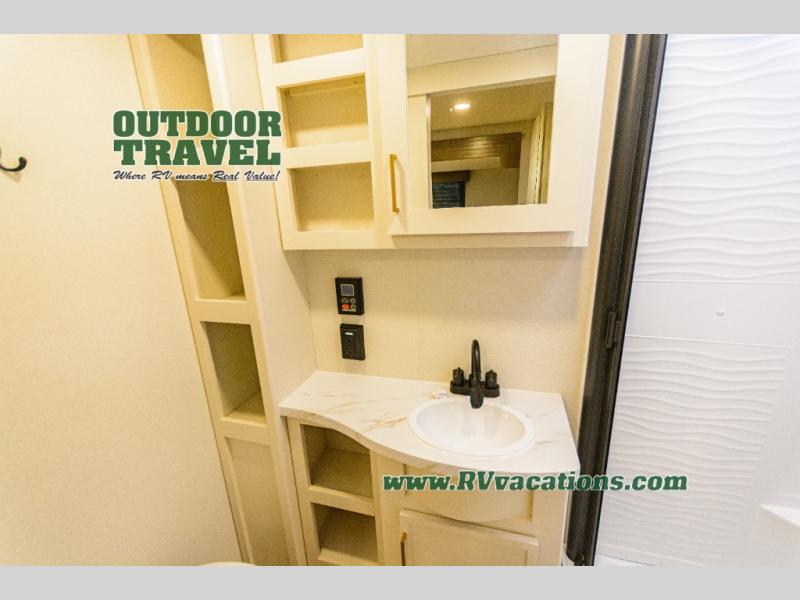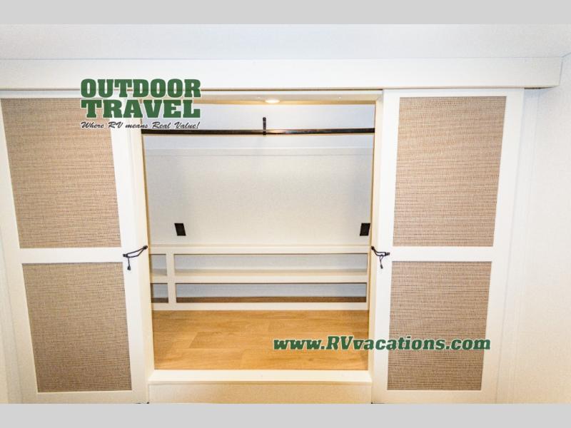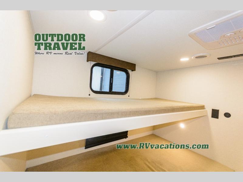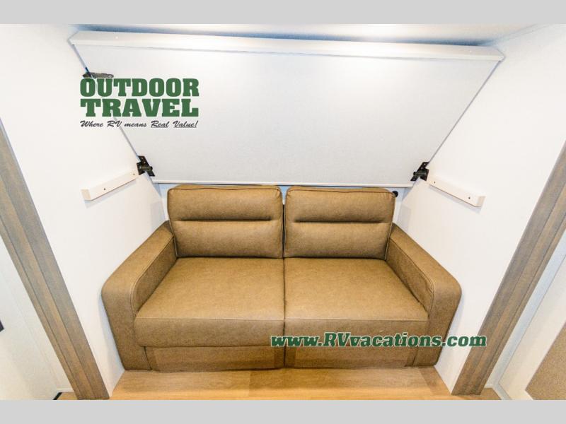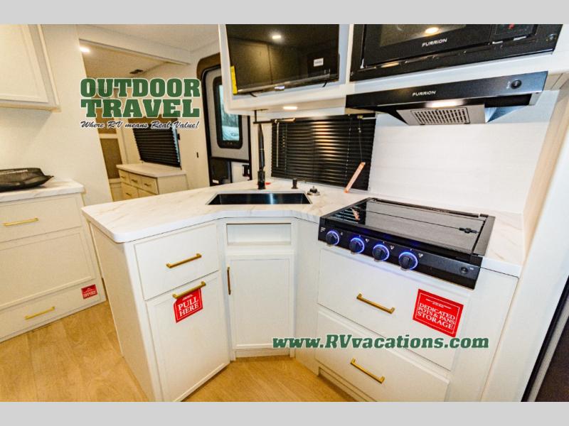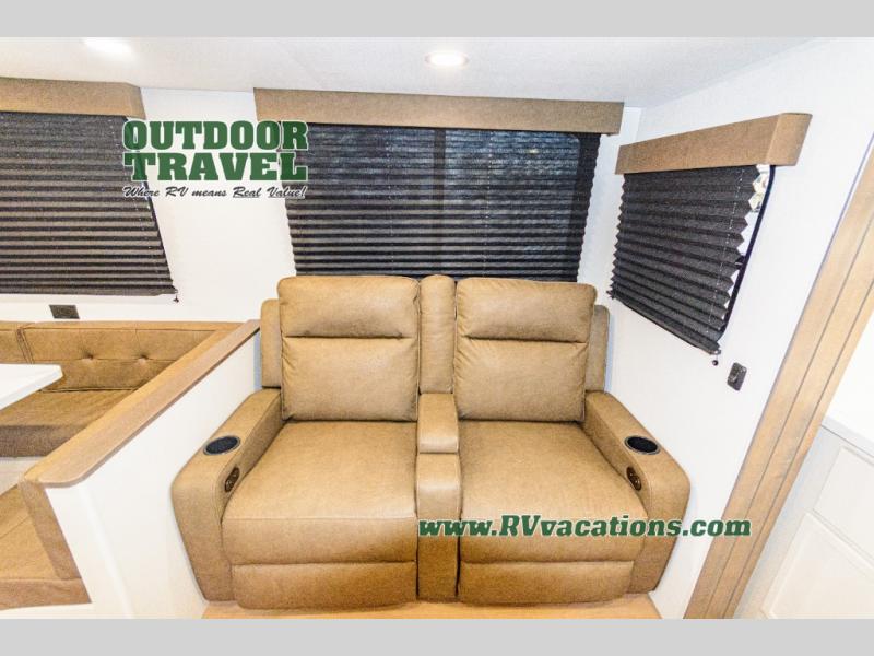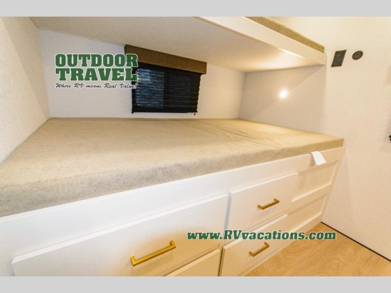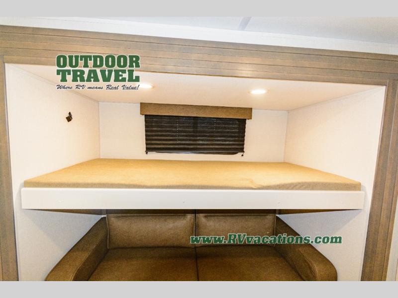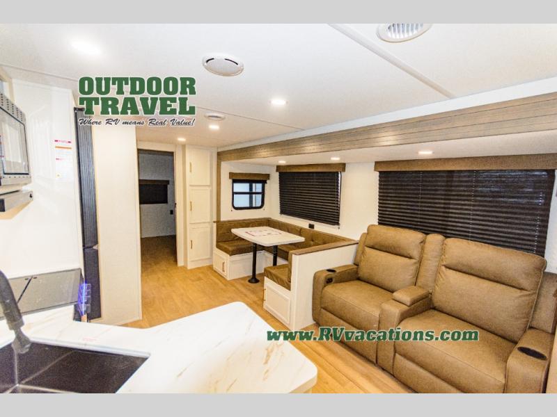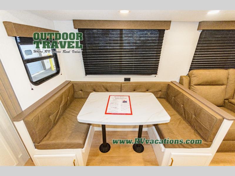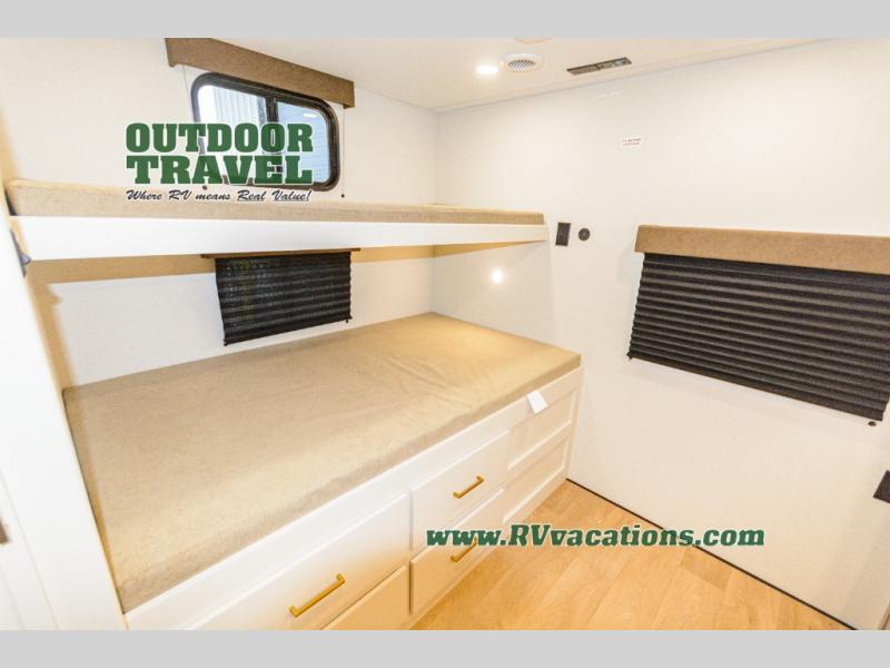 If you're looking for a travel trailer that can house your whole gang, this unit is the one! The rear private bunkhouse can sleep up to five since there is a sleeper sofa and three bunks, plus there are storage drawers for your guests' things. A front private bedroom will be perfect for the owners with a queen bed slide out and spacious front closet with washer and dryer prep! Whether you cook outside on the exterior griddle or inside on the three burner range, you'll be able to make your best meals. There is also a 12V French door refrigerator with a glass front and bottom freezer and a convection microwave/combo air fryer to enjoy some crispy fries! A U-shaped dinette and 60" sleeper sofa within the living room slide provides even more seating and sleeping space, or you can choose the optional theater seating!