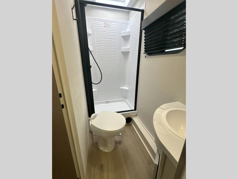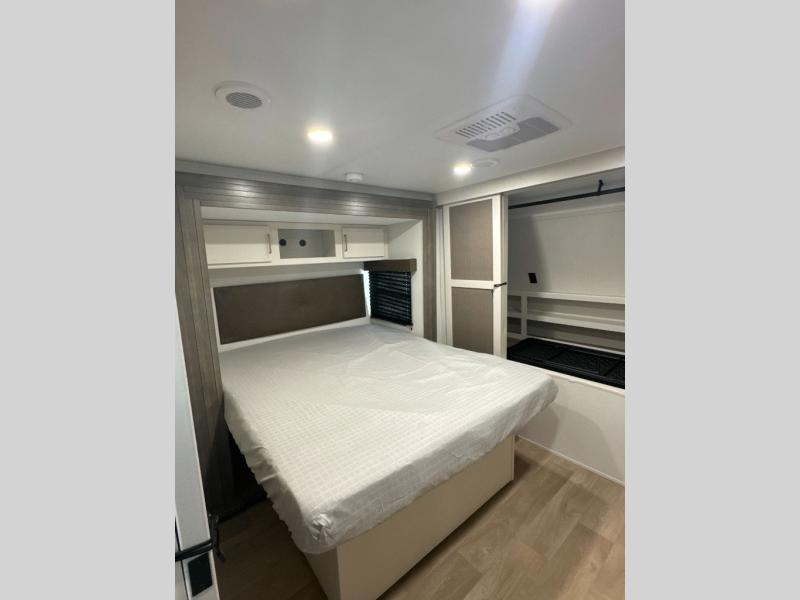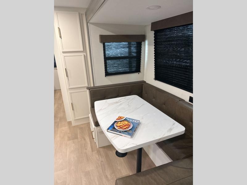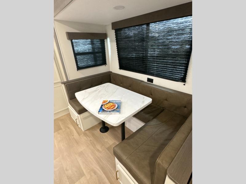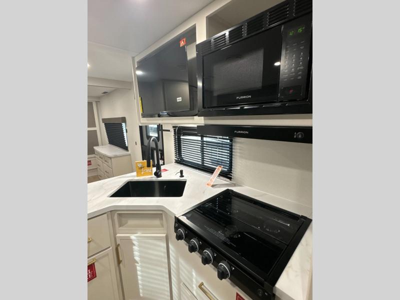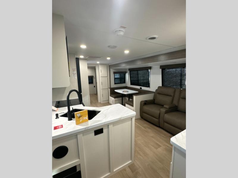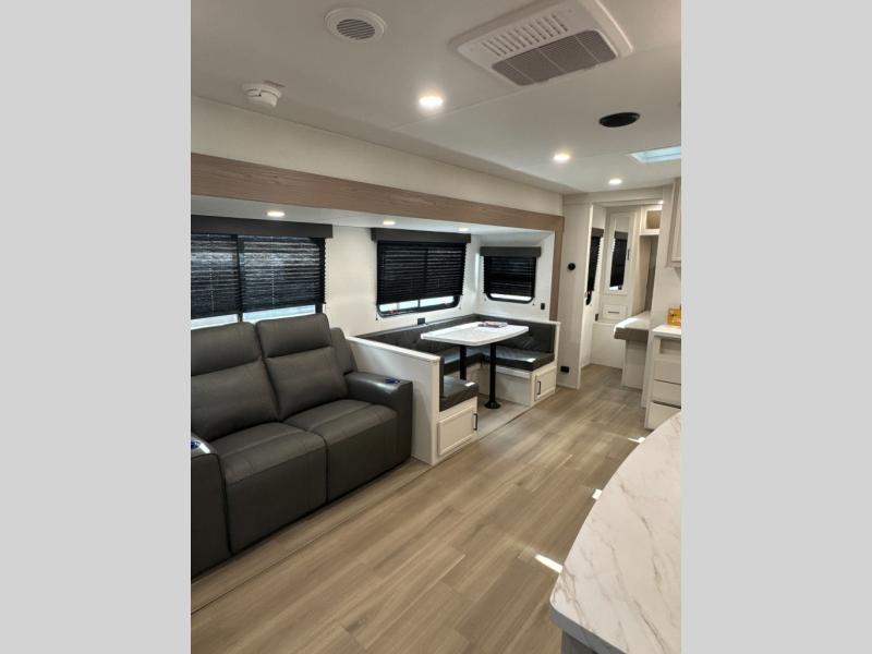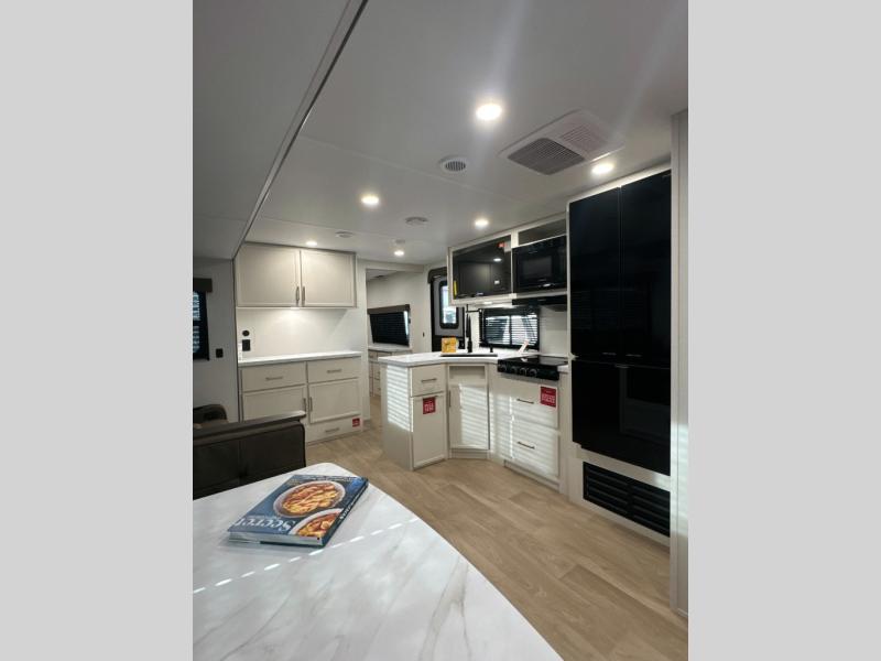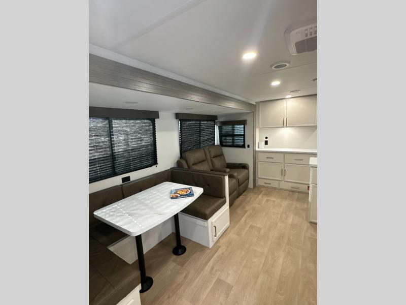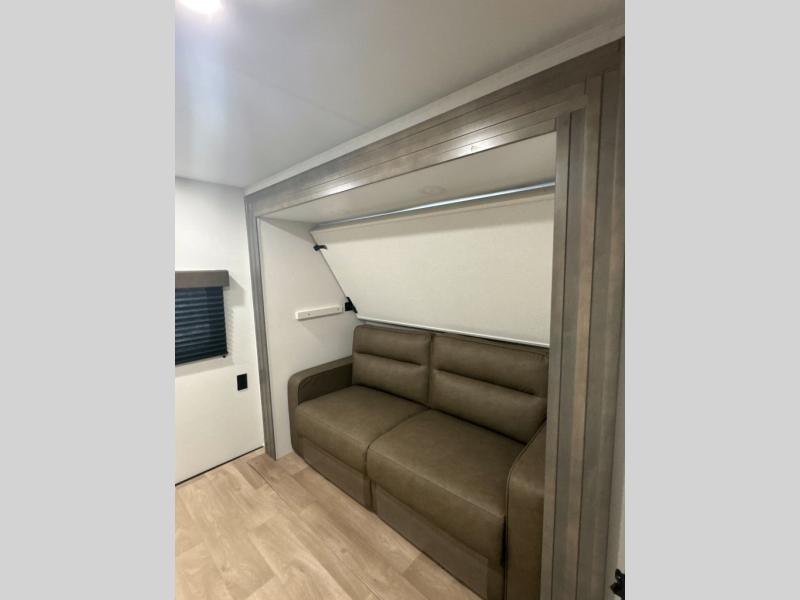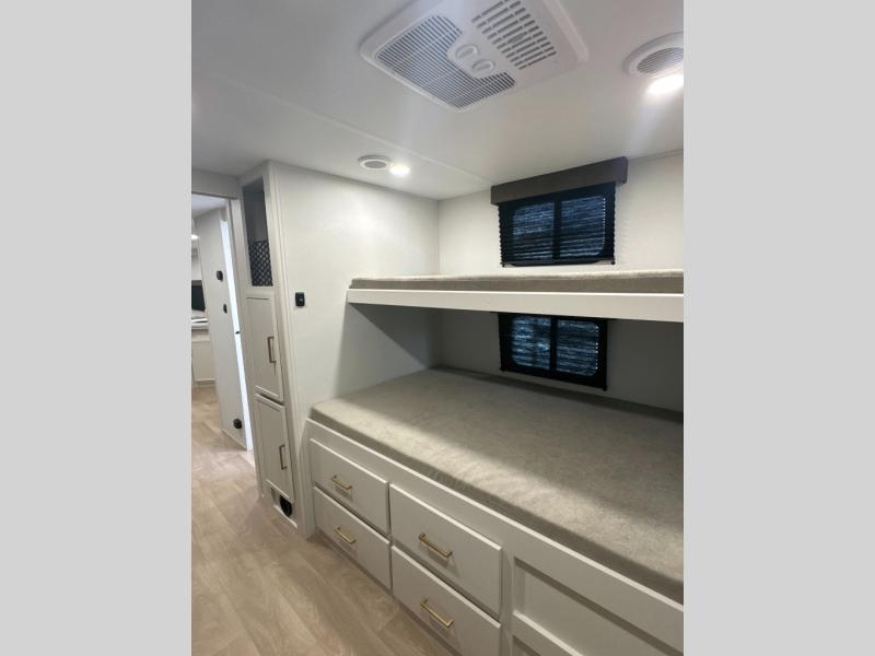 If you're looking for a travel trailer that can house your whole gang, this unit is the one! The rear private bunkhouse can sleep up to five since there is a sleeper sofa and three bunks, plus there are storage drawers for your guests' things. A front private bedroom will be perfect for the owners with a queen bed slide out and spacious front closet with washer and dryer prep! Whether you cook outside on the exterior griddle or inside on the three burner range, you'll be able to make your best meals. There is also a 12V French door refrigerator with a glass front and bottom freezer and a convection microwave/combo air fryer to enjoy some crispy fries! A U-shaped dinette and 60" sleeper sofa within the living room slide provides even more seating and sleeping space, or you can choose the optional theater seating!