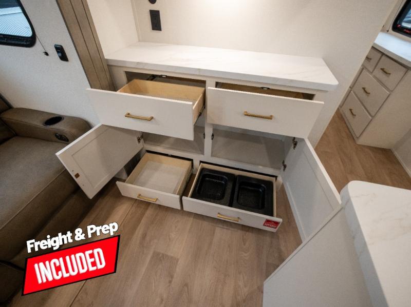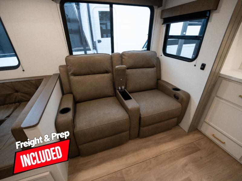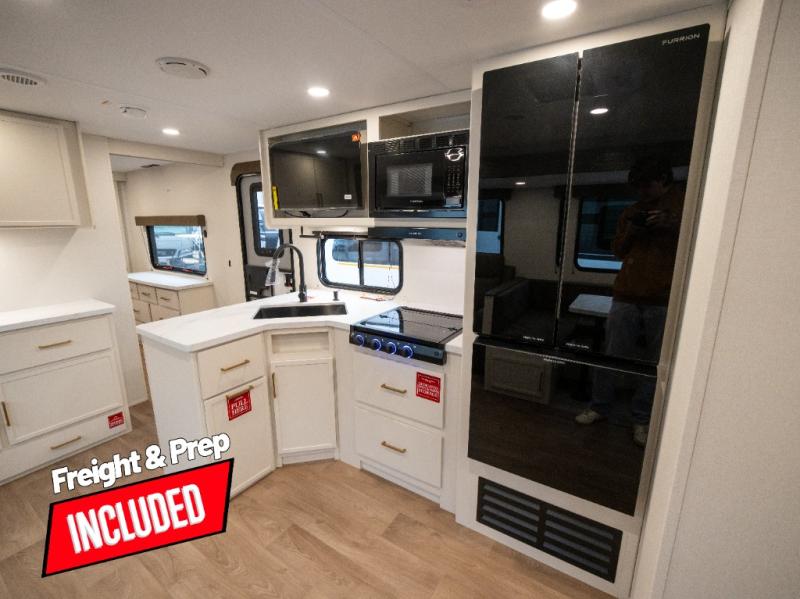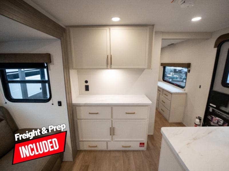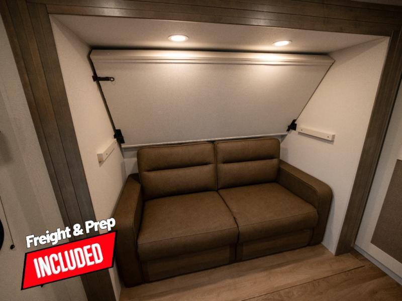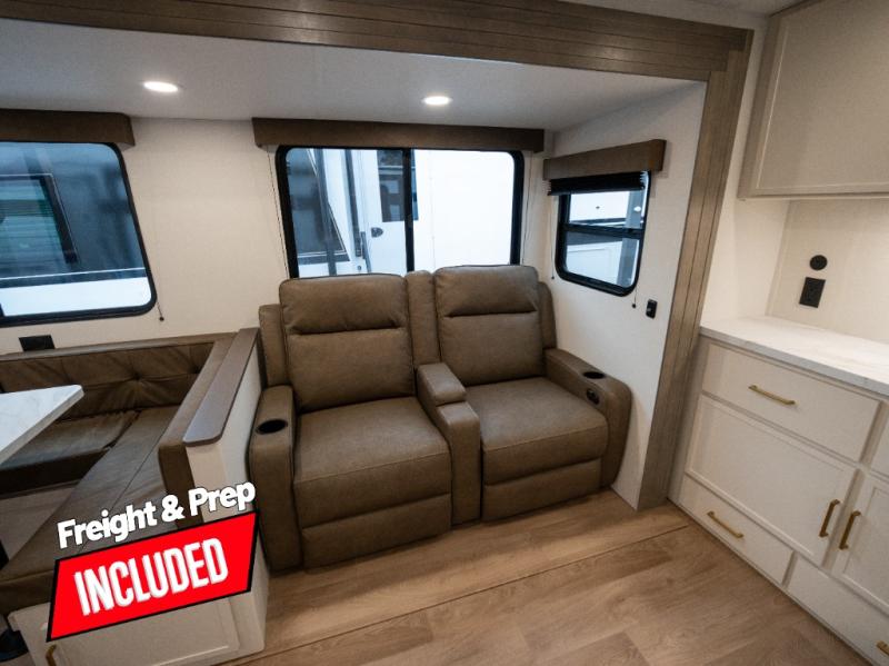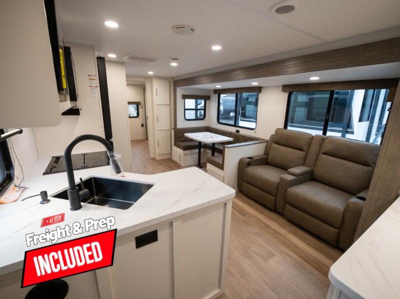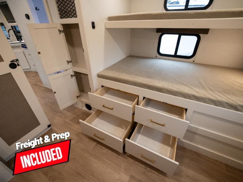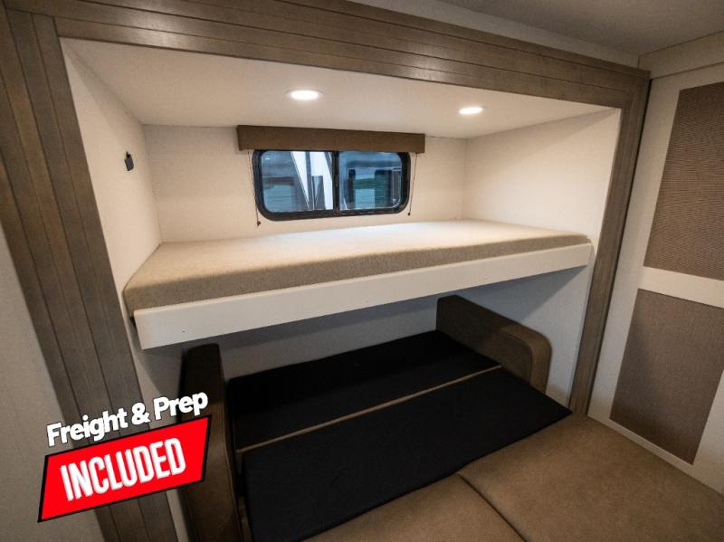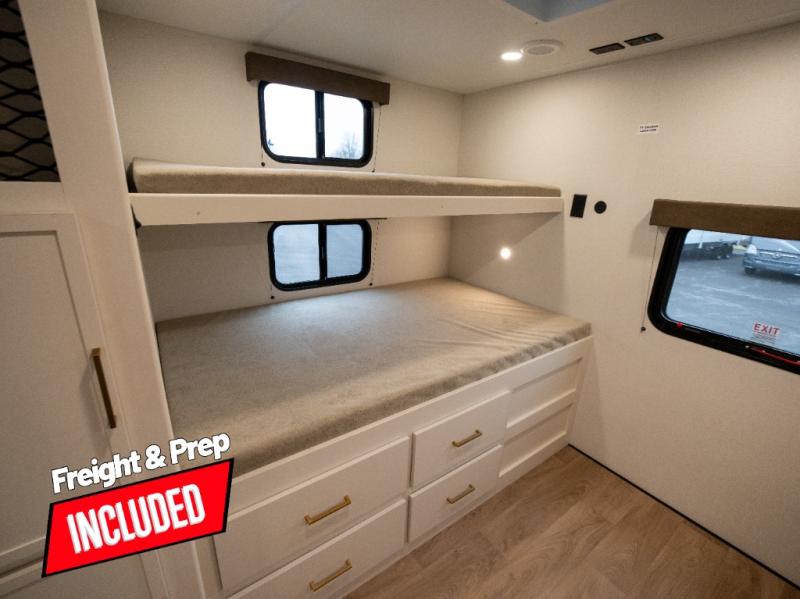 If you're looking for a travel trailer that can house your whole gang, this unit is the one! The rear private bunkhouse can sleep up to five since there is a sleeper sofa and three bunks, plus there are storage drawers for your guests' things. A front private bedroom will be perfect for the owners with a queen bed slide out and spacious front closet with washer and dryer prep! Whether you cook outside on the exterior griddle or inside on the three burner range, you'll be able to make your best meals. There is also a 12V French door refrigerator with a glass front and bottom freezer and a convection microwave/combo air fryer to enjoy some crispy fries! A U-shaped dinette and 60" sleeper sofa within the living room slide provides even more seating and sleeping space, or you can choose the optional theater seating!