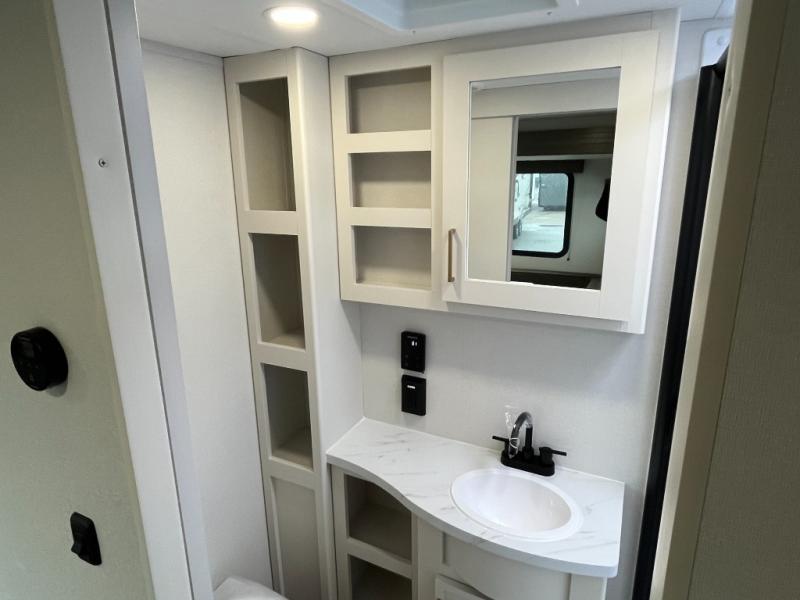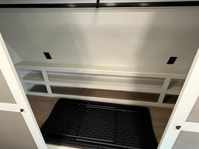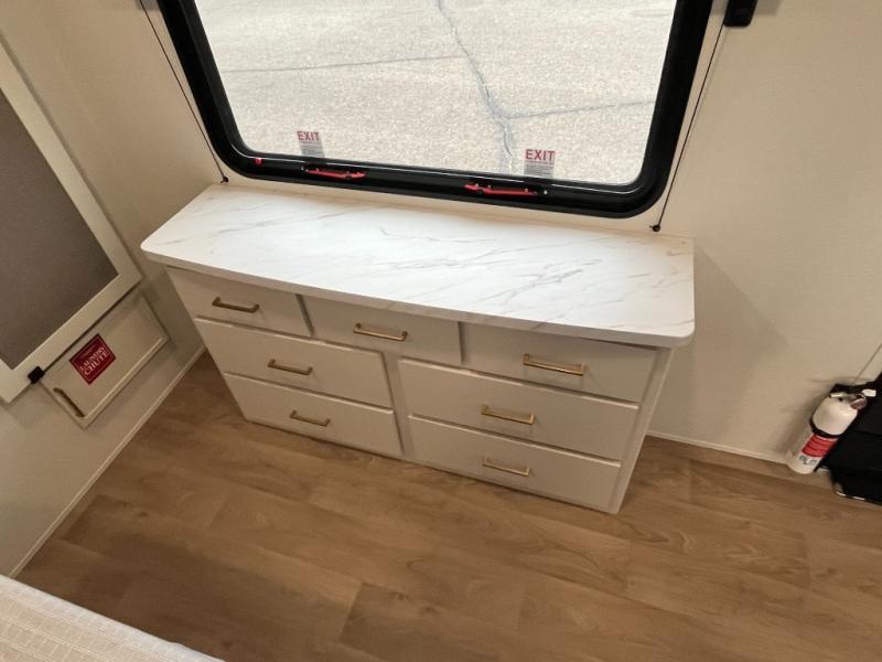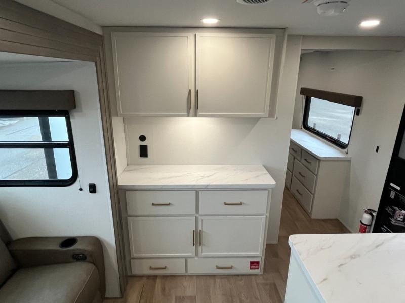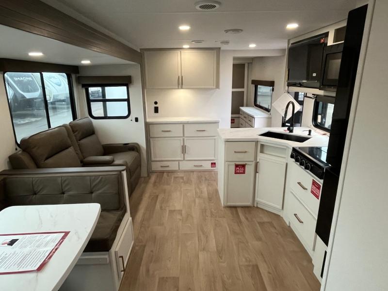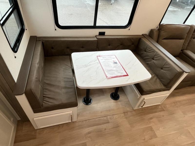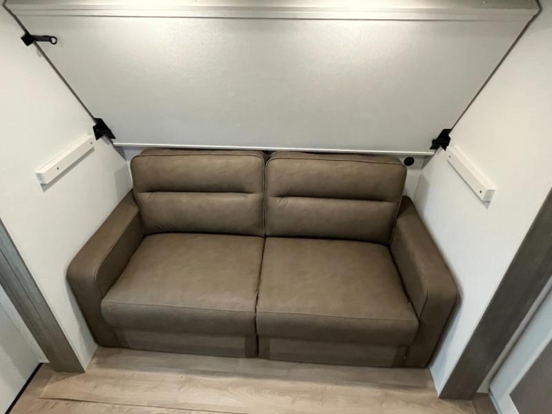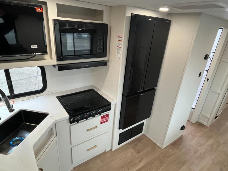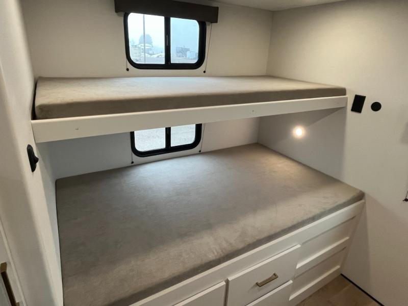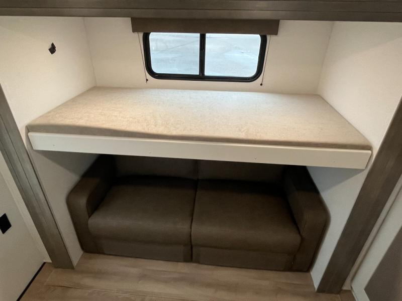 If you're looking for a travel trailer that can house your whole gang, this unit is the one! The rear private bunkhouse can sleep up to five since there is a sleeper sofa and three bunks, plus there are storage drawers for your guests' things. A front private bedroom will be perfect for the owners with a queen bed slide out and spacious front closet with washer and dryer prep! Whether you cook outside on the exterior griddle or inside on the three burner range, you'll be able to make your best meals. There is also a 12V French door refrigerator with a glass front and bottom freezer and a convection microwave/combo air fryer to enjoy some crispy fries! A U-shaped dinette and 60" sleeper sofa within the living room slide provides even more seating and sleeping space, or you can choose the optional theater seating!