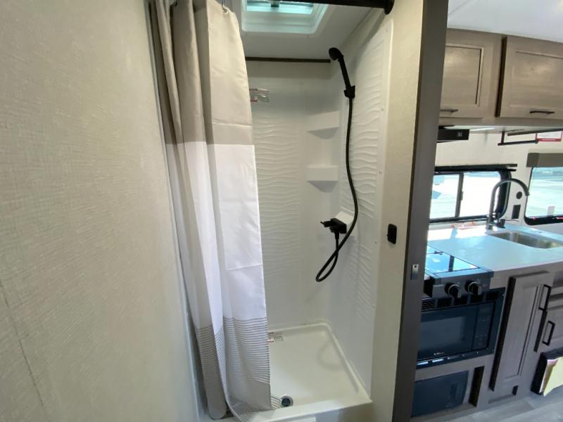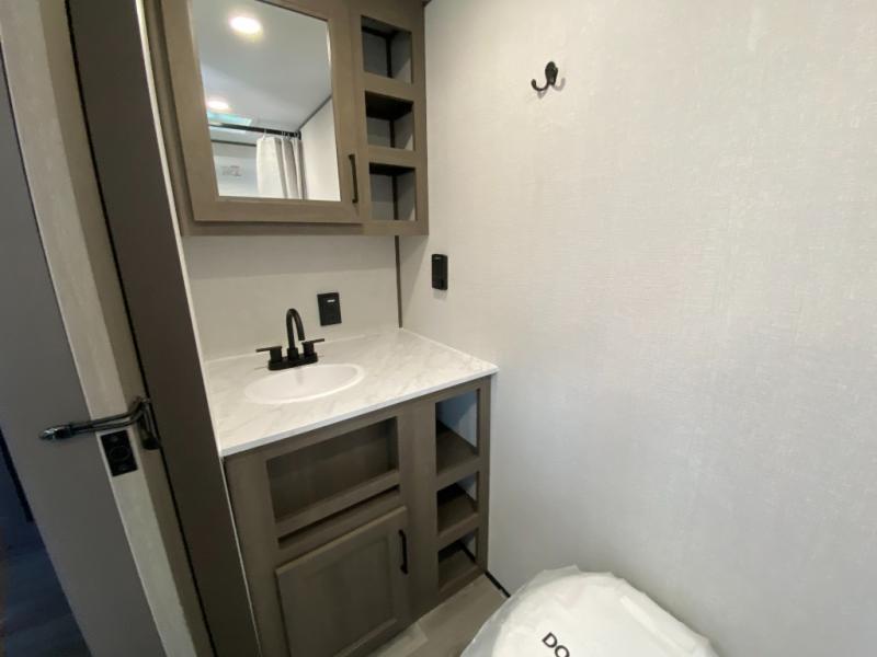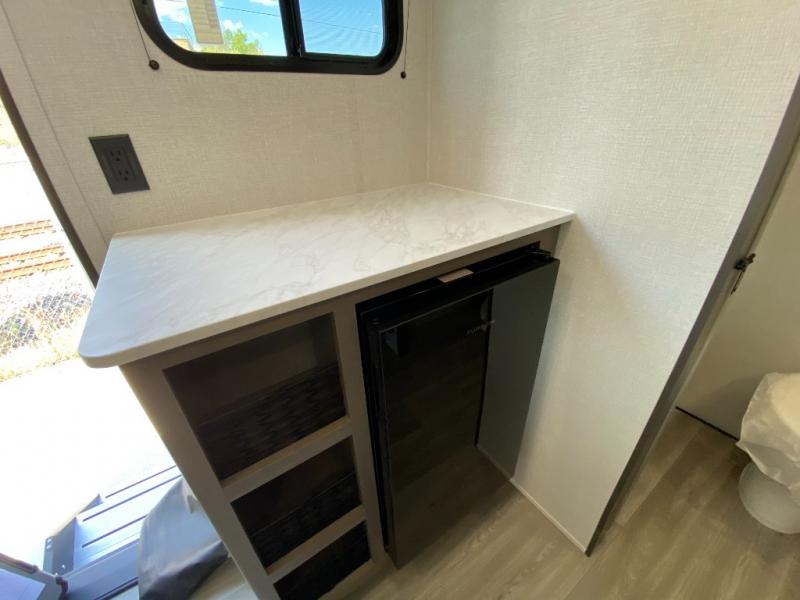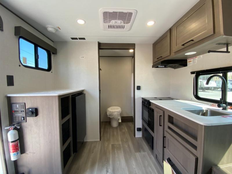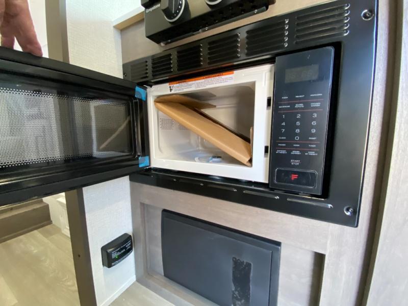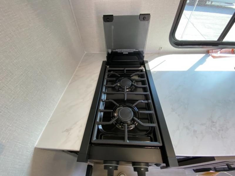 Travel in this 131DL model and step inside through the sturdy aluminum entry steps and you'll be greeted by a versatile 60" x 80" Murphy bed that doubles as a comfortable seating area during the day—perfect for relaxing with your furry companion, thanks to the included pet dish. In the center, the kitchen offers all the essentials for preparing a delicious meal, featuring a microwave, 2-burner range, 3.3 cu. ft. refrigerator, and overhead cabinets for added storage. At the rear, enjoy the convenience of a full bathroom complete with a walk-in shower and foot-flush toilet, making life on the road both comfortable and functional.