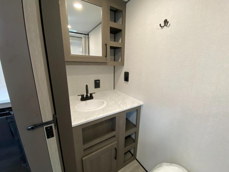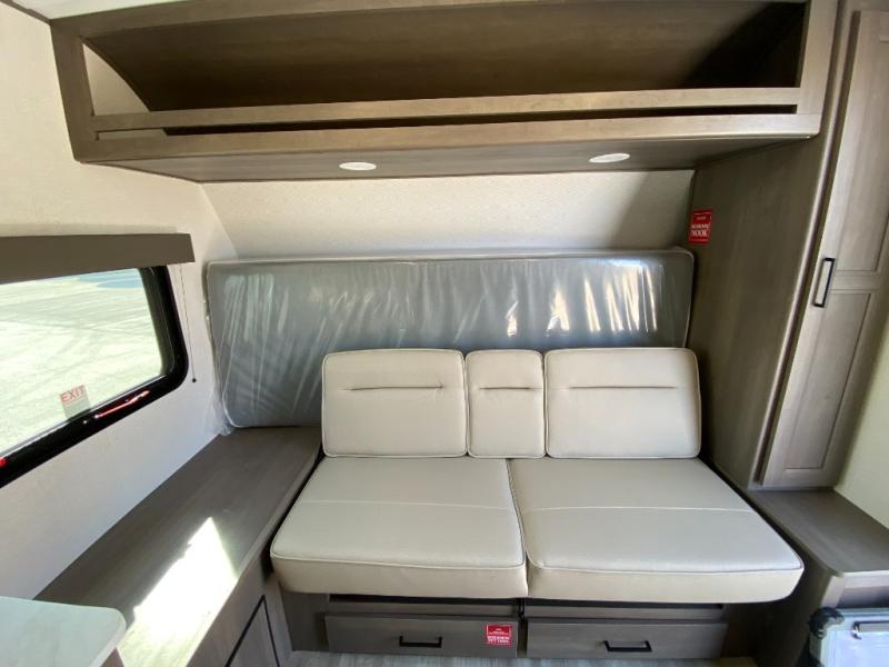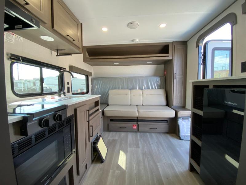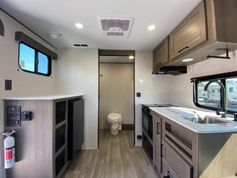 Travel in this 131DL model and step inside through the sturdy aluminum entry steps and you'll be greeted by a versatile 60" x 80" Murphy bed that doubles as a comfortable seating area during the day—perfect for relaxing with your furry companion, thanks to the included pet dish. In the center, the kitchen offers all the essentials for preparing a delicious meal, featuring a microwave, 2-burner range, 3.3 cu. ft. refrigerator, and overhead cabinets for added storage. At the rear, enjoy the convenience of a full bathroom complete with a walk-in shower and foot-flush toilet, making life on the road both comfortable and functional.