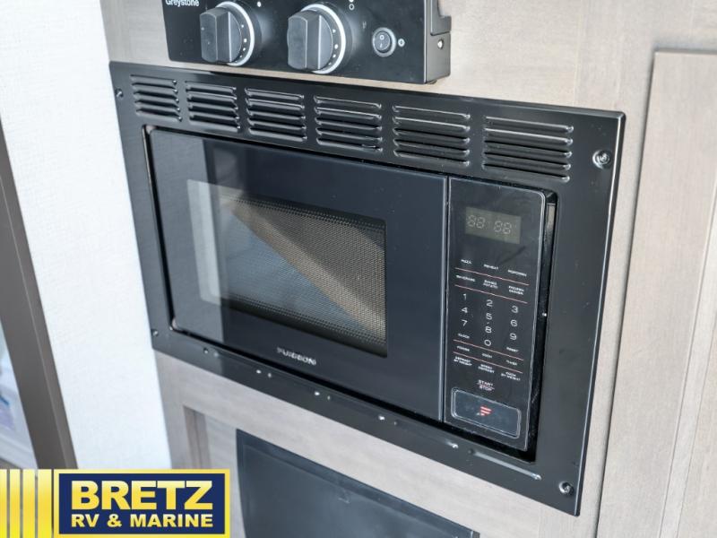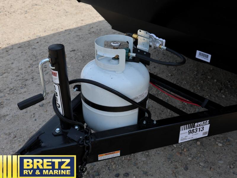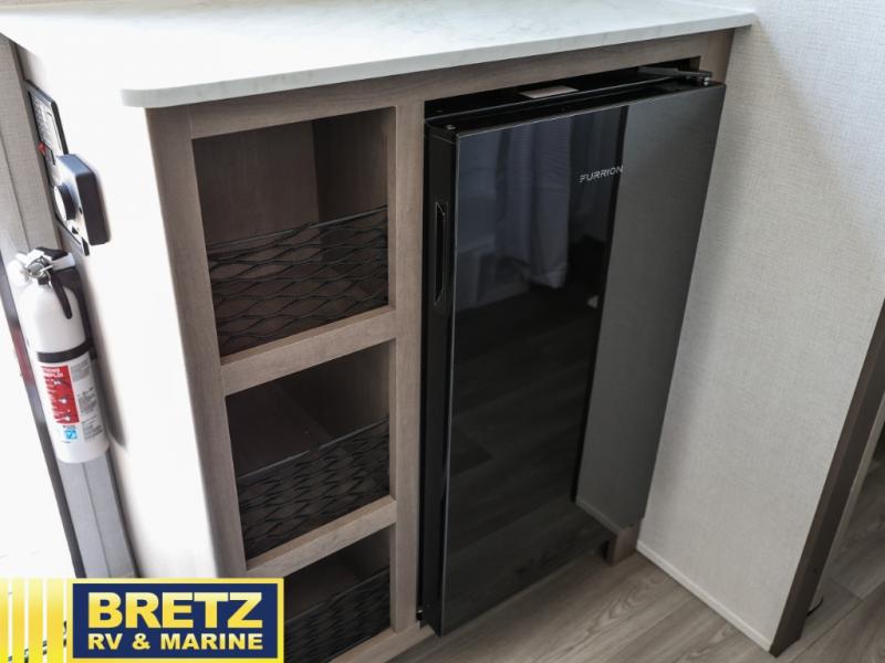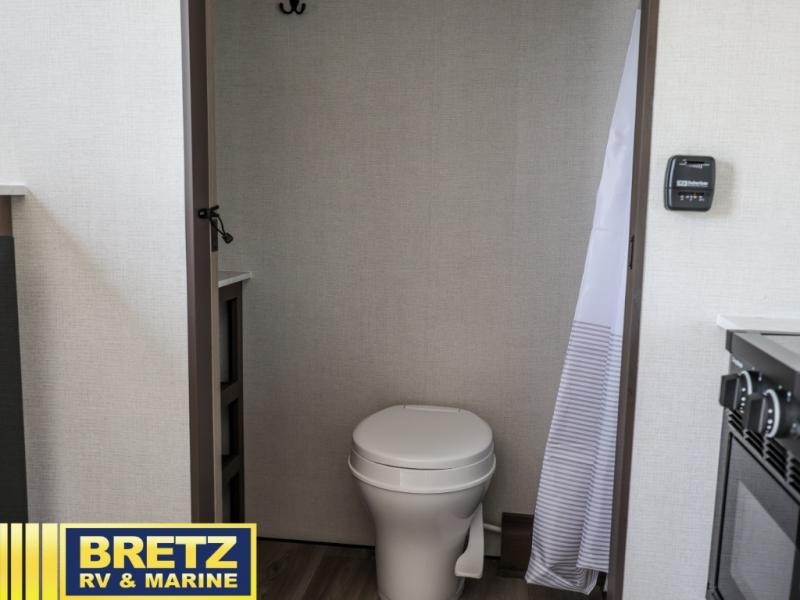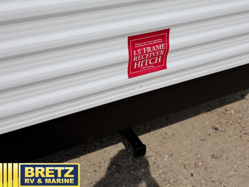Travel in this 131DL model and step inside through the sturdy aluminum entry steps and you'll be greeted by a versatile 60" x 80" Murphy bed that doubles as a comfortable seating area during the day—perfect for relaxing with your furry companion, thanks to the included pet dish. In the center, the kitchen offers all the essentials for preparing a delicious meal, featuring a microwave, 2-burner range, 3.3 cu. ft. refrigerator, and overhead cabinets for added storage. At the rear, enjoy the convenience of a full bathroom complete with a walk-in shower and foot-flush toilet, making life on the road both comfortable and functional.