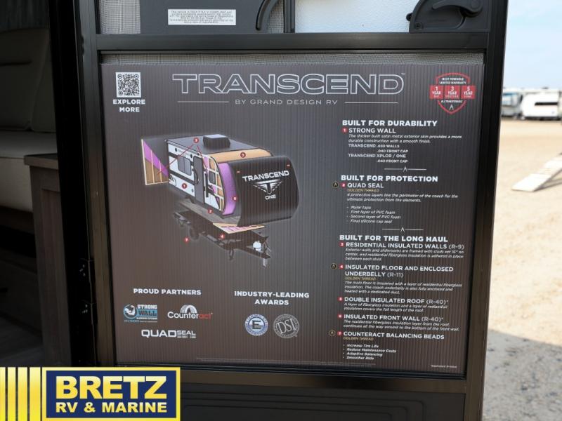 With any Transcend One travel trailer by Grand Design, you will enjoy lightweight towing thanks to their single-axle. There are many interior comforts to make camping easier than ever, such as recessed lighting, residential countertops, and a 6' 6" interior height. Each model is constructed with a heated and enclosed underbelly with suspended tanks, a moisture barrier floor enclosure, and Thermofoil over the roof and front cap for added protection. And a JBL sound system will let you listen to tunes as you visit under the power awning with a Fusion light!
