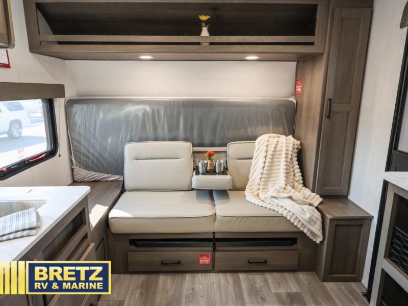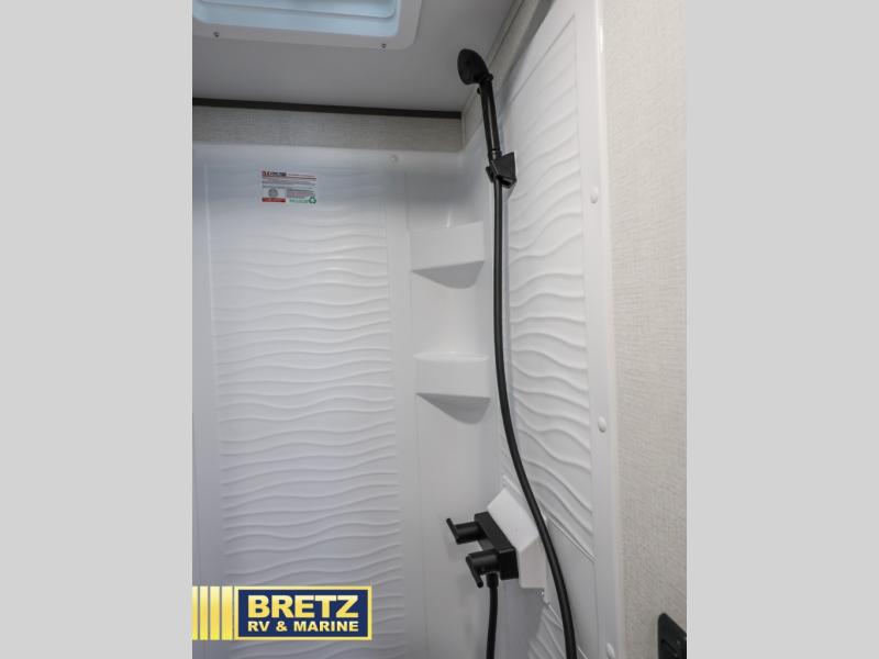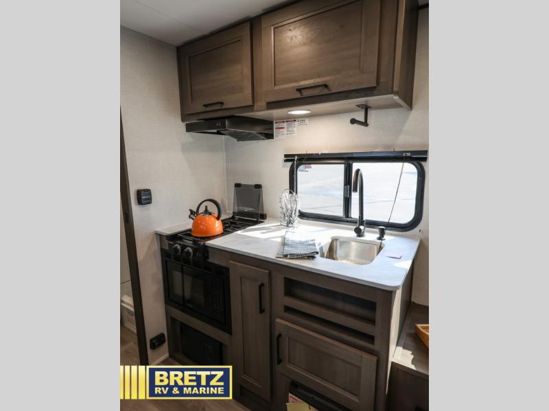 Travel in this 131DL model and step inside through the sturdy aluminum entry steps and you'll be greeted by a versatile 60" x 80" Murphy bed that doubles as a comfortable seating area during the day—perfect for relaxing with your furry companion, thanks to the included pet dish. In the center, the kitchen offers all the essentials for preparing a delicious meal, featuring a microwave, 2-burner range, 3.3 cu. ft. refrigerator, and overhead cabinets for added storage. At the rear, enjoy the convenience of a full bathroom complete with a walk-in shower and foot-flush toilet, making life on the road both comfortable and functional.