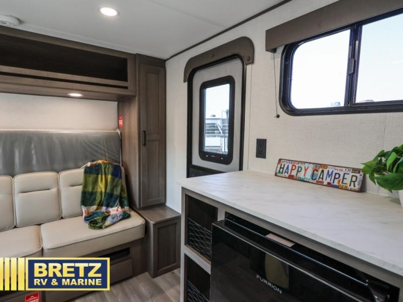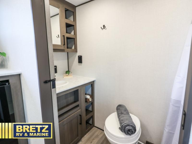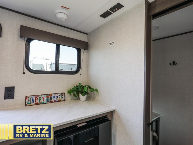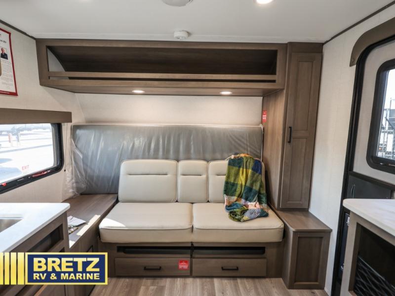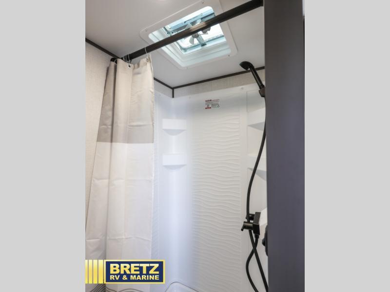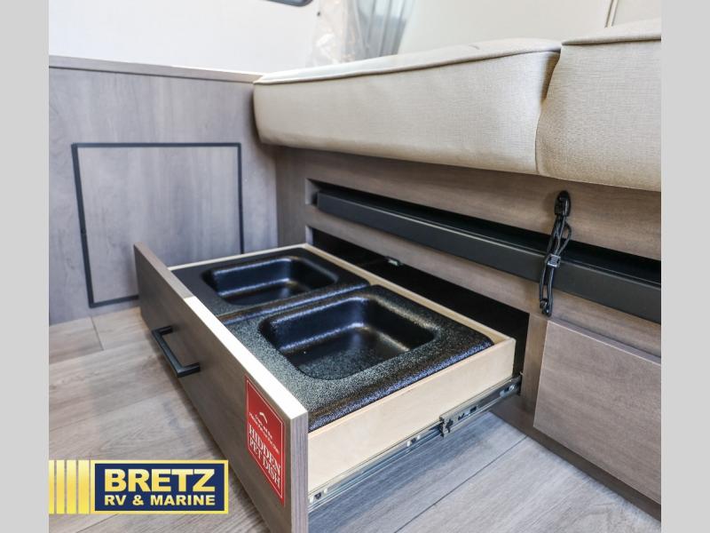 Travel in this 131DL model and step inside through the sturdy aluminum entry steps and you'll be greeted by a versatile 60" x 80" Murphy bed that doubles as a comfortable seating area during the day—perfect for relaxing with your furry companion, thanks to the included pet dish. In the center, the kitchen offers all the essentials for preparing a delicious meal, featuring a microwave, 2-burner range, 3.3 cu. ft. refrigerator, and overhead cabinets for added storage. At the rear, enjoy the convenience of a full bathroom complete with a walk-in shower and foot-flush toilet, making life on the road both comfortable and functional.