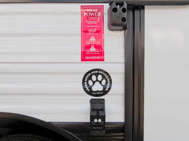 - Power awning with LED lighting, magnetic storage door catches, and exterior leash link/bottle opener.