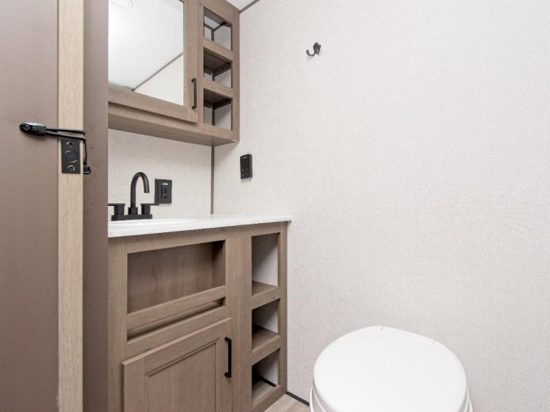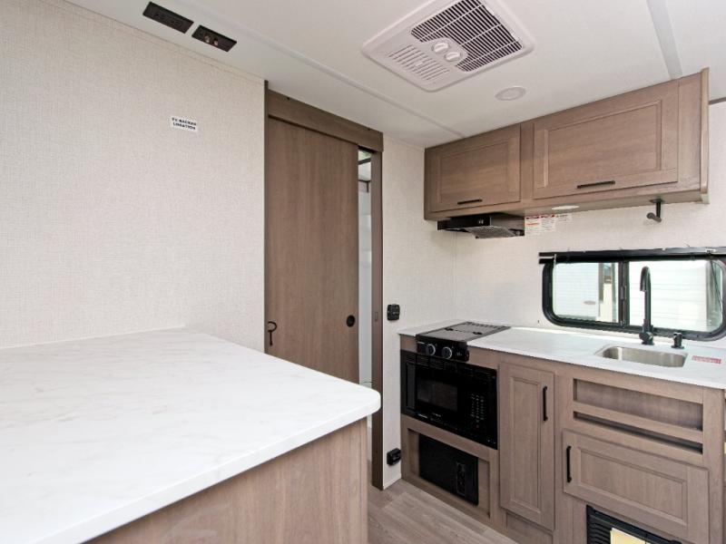 - Fully equipped kitchen featuring a 2-burner range, microwave, and 3.3 cu. ft. 12V glass-front refrigerator.