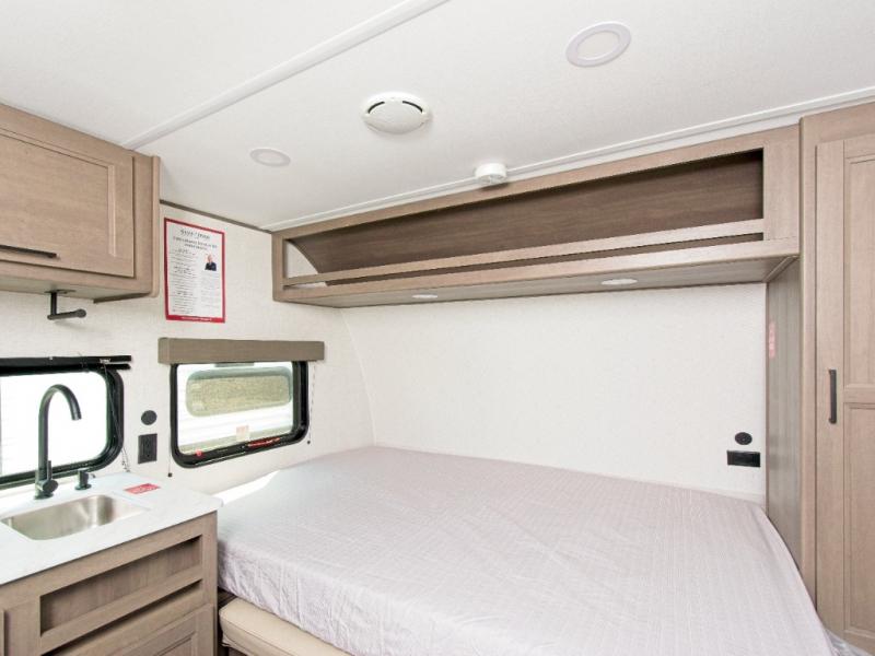 - Sleeps 2 with a 60" x 80" queen Murphy bed that folds away to maximize living space.
