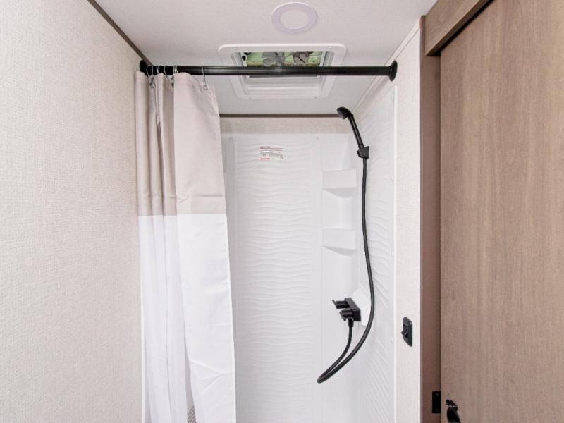 - All-in-one wet bath with a walk-in shower and foot flush toilet.