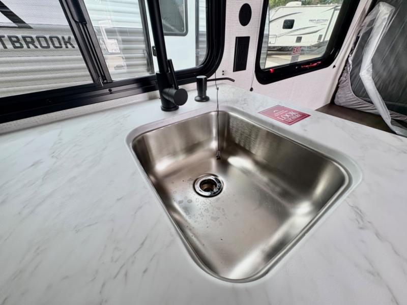 Fully Equipped Kitchen – The kitchen includes a refrigerator, microwave, two-burner cooktop, and sink, with cabinetry designed for convenience and organization. Meal preparation on the road has never been easier.