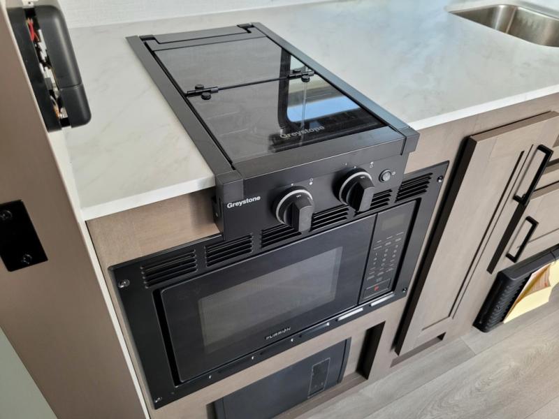 Travel in this 131DL model and tep inside through the sturdy aluminum entry steps and you'll be greeted by a versatile 60" x 80" Murphy bed that doubles as a comfortable seating area during the day—perfect for relaxing with your furry companion, thanks to the included pet dish. In the center, the kitchen offers all the essentials for preparing a delicious meal, featuring a microwave, 2-burner range, 3.3 cu. ft. refrigerator, and overhead cabinets for added storage. At the rear, enjoy the convenience of a full bathroom complete with a walk-in shower and foot-flush toilet, making life on the road both comfortable and functional.