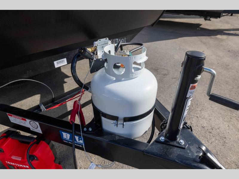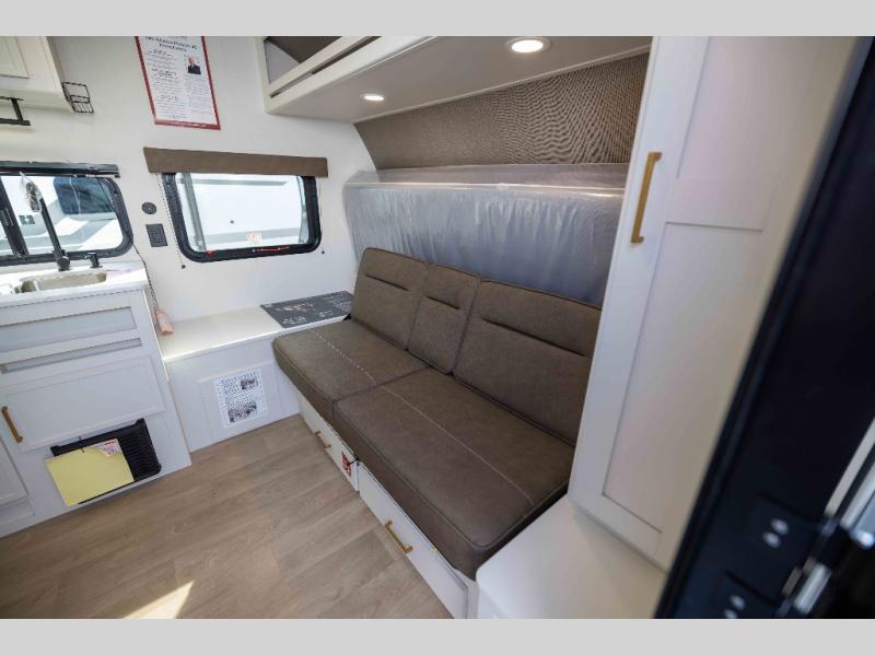 Travel in this 131DL model and step inside through the sturdy aluminum entry steps and you'll be greeted by a versatile 60" x 80" Murphy bed that doubles as a comfortable seating area during the day—perfect for relaxing with your furry companion, thanks to the included pet dish. In the center, the kitchen offers all the essentials for preparing a delicious meal, featuring a microwave, 2-burner range, 3.3 cu. ft. refrigerator, and overhead cabinets for added storage. At the rear, enjoy the convenience of a full bathroom complete with a walk-in shower and foot-flush toilet, making life on the road both comfortable and functional.