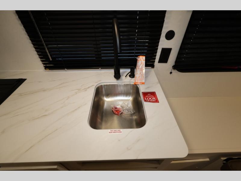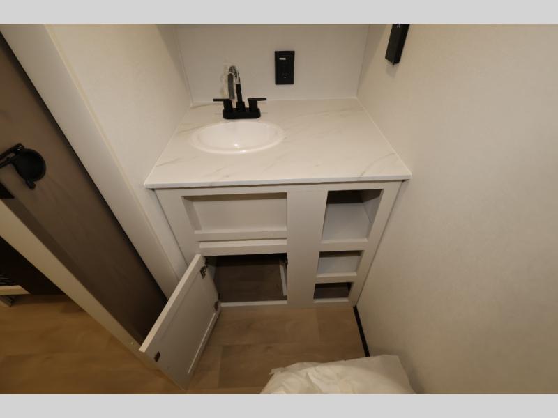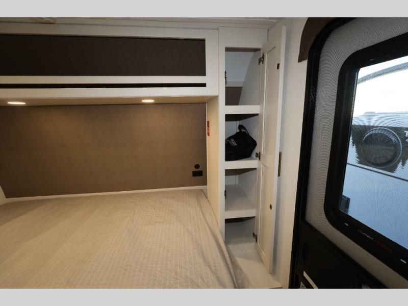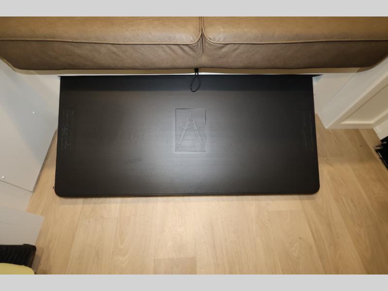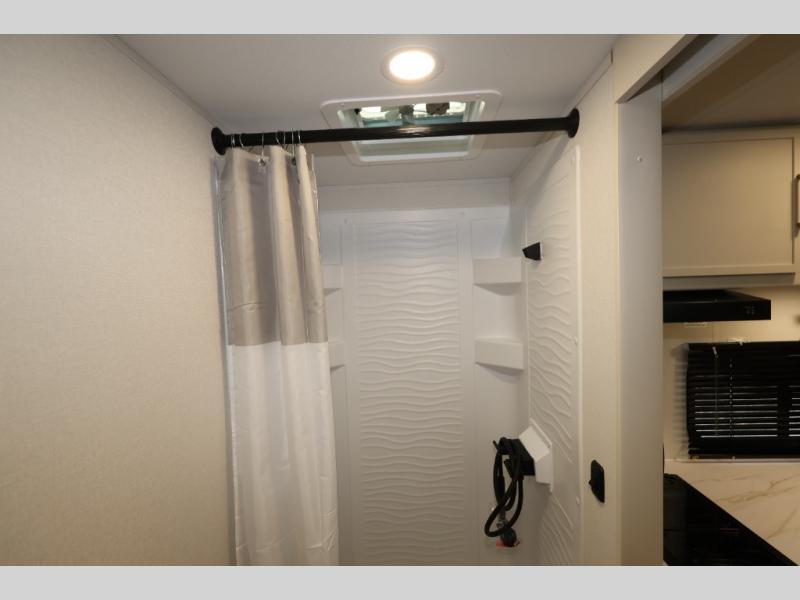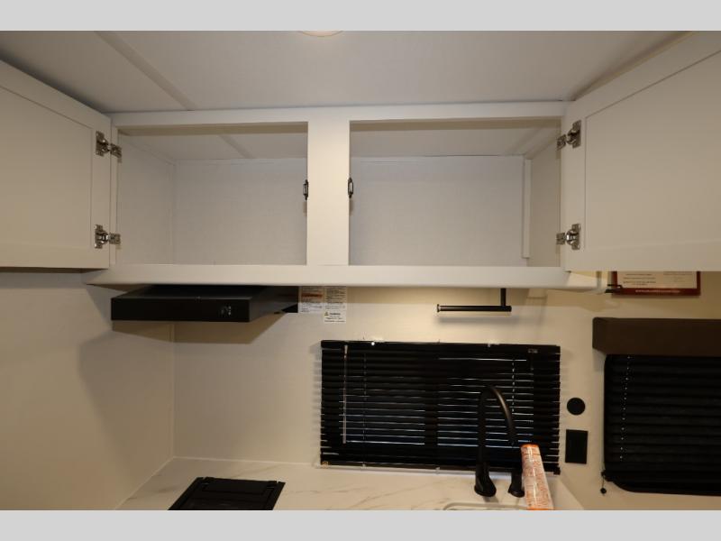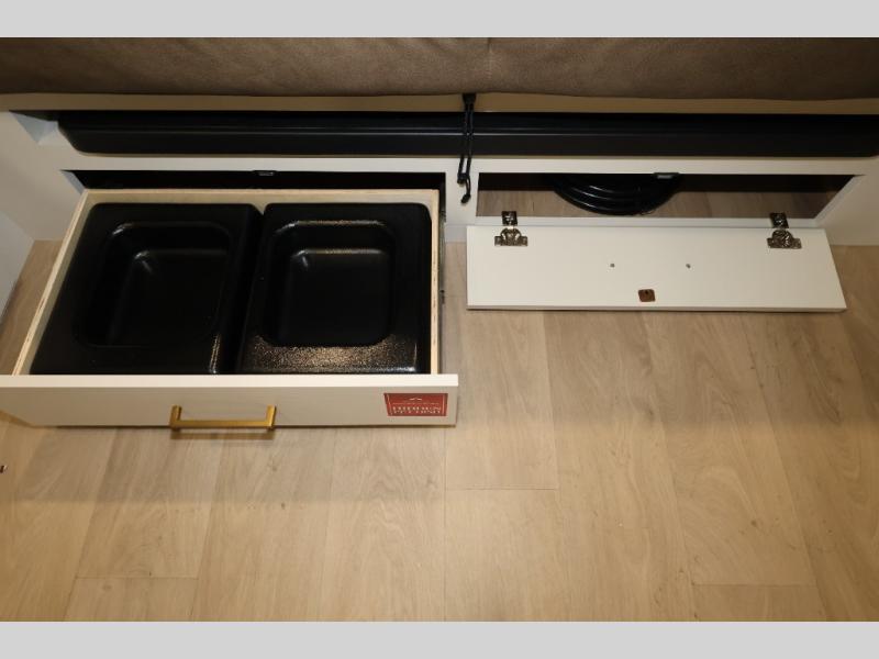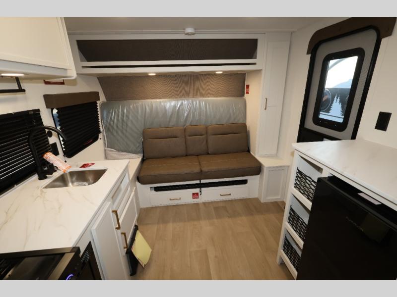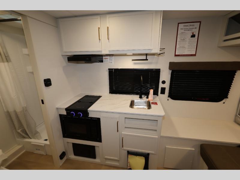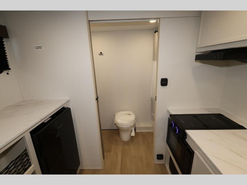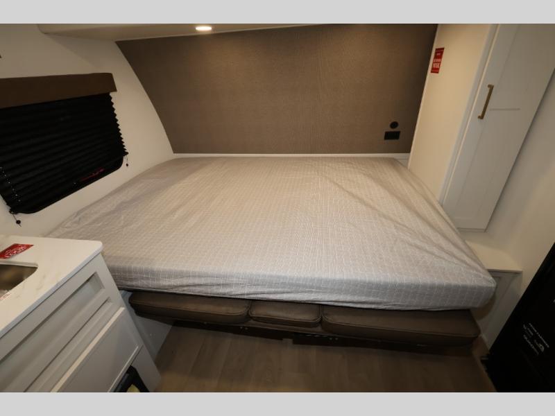 Travel in this 131DL model and step inside through the sturdy aluminum entry steps and you'll be greeted by a versatile 60" x 80" Murphy bed that doubles as a comfortable seating area during the day—perfect for relaxing with your furry companion, thanks to the included pet dish. In the center, the kitchen offers all the essentials for preparing a delicious meal, featuring a microwave, 2-burner range, 3.3 cu. ft. refrigerator, and overhead cabinets for added storage. At the rear, enjoy the convenience of a full bathroom complete with a walk-in shower and foot-flush toilet, making life on the road both comfortable and functional.