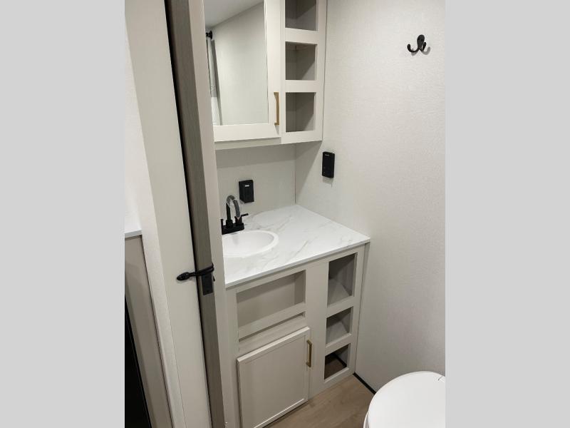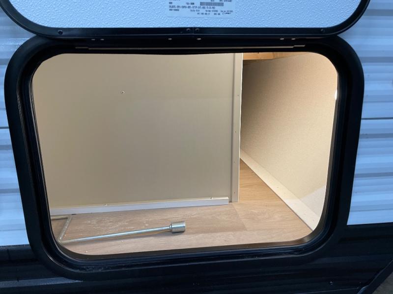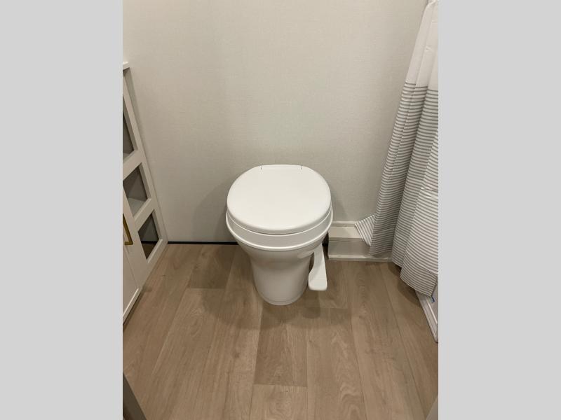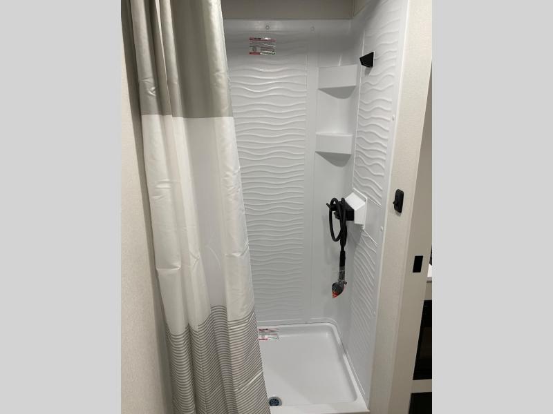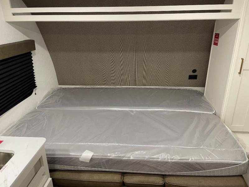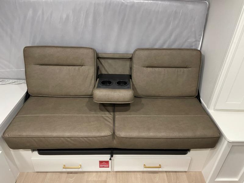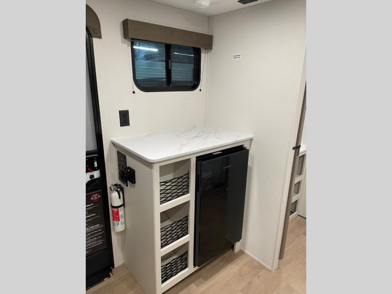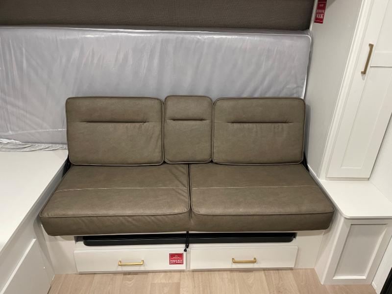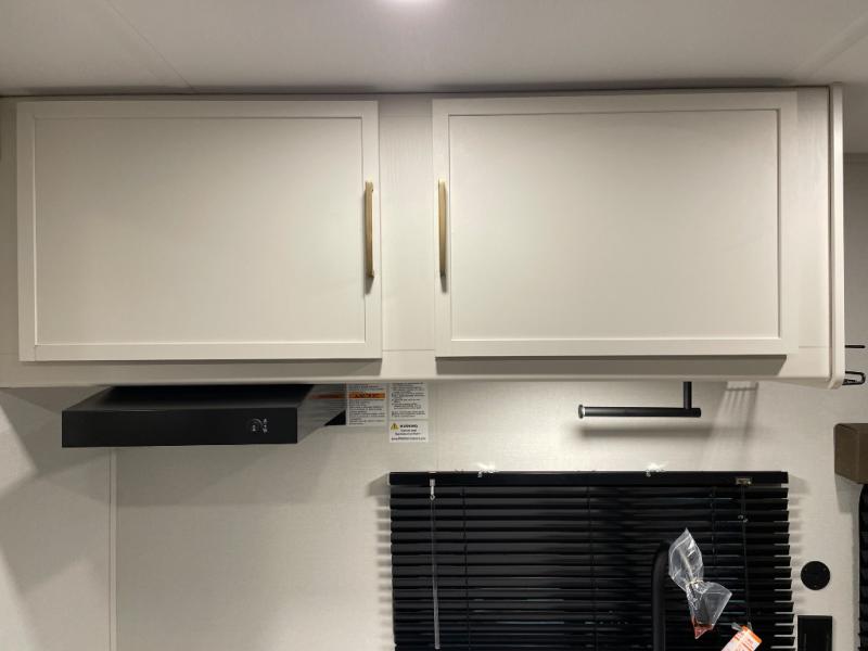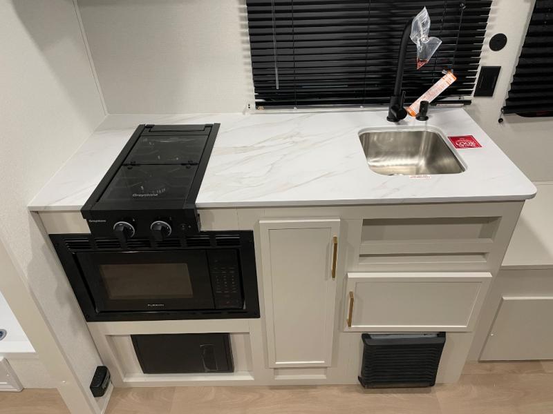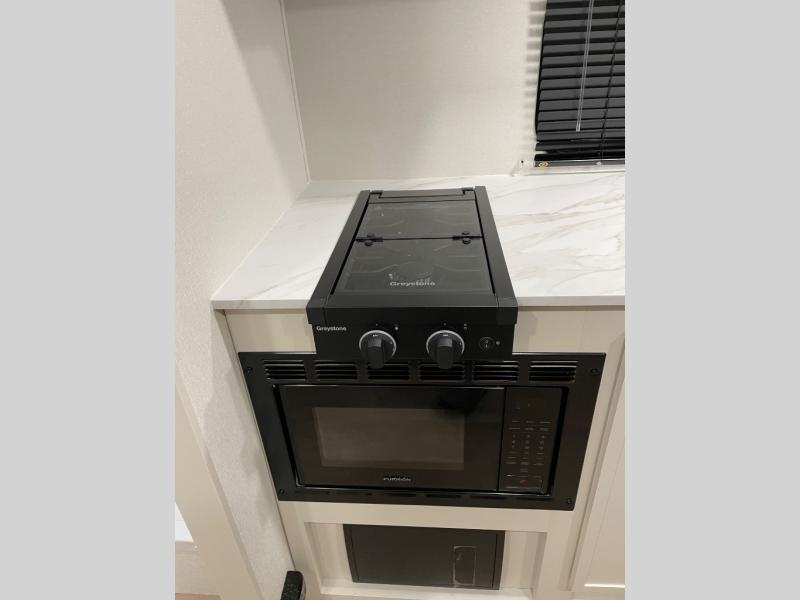 Travel in this 131DL model and step inside through the sturdy aluminum entry steps and you'll be greeted by a versatile 60" x 80" Murphy bed that doubles as a comfortable seating area during the day—perfect for relaxing with your furry companion, thanks to the included pet dish. In the center, the kitchen offers all the essentials for preparing a delicious meal, featuring a microwave, 2-burner range, 3.3 cu. ft. refrigerator, and overhead cabinets for added storage. At the rear, enjoy the convenience of a full bathroom complete with a walk-in shower and foot-flush toilet, making life on the road both comfortable and functional.