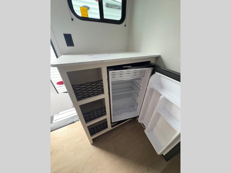 Travel in this 131DL model and step inside through the sturdy aluminum entry steps and you'll be greeted by a versatile 60" x 80" Murphy bed that doubles as a comfortable seating area during the day—perfect for relaxing with your furry companion, thanks to the included pet dish. In the center, the kitchen offers all the essentials for preparing a delicious meal, featuring a microwave, 2-burner range, 3.3 cu. ft. refrigerator, and overhead cabinets for added storage. At the rear, enjoy the convenience of a full bathroom complete with a walk-in shower and foot-flush toilet, making life on the road both comfortable and functional.