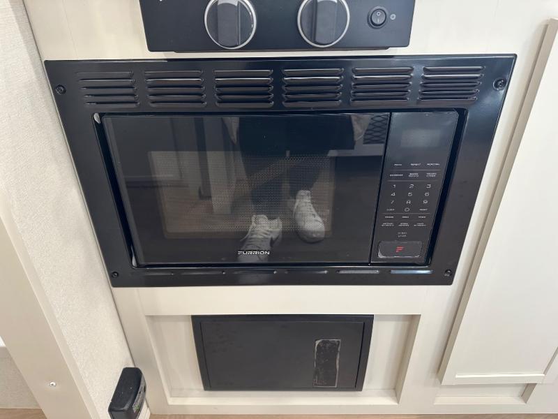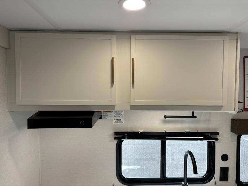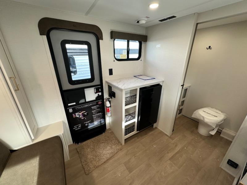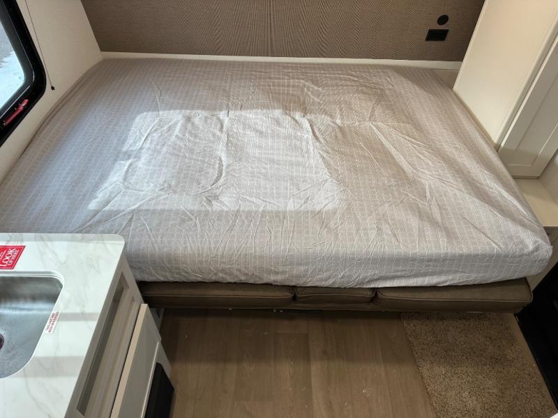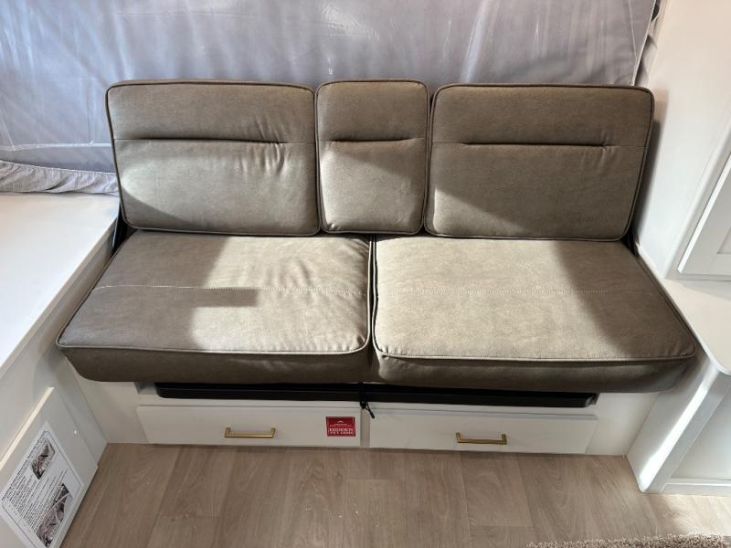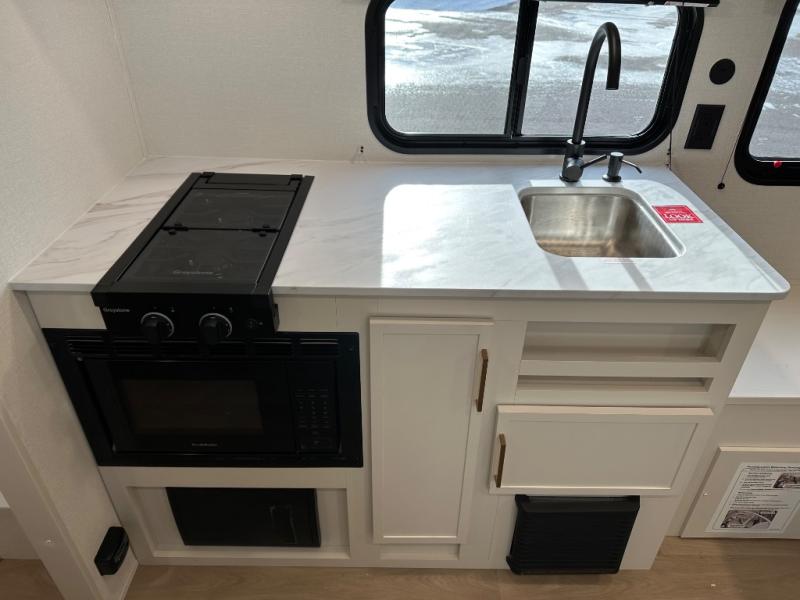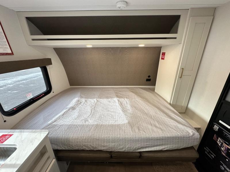 Travel in this 131DL model and step inside through the sturdy aluminum entry steps and you'll be greeted by a versatile 60" x 80" Murphy bed that doubles as a comfortable seating area during the day—perfect for relaxing with your furry companion, thanks to the included pet dish. In the center, the kitchen offers all the essentials for preparing a delicious meal, featuring a microwave, 2-burner range, 3.3 cu. ft. refrigerator, and overhead cabinets for added storage. At the rear, enjoy the convenience of a full bathroom complete with a walk-in shower and foot-flush toilet, making life on the road both comfortable and functional.