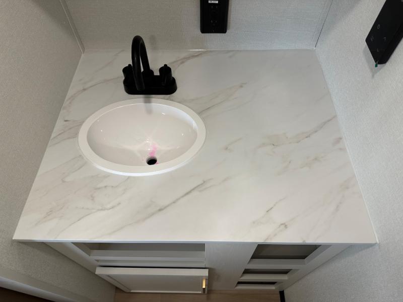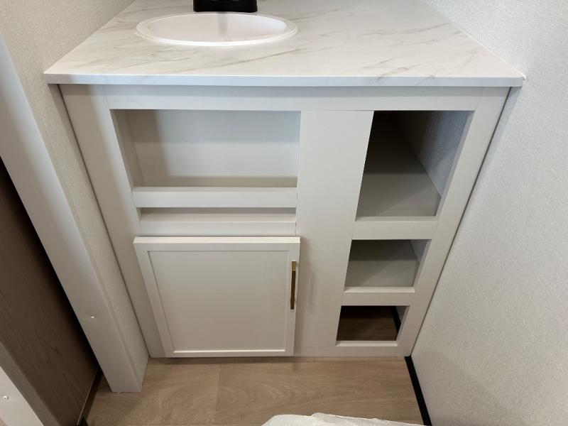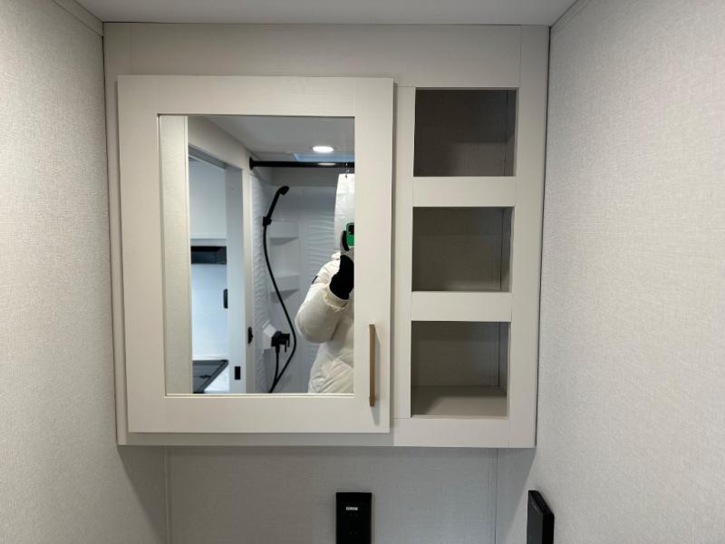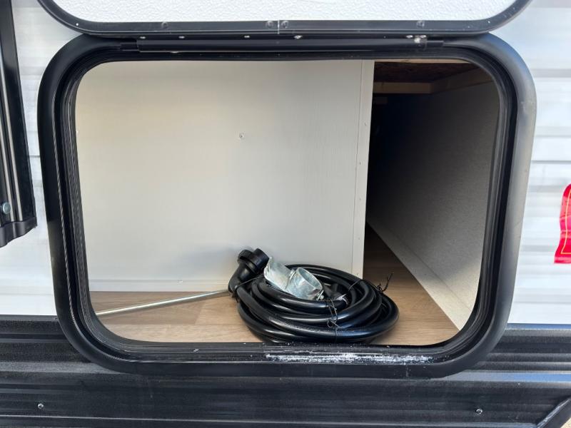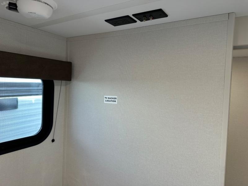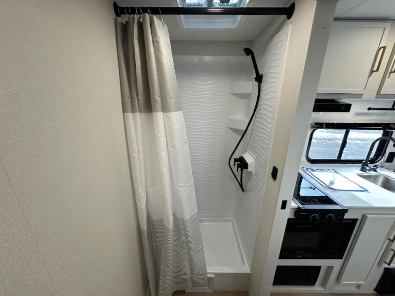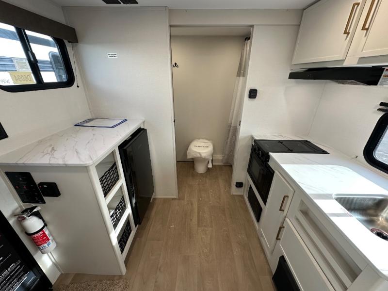 Travel in this 131DL model and step inside through the sturdy aluminum entry steps and you'll be greeted by a versatile 60" x 80" Murphy bed that doubles as a comfortable seating area during the day—perfect for relaxing with your furry companion, thanks to the included pet dish. In the center, the kitchen offers all the essentials for preparing a delicious meal, featuring a microwave, 2-burner range, 3.3 cu. ft. refrigerator, and overhead cabinets for added storage. At the rear, enjoy the convenience of a full bathroom complete with a walk-in shower and foot-flush toilet, making life on the road both comfortable and functional.