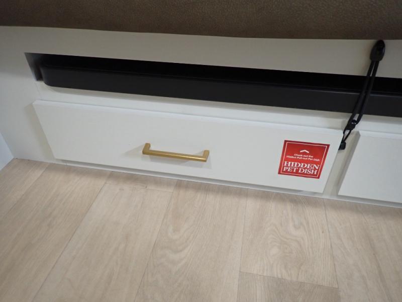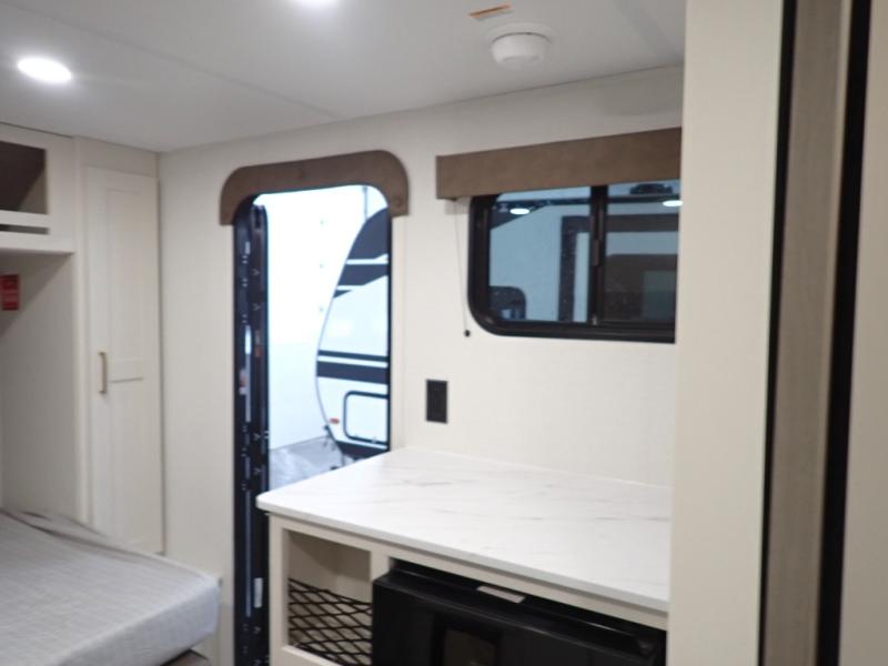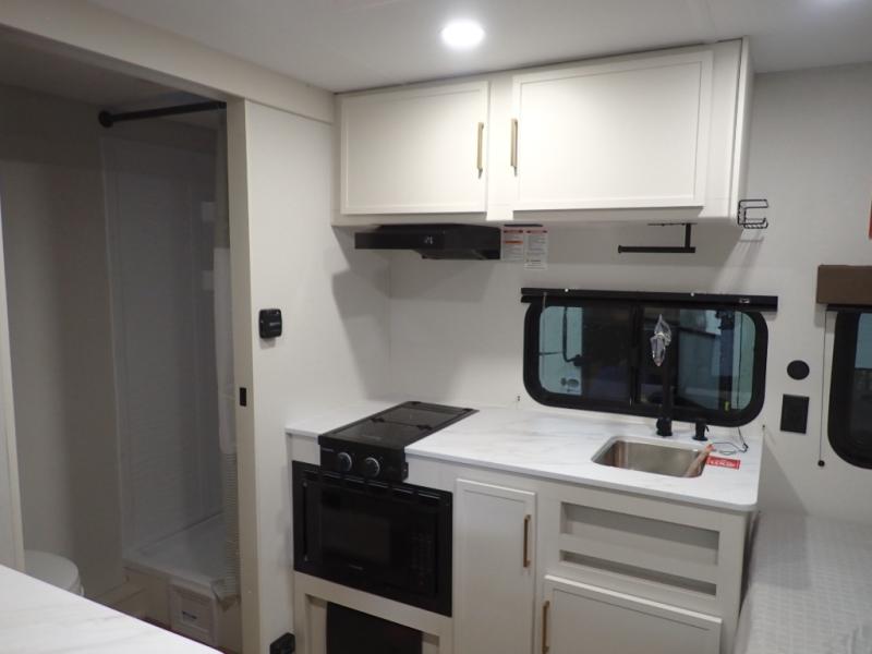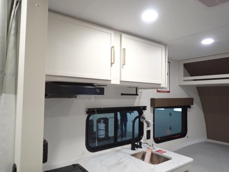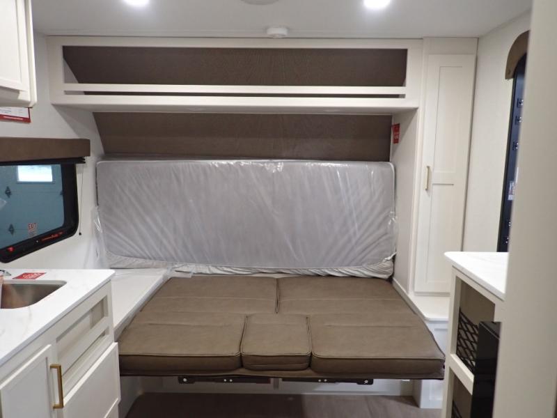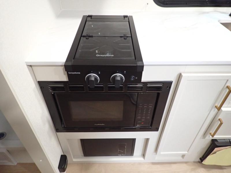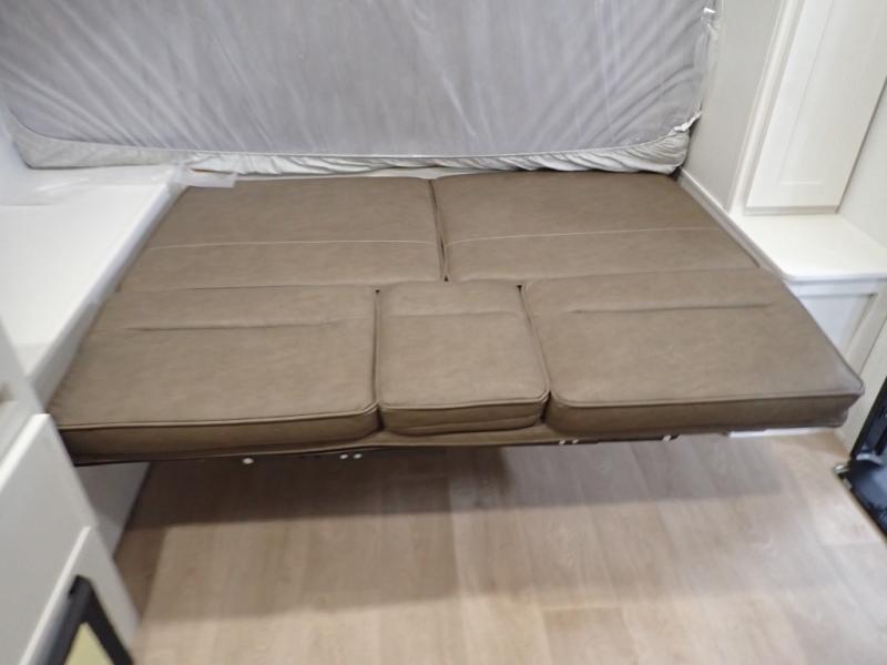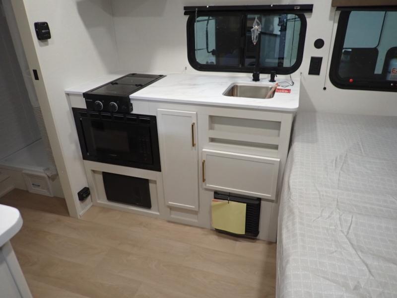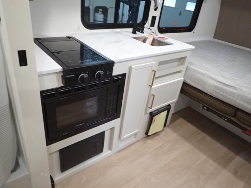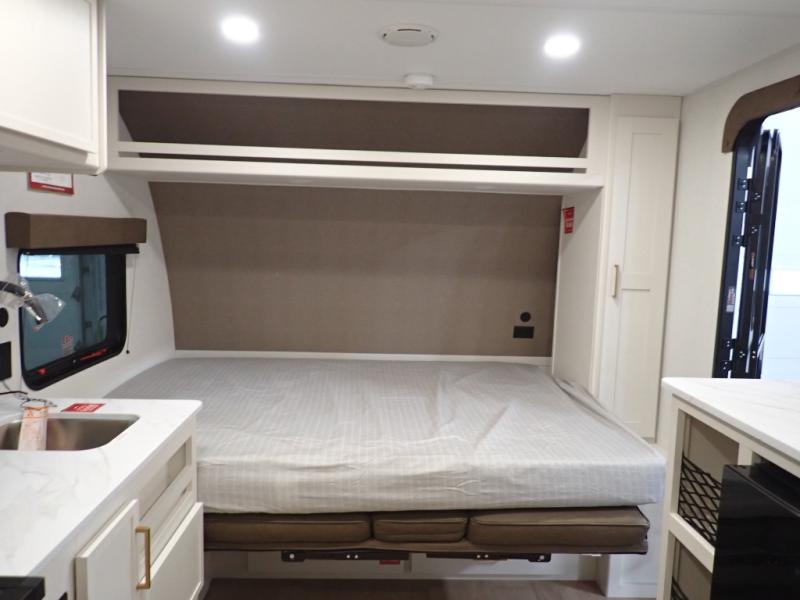 Travel in this 131DL model and step inside through the sturdy aluminum entry steps and you'll be greeted by a versatile 60" x 80" Murphy bed that doubles as a comfortable seating area during the day—perfect for relaxing with your furry companion, thanks to the included pet dish. In the center, the kitchen offers all the essentials for preparing a delicious meal, featuring a microwave, 2-burner range, 3.3 cu. ft. refrigerator, and overhead cabinets for added storage. At the rear, enjoy the convenience of a full bathroom complete with a walk-in shower and foot-flush toilet, making life on the road both comfortable and functional.
