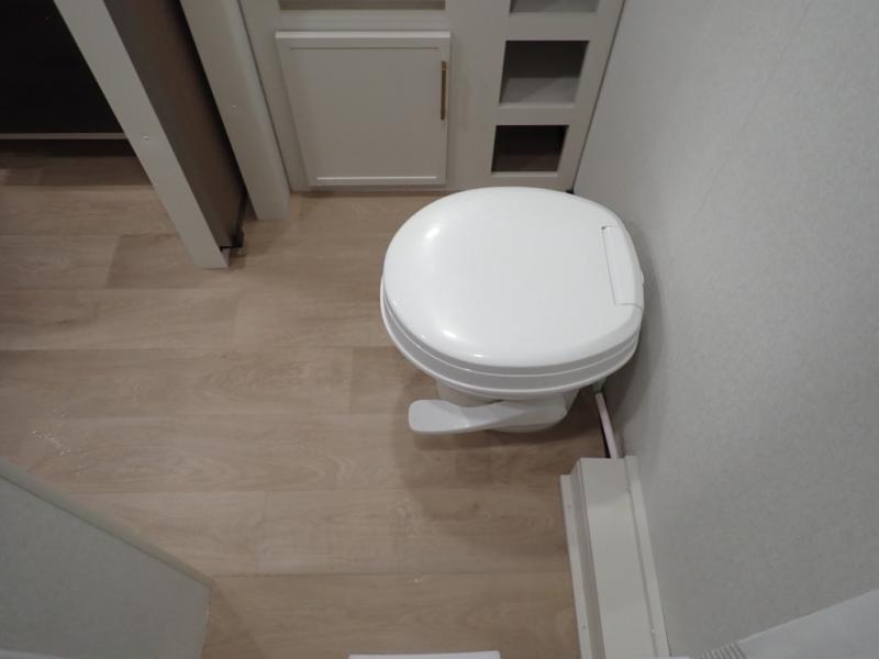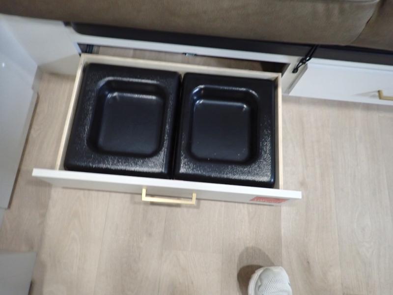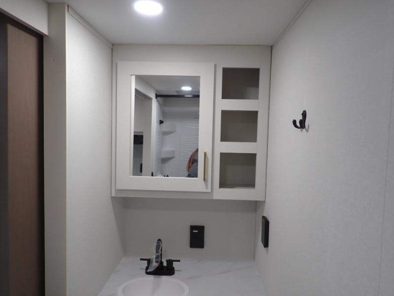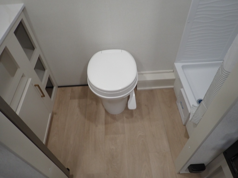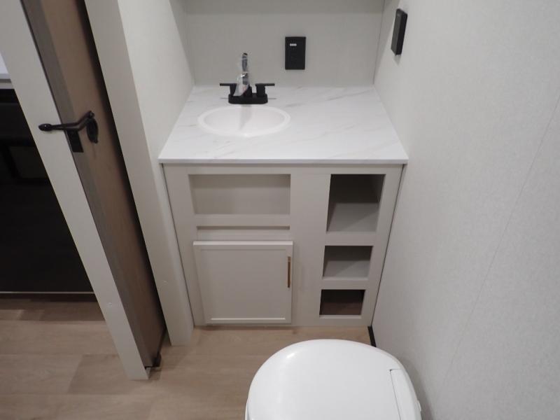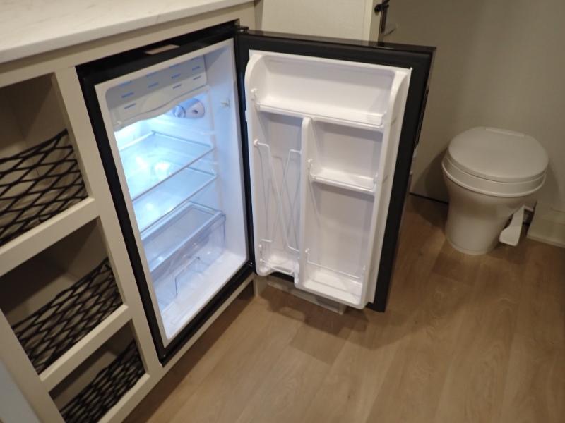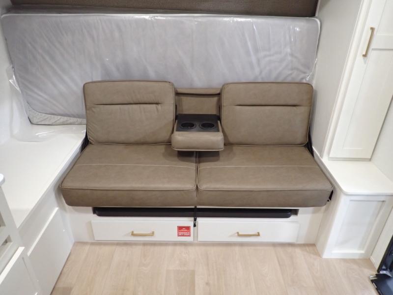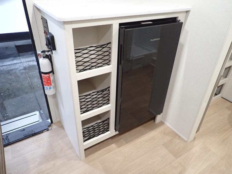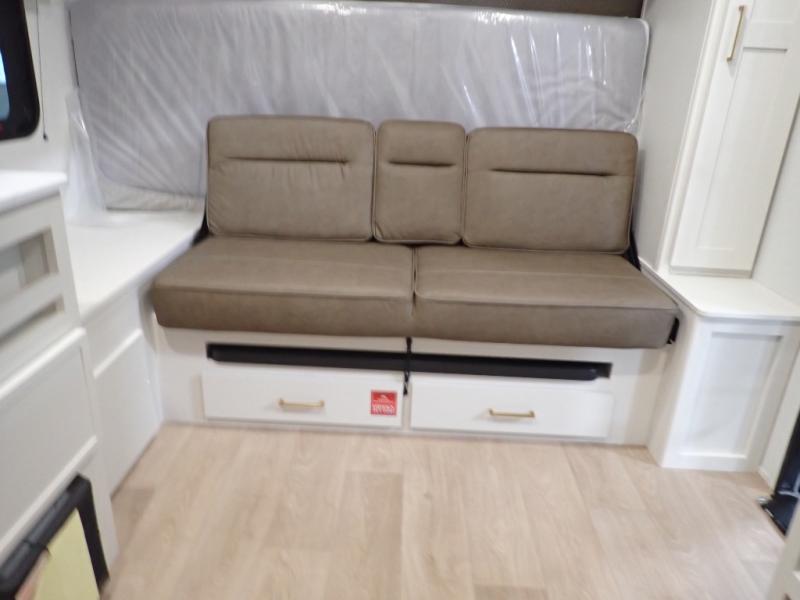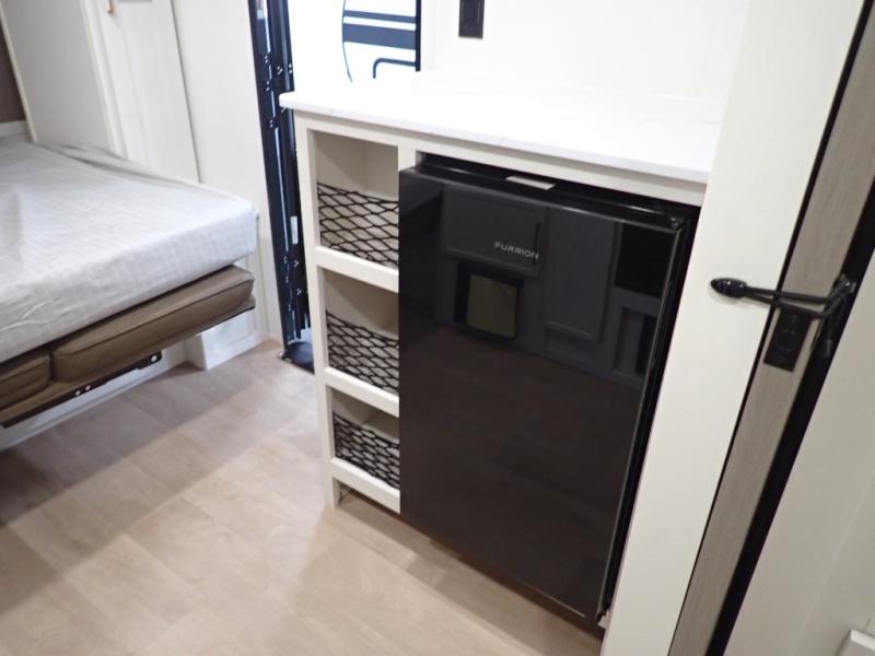 Travel in this 131DL model and step inside through the sturdy aluminum entry steps and you'll be greeted by a versatile 60" x 80" Murphy bed that doubles as a comfortable seating area during the day—perfect for relaxing with your furry companion, thanks to the included pet dish. In the center, the kitchen offers all the essentials for preparing a delicious meal, featuring a microwave, 2-burner range, 3.3 cu. ft. refrigerator, and overhead cabinets for added storage. At the rear, enjoy the convenience of a full bathroom complete with a walk-in shower and foot-flush toilet, making life on the road both comfortable and functional.