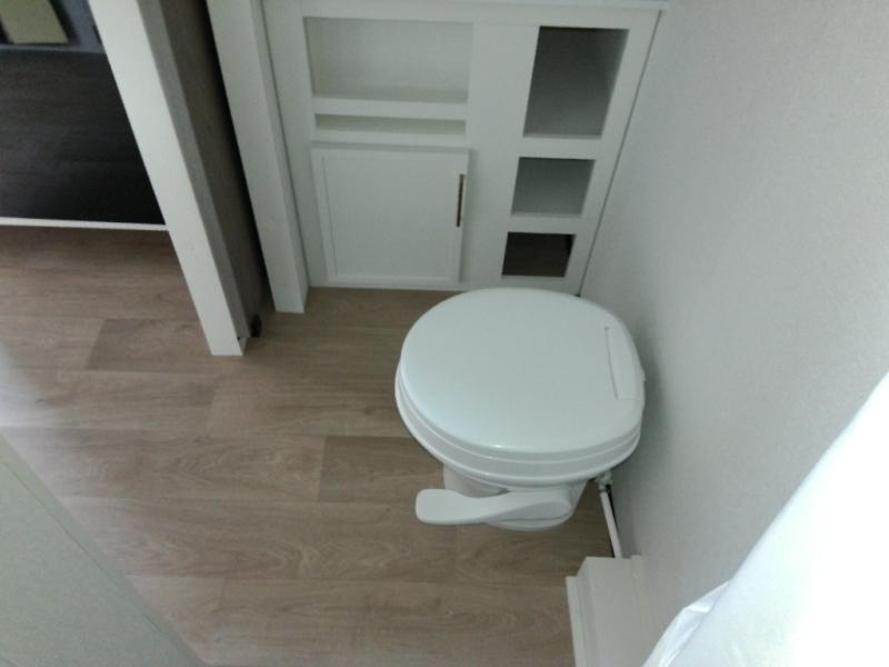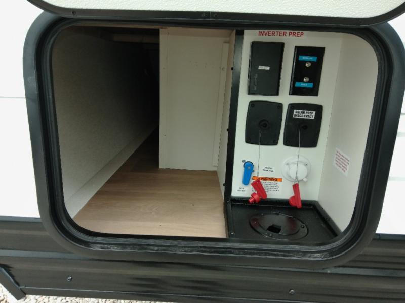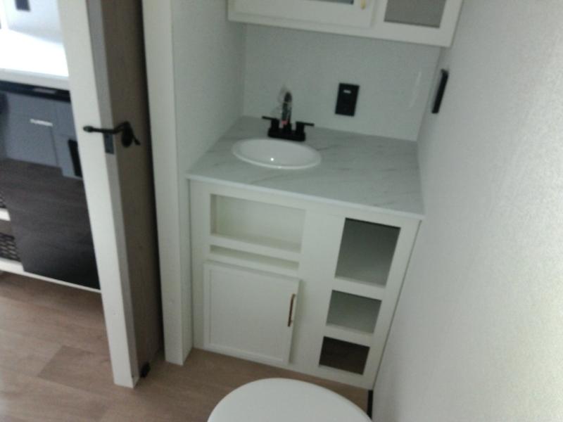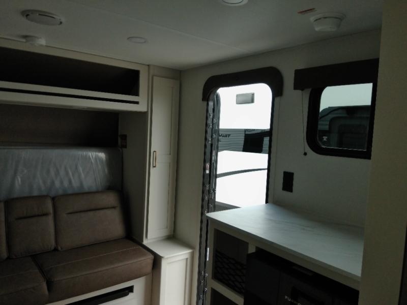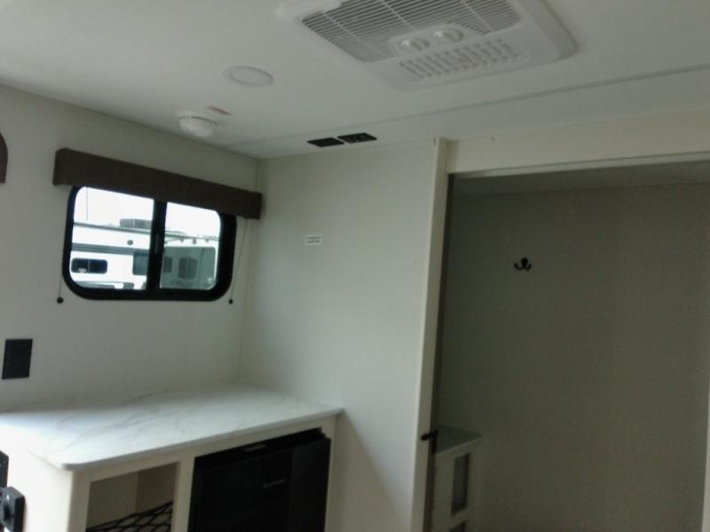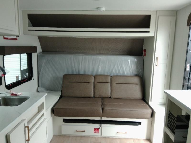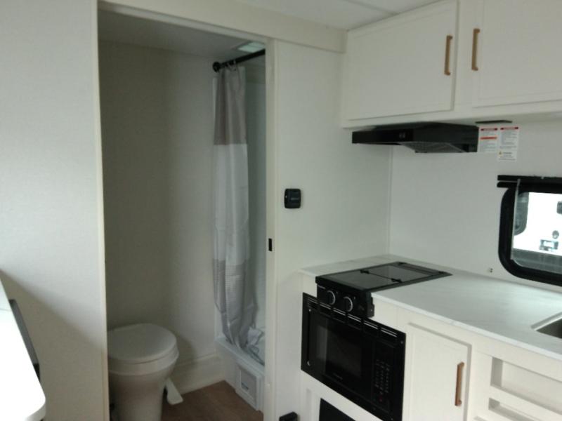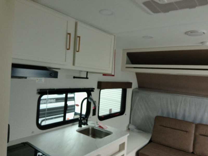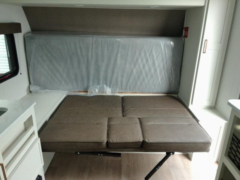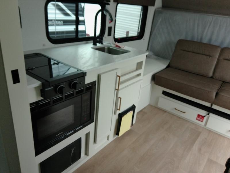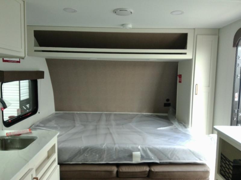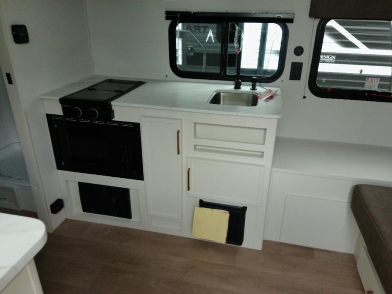 Travel in this 131DL model and step inside through the sturdy aluminum entry steps and you'll be greeted by a versatile 60" x 80" Murphy bed that doubles as a comfortable seating area during the day—perfect for relaxing with your furry companion, thanks to the included pet dish. In the center, the kitchen offers all the essentials for preparing a delicious meal, featuring a microwave, 2-burner range, 3.3 cu. ft. refrigerator, and overhead cabinets for added storage. At the rear, enjoy the convenience of a full bathroom complete with a walk-in shower and foot-flush toilet, making life on the road both comfortable and functional.