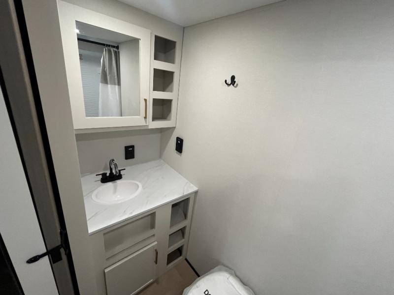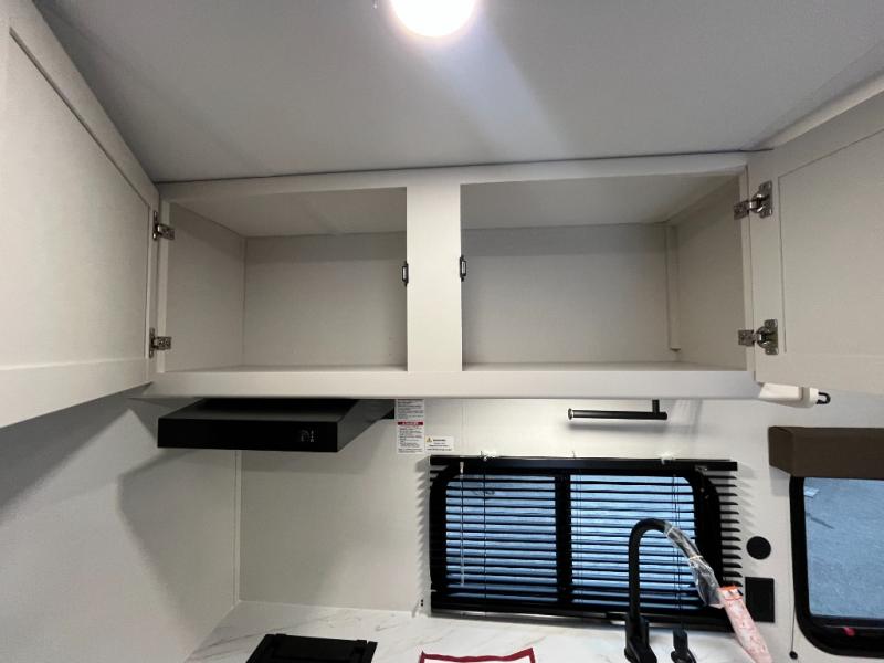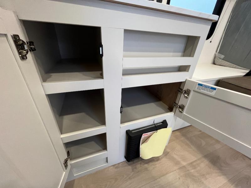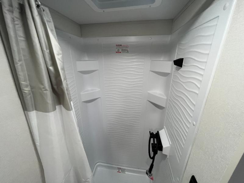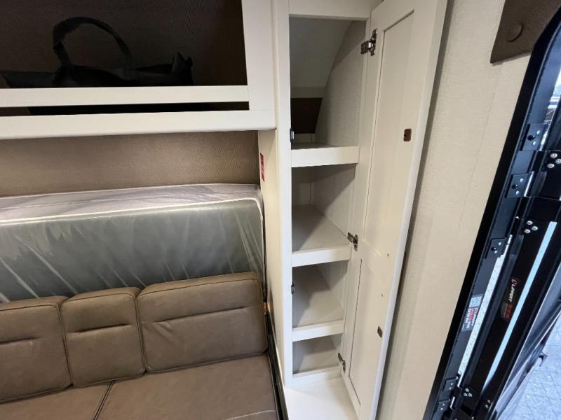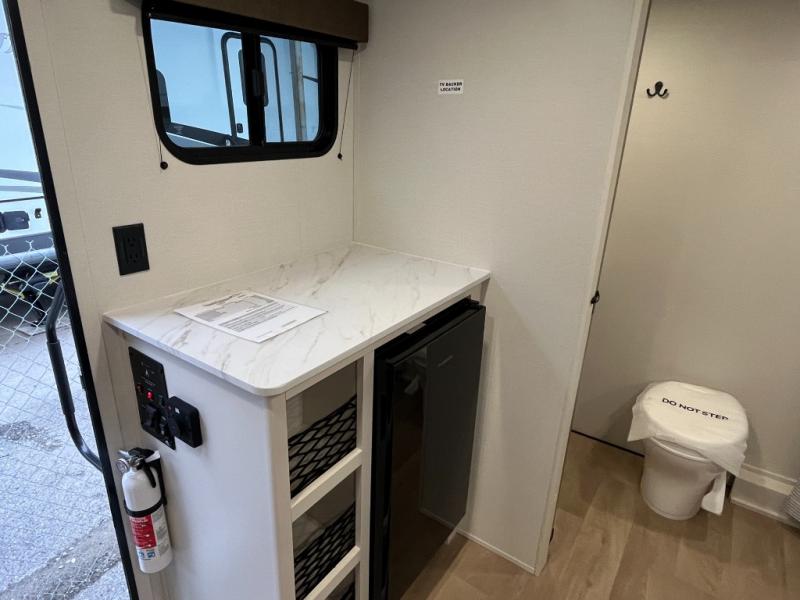 Travel in this 131DL model and step inside through the sturdy aluminum entry steps and you'll be greeted by a versatile 60" x 80" Murphy bed that doubles as a comfortable seating area during the day—perfect for relaxing with your furry companion, thanks to the included pet dish. In the center, the kitchen offers all the essentials for preparing a delicious meal, featuring a microwave, 2-burner range, 3.3 cu. ft. refrigerator, and overhead cabinets for added storage. At the rear, enjoy the convenience of a full bathroom complete with a walk-in shower and foot-flush toilet, making life on the road both comfortable and functional.