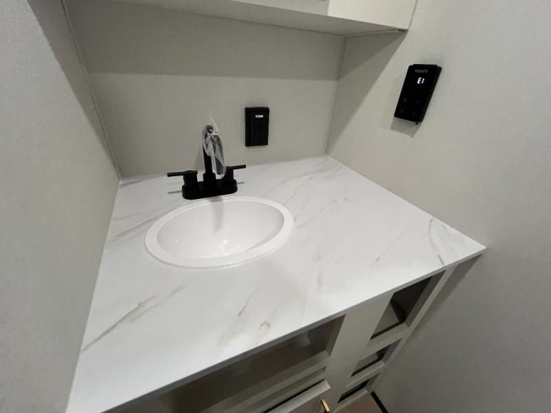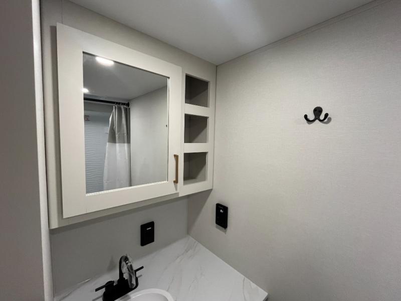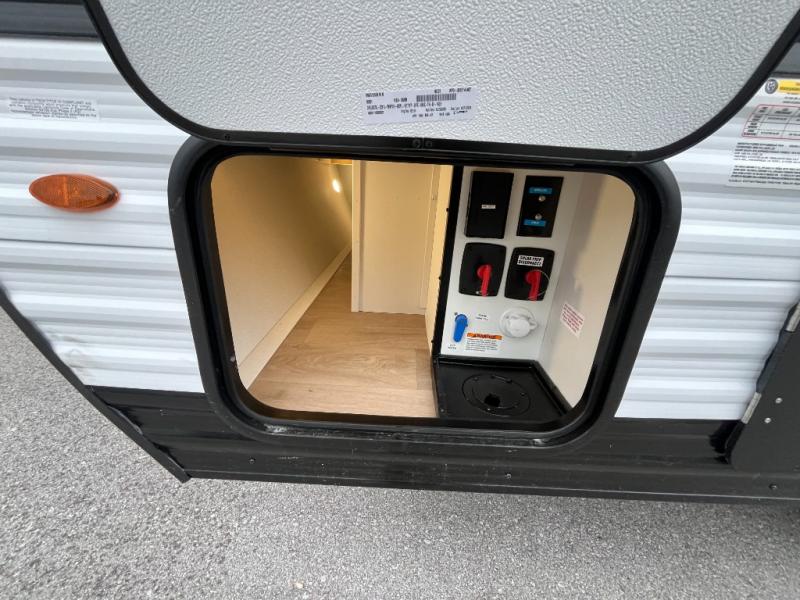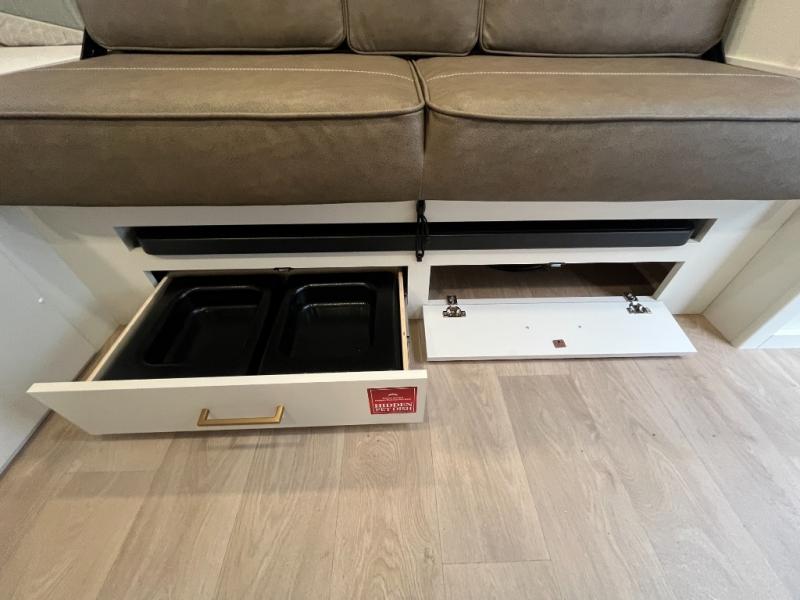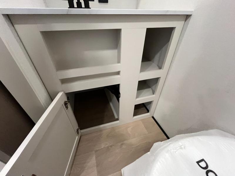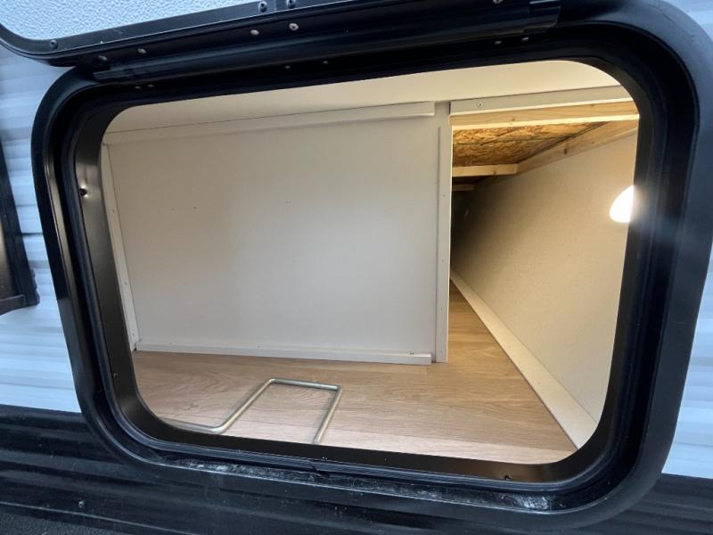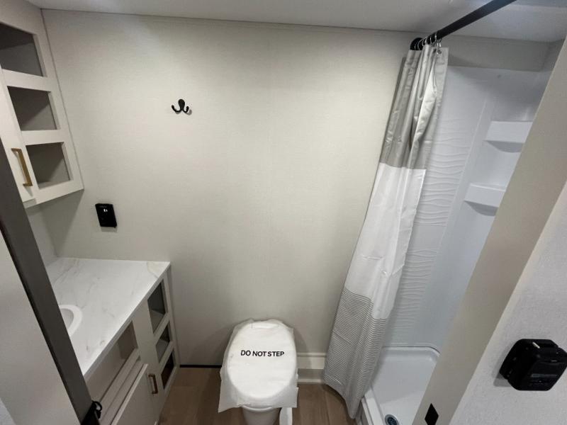 Travel in this 131DL model and step inside through the sturdy aluminum entry steps and you'll be greeted by a versatile 60" x 80" Murphy bed that doubles as a comfortable seating area during the day—perfect for relaxing with your furry companion, thanks to the included pet dish. In the center, the kitchen offers all the essentials for preparing a delicious meal, featuring a microwave, 2-burner range, 3.3 cu. ft. refrigerator, and overhead cabinets for added storage. At the rear, enjoy the convenience of a full bathroom complete with a walk-in shower and foot-flush toilet, making life on the road both comfortable and functional.