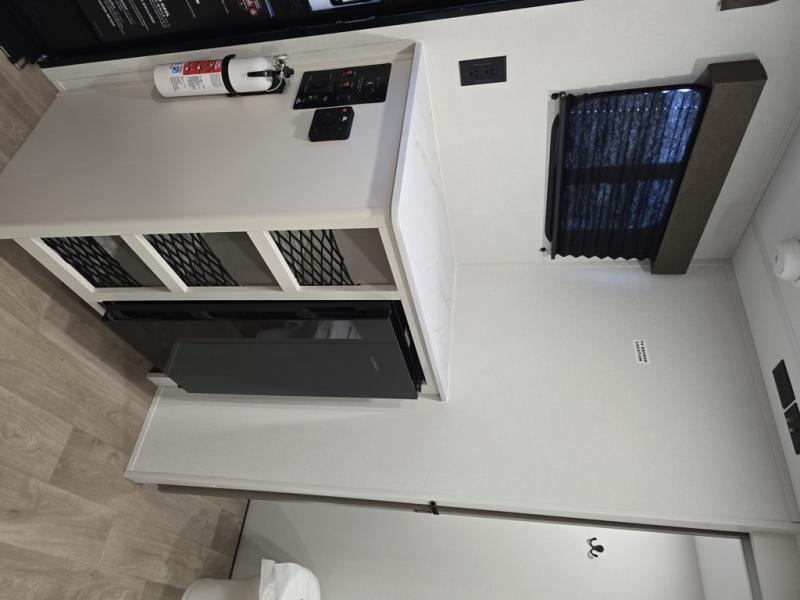 Travel in this 131DL model and step inside through the sturdy aluminum entry steps and you'll be greeted by a versatile 60" x 80" Murphy bed that doubles as a comfortable seating area during the day—perfect for relaxing with your furry companion, thanks to the included pet dish. In the center, the kitchen offers all the essentials for preparing a delicious meal, featuring a microwave, 2-burner range, 3.3 cu. ft. refrigerator, and overhead cabinets for added storage. At the rear, enjoy the convenience of a full bathroom complete with a walk-in shower and foot-flush toilet, making life on the road both comfortable and functional.
