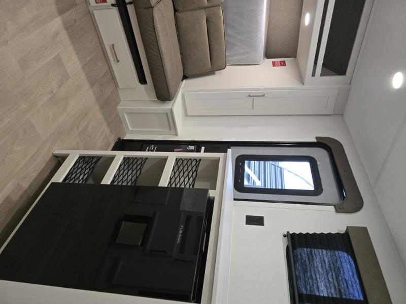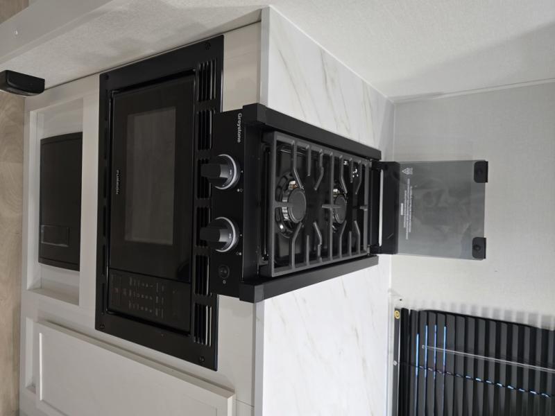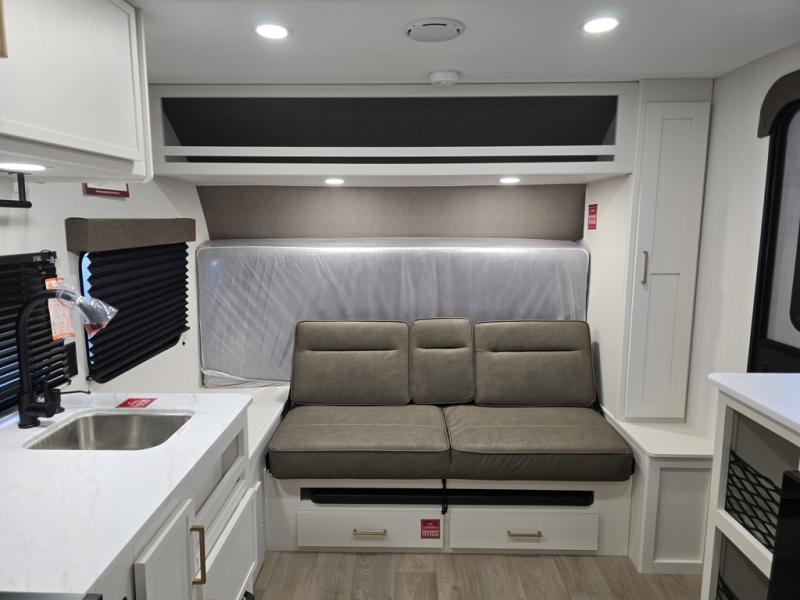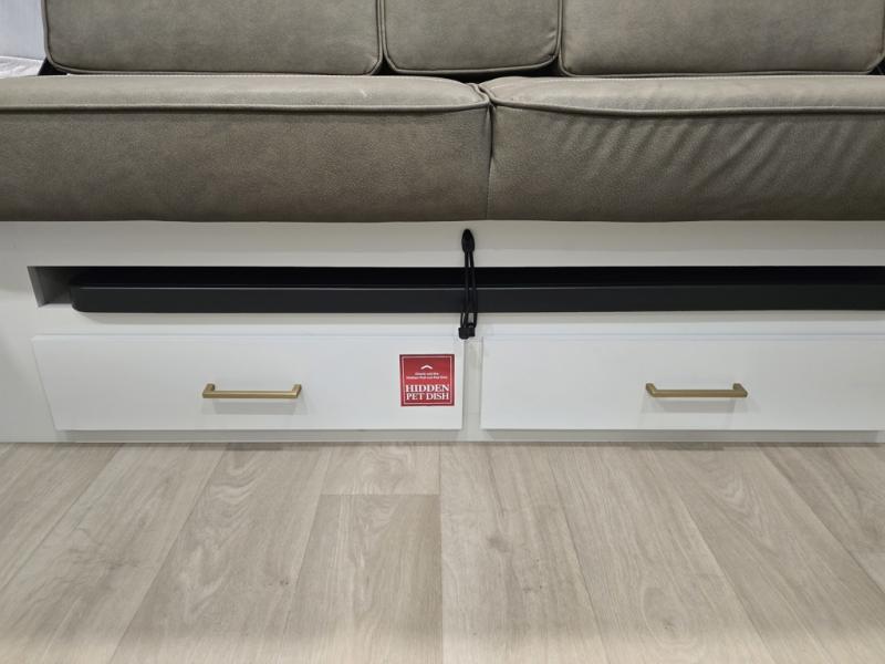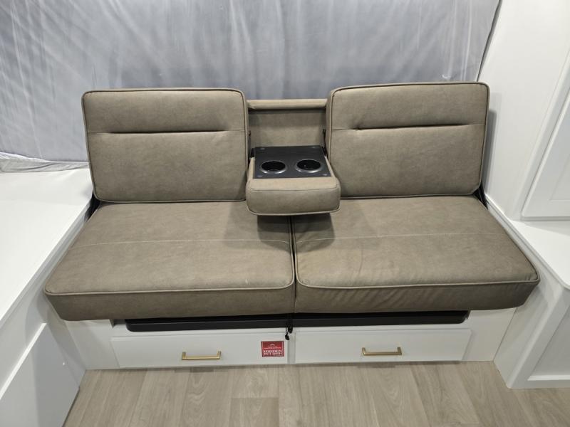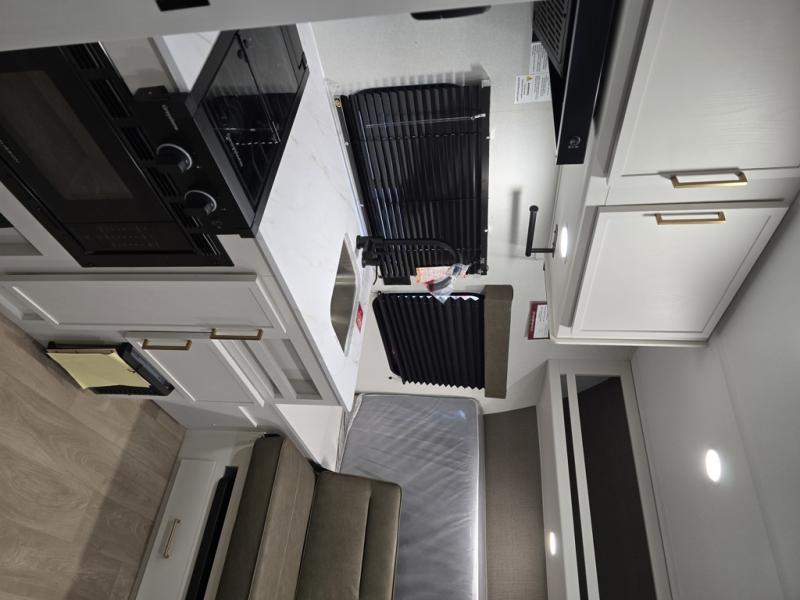 Travel in this 131DL model and step inside through the sturdy aluminum entry steps and you'll be greeted by a versatile 60" x 80" Murphy bed that doubles as a comfortable seating area during the day—perfect for relaxing with your furry companion, thanks to the included pet dish. In the center, the kitchen offers all the essentials for preparing a delicious meal, featuring a microwave, 2-burner range, 3.3 cu. ft. refrigerator, and overhead cabinets for added storage. At the rear, enjoy the convenience of a full bathroom complete with a walk-in shower and foot-flush toilet, making life on the road both comfortable and functional.