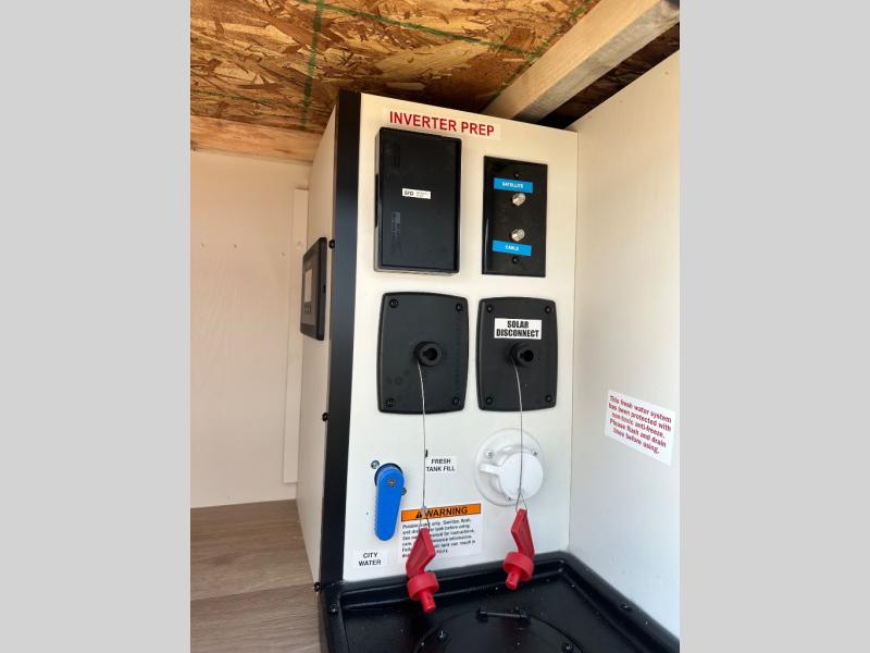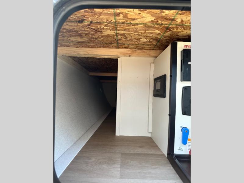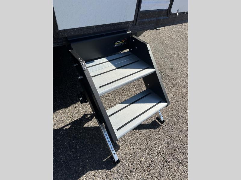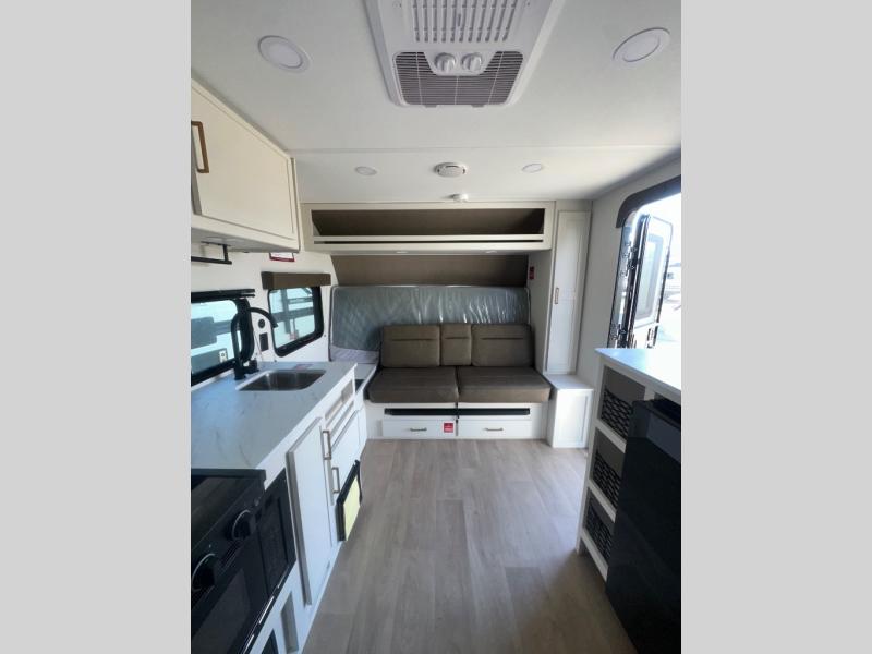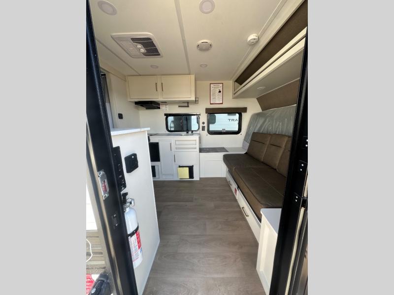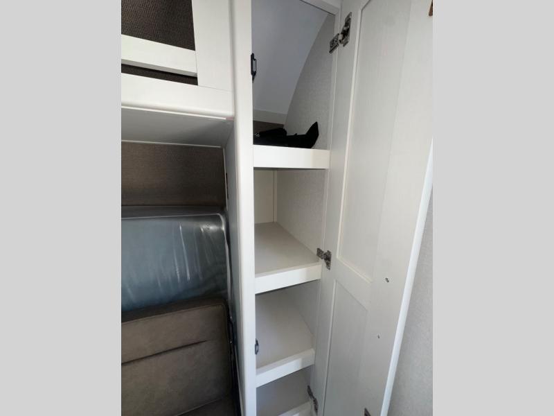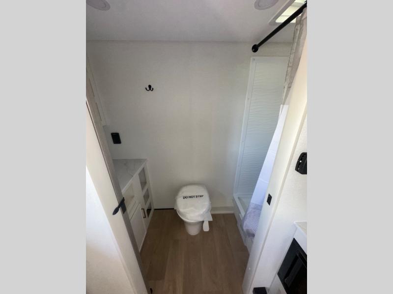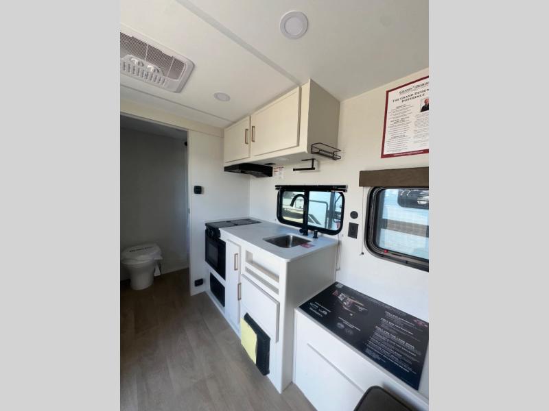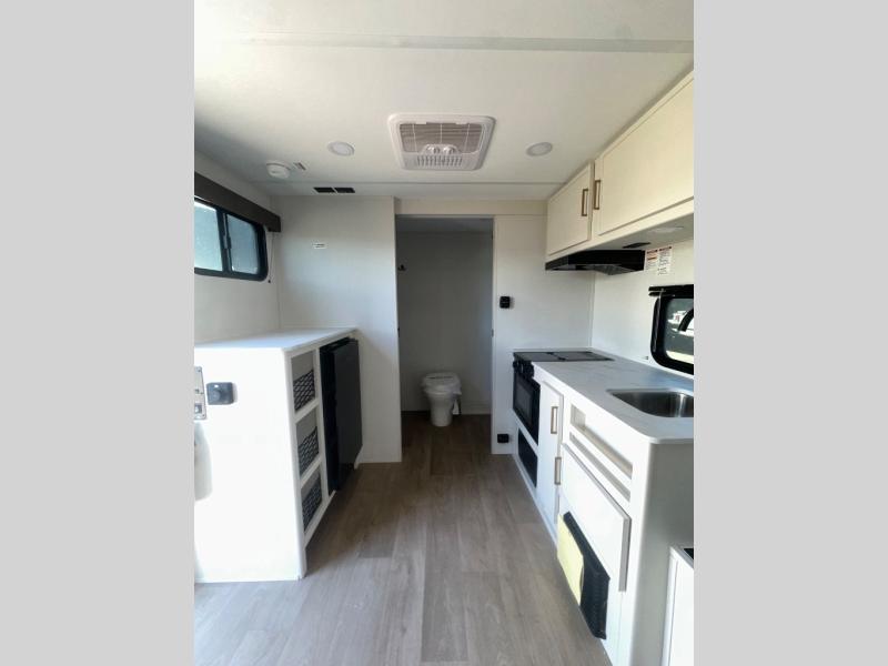 Travel in this 131DL model and step inside through the sturdy aluminum entry steps and you'll be greeted by a versatile 60" x 80" Murphy bed that doubles as a comfortable seating area during the day—perfect for relaxing with your furry companion, thanks to the included pet dish. In the center, the kitchen offers all the essentials for preparing a delicious meal, featuring a microwave, 2-burner range, 3.3 cu. ft. refrigerator, and overhead cabinets for added storage. At the rear, enjoy the convenience of a full bathroom complete with a walk-in shower and foot-flush toilet, making life on the road both comfortable and functional.