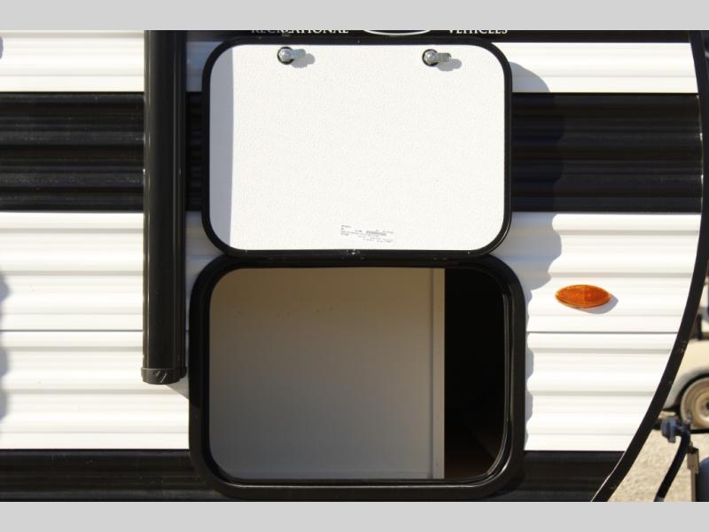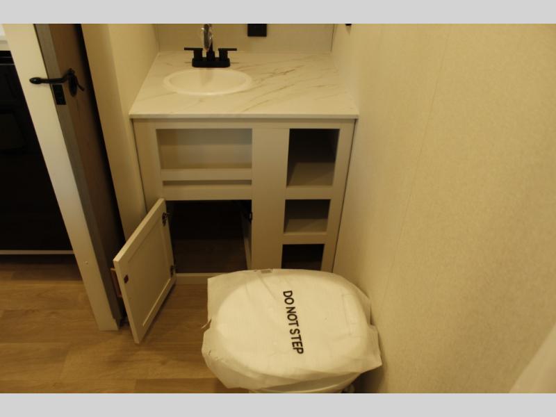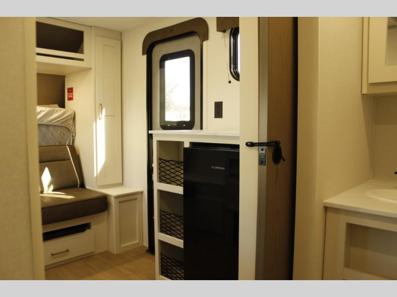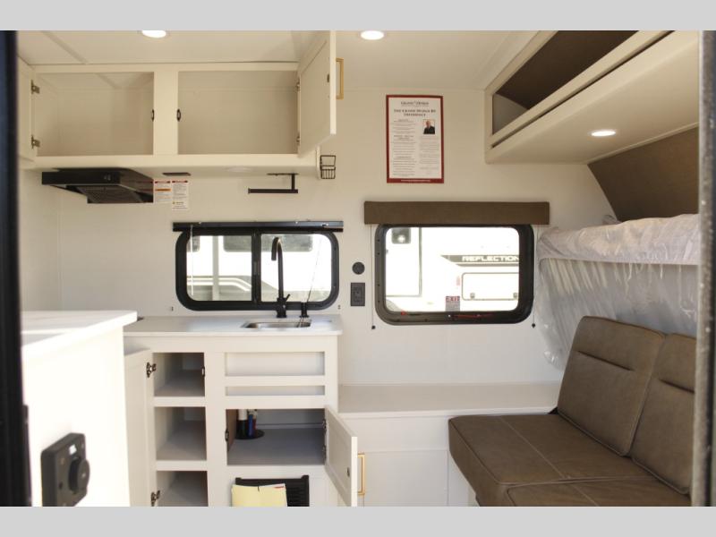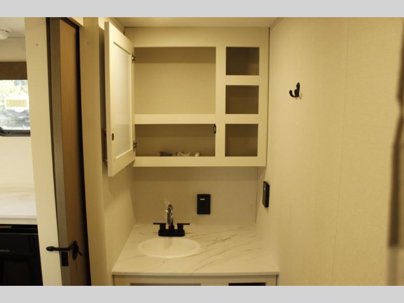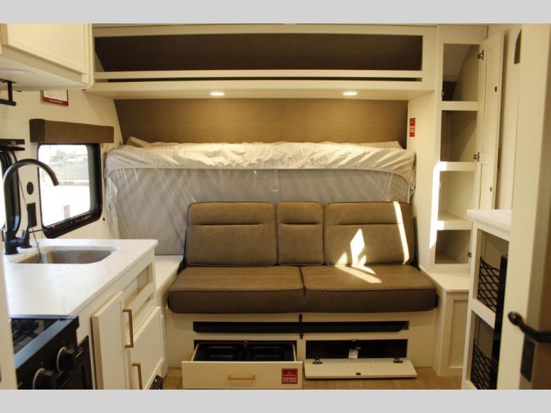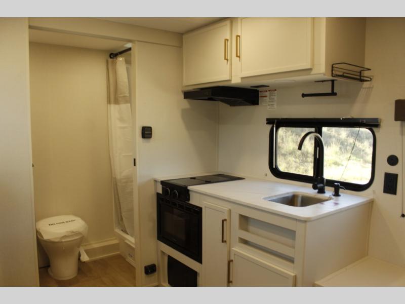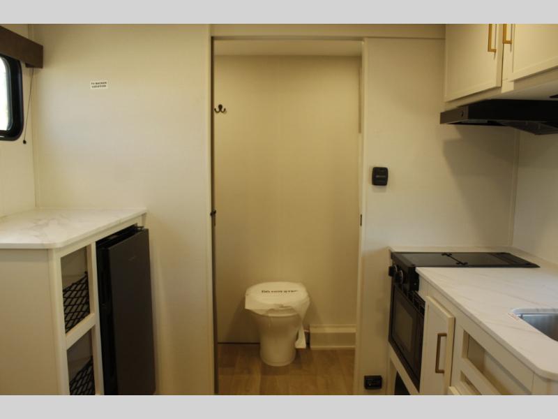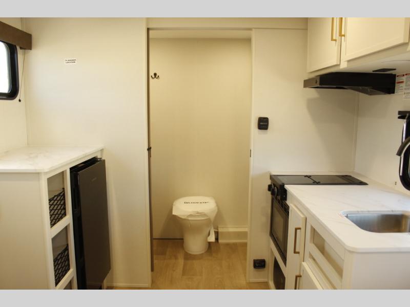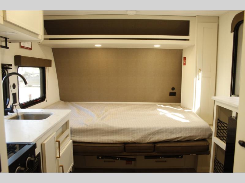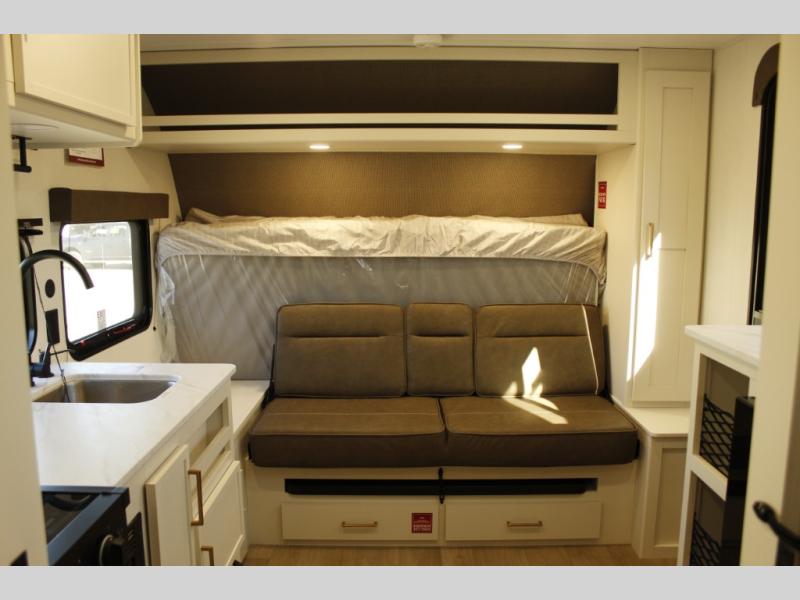 Travel in this 131DL model and step inside through the sturdy aluminum entry steps and you'll be greeted by a versatile 60" x 80" Murphy bed that doubles as a comfortable seating area during the day—perfect for relaxing with your furry companion, thanks to the included pet dish. In the center, the kitchen offers all the essentials for preparing a delicious meal, featuring a microwave, 2-burner range, 3.3 cu. ft. refrigerator, and overhead cabinets for added storage. At the rear, enjoy the convenience of a full bathroom complete with a walk-in shower and foot-flush toilet, making life on the road both comfortable and functional.