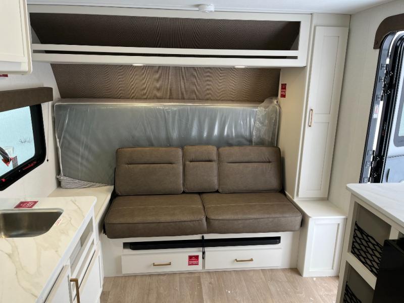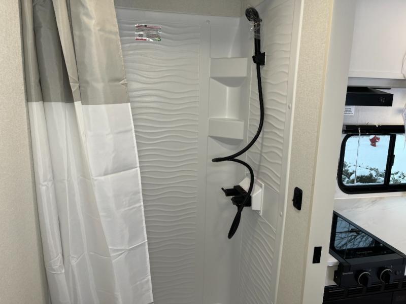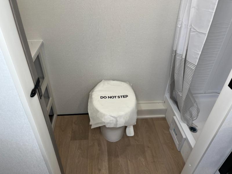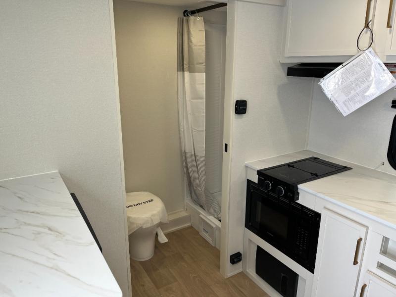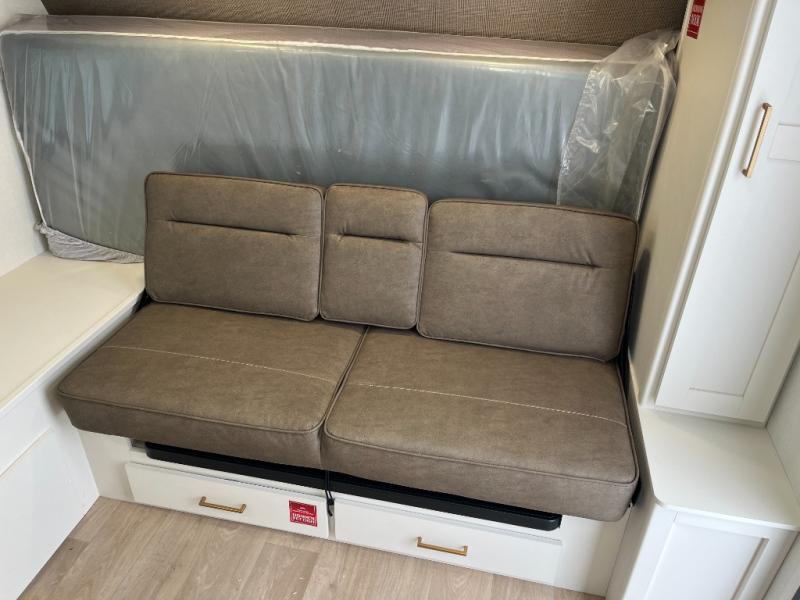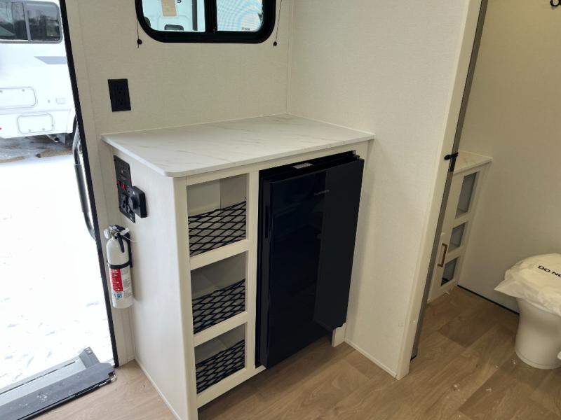 Travel in this 131DL model and step inside through the sturdy aluminum entry steps and you'll be greeted by a versatile 60" x 80" Murphy bed that doubles as a comfortable seating area during the day—perfect for relaxing with your furry companion, thanks to the included pet dish. In the center, the kitchen offers all the essentials for preparing a delicious meal, featuring a microwave, 2-burner range, 3.3 cu. ft. refrigerator, and overhead cabinets for added storage. At the rear, enjoy the convenience of a full bathroom complete with a walk-in shower and foot-flush toilet, making life on the road both comfortable and functional.
