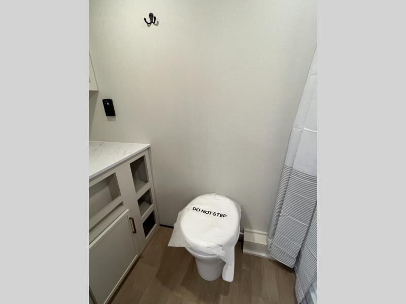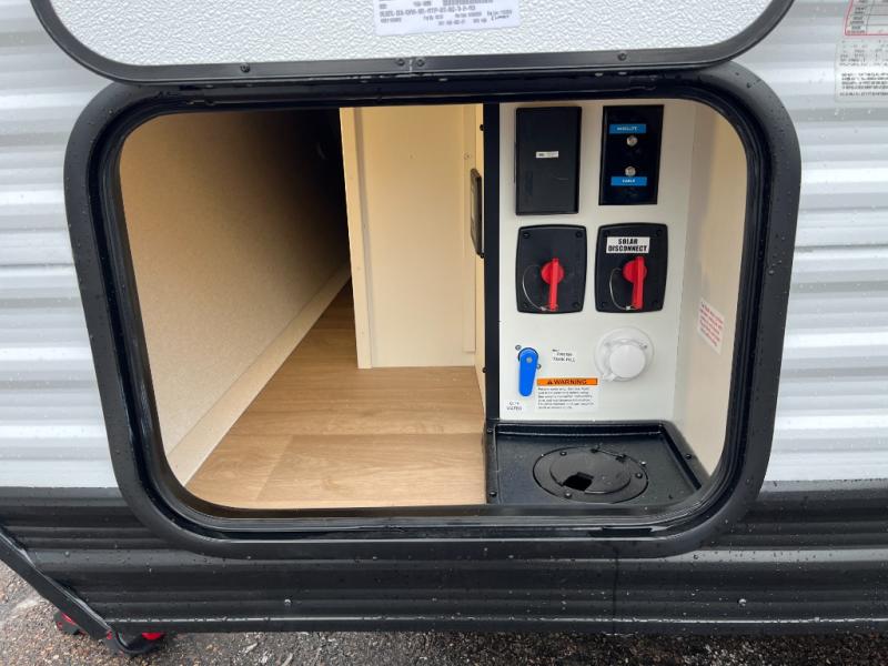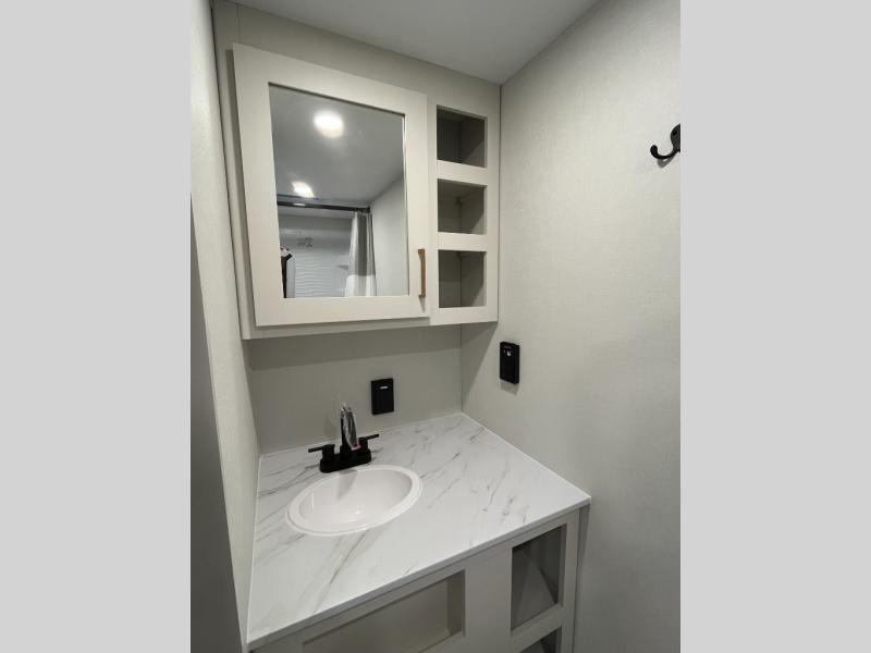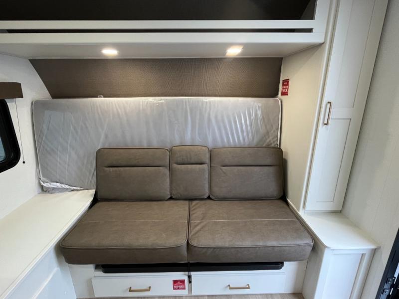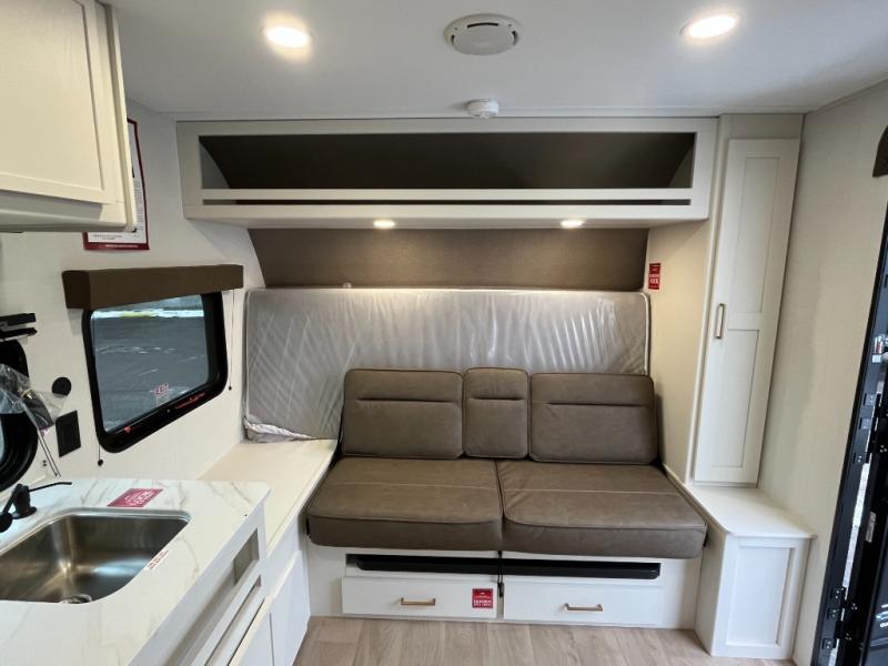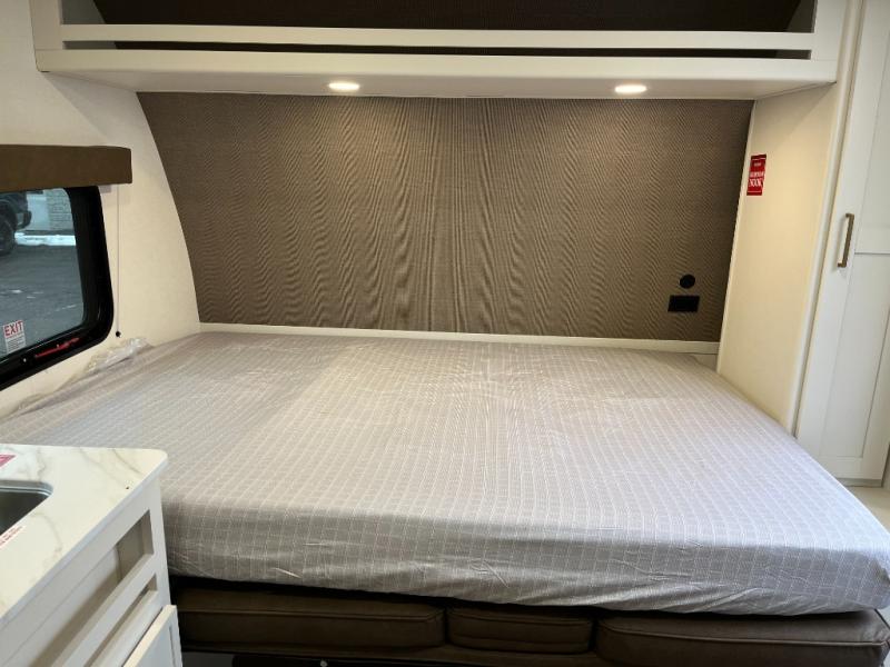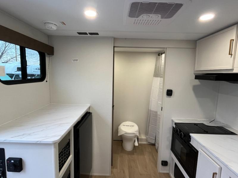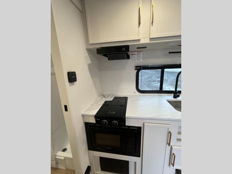 Travel in this 131DL model and step inside through the sturdy aluminum entry steps and you'll be greeted by a versatile 60" x 80" Murphy bed that doubles as a comfortable seating area during the day—perfect for relaxing with your furry companion, thanks to the included pet dish. In the center, the kitchen offers all the essentials for preparing a delicious meal, featuring a microwave, 2-burner range, 3.3 cu. ft. refrigerator, and overhead cabinets for added storage. At the rear, enjoy the convenience of a full bathroom complete with a walk-in shower and foot-flush toilet, making life on the road both comfortable and functional.
