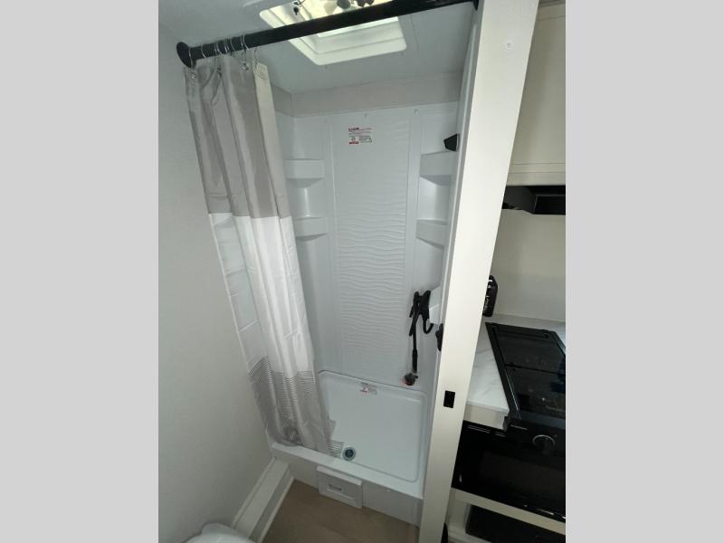 Travel in this 131DL model and step inside through the sturdy aluminum entry steps and you'll be greeted by a versatile 60" x 80" Murphy bed that doubles as a comfortable seating area during the day—perfect for relaxing with your furry companion, thanks to the included pet dish. In the center, the kitchen offers all the essentials for preparing a delicious meal, featuring a microwave, 2-burner range, 3.3 cu. ft. refrigerator, and overhead cabinets for added storage. At the rear, enjoy the convenience of a full bathroom complete with a walk-in shower and foot-flush toilet, making life on the road both comfortable and functional.